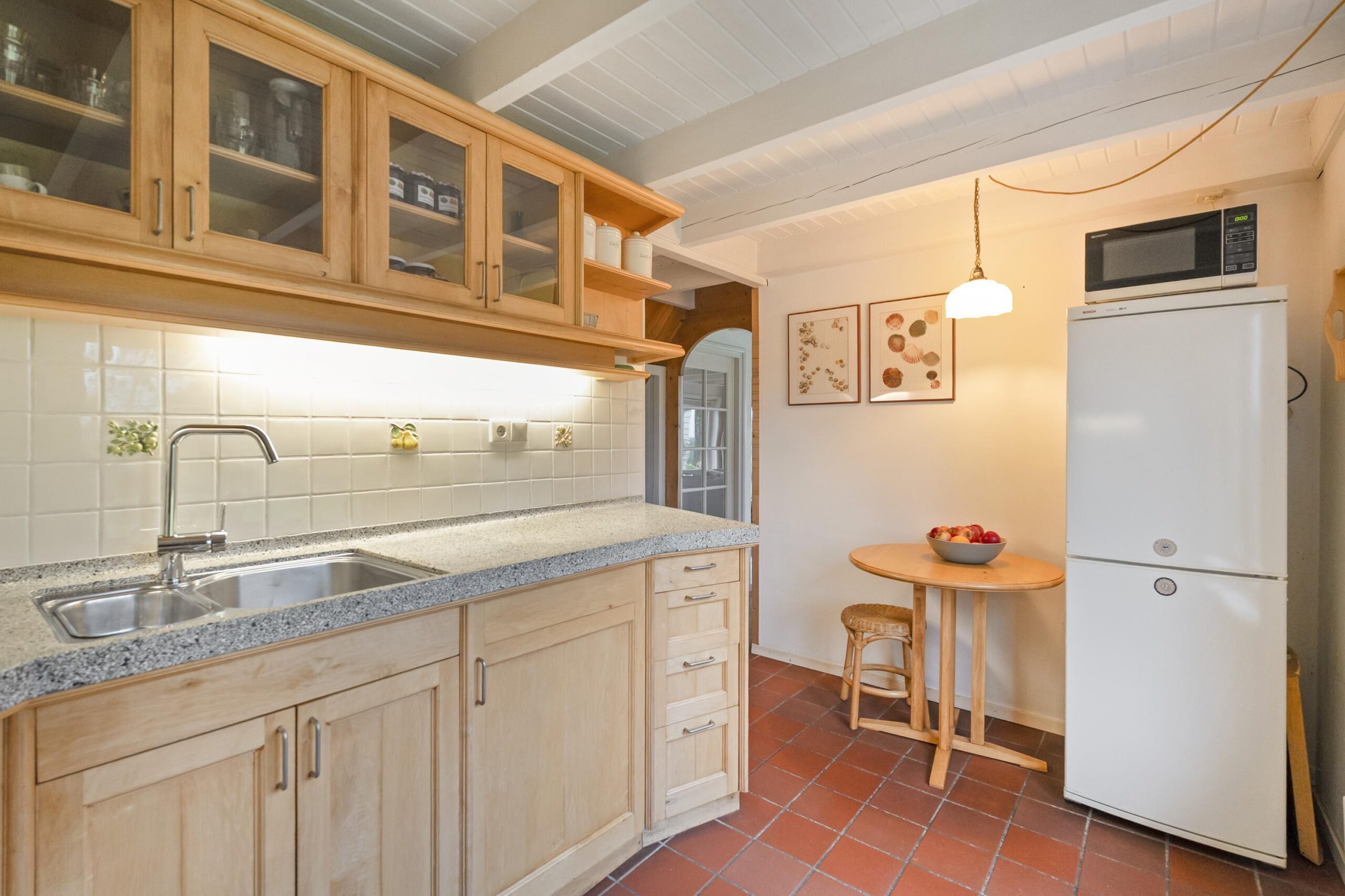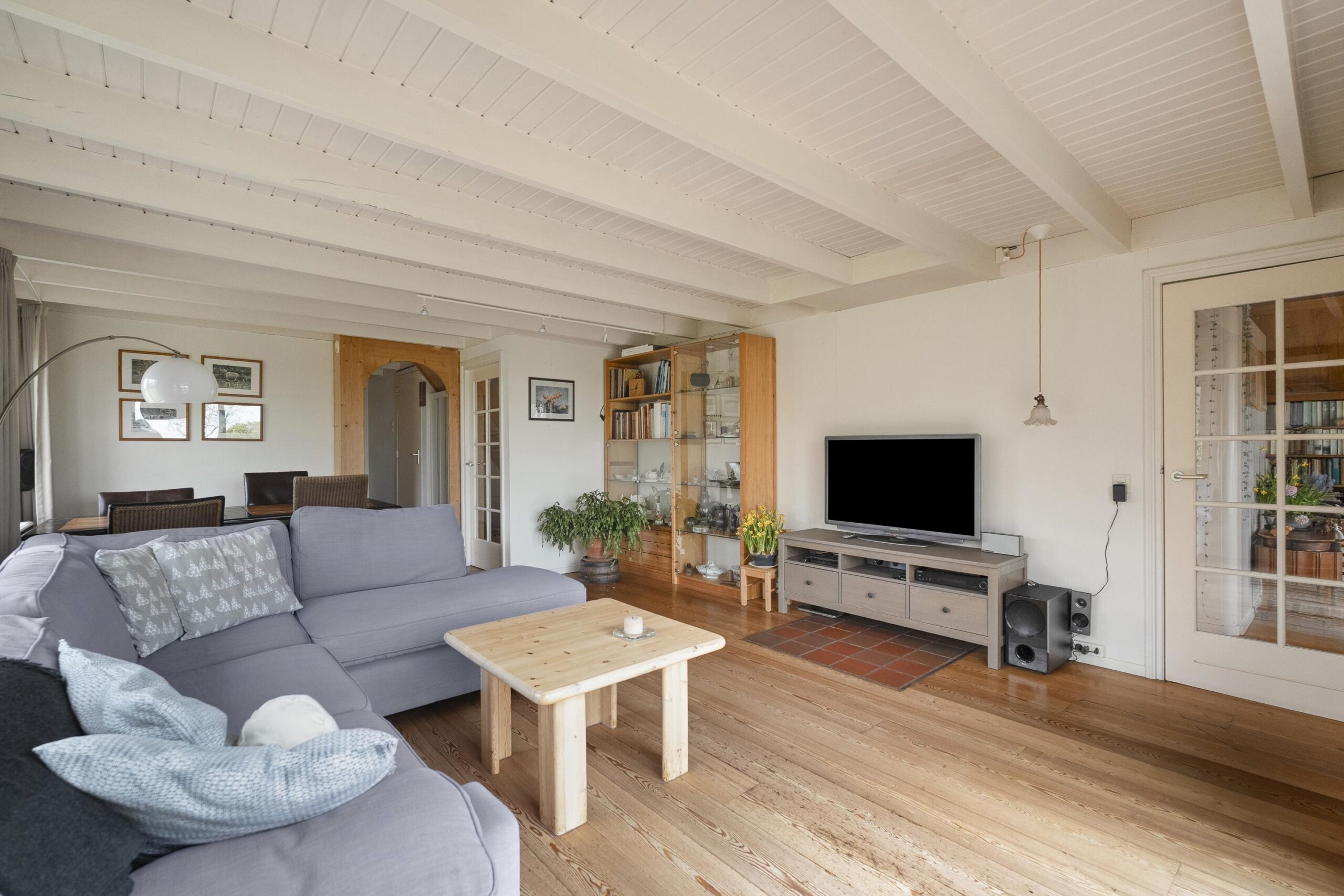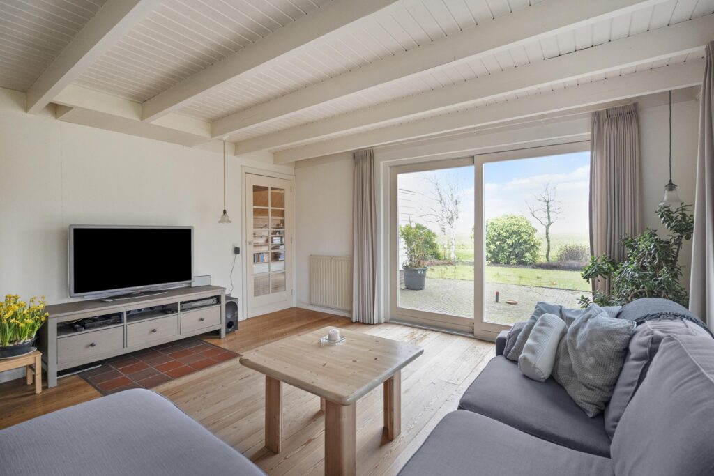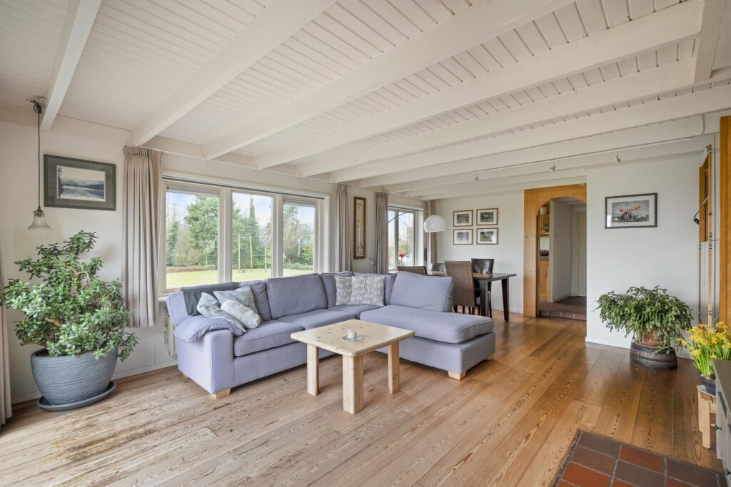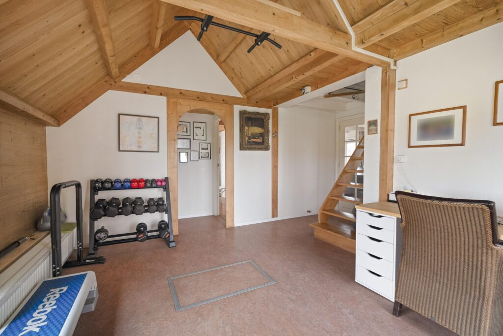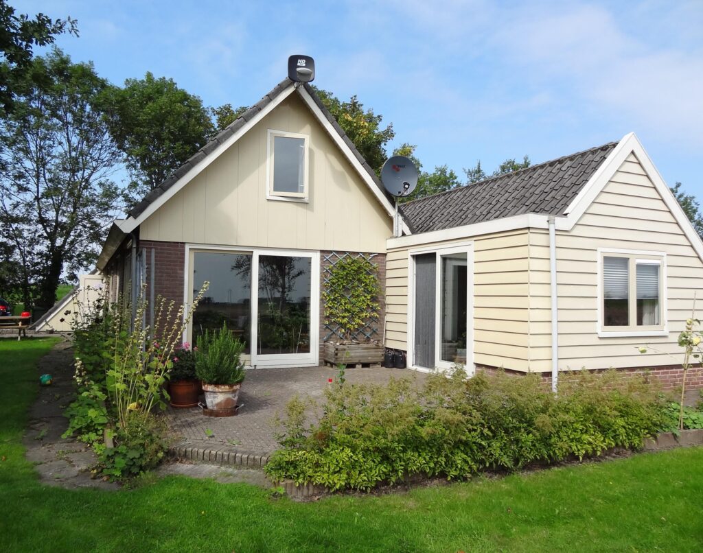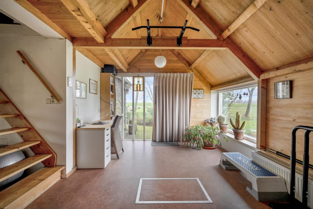 Entree aan de voorzijde in het oude voorhuis met een tweetal bijkeukens met o.a. de CV-opstelling, witgoedaansluitingen en veel bergruimte. Van hieruit loopt u door een tussenhal naar de keuken en badkamer welke ook nog in het oude voorhuis liggen. De badkamer is voorzien van een douche, wastafel en designradiator. De keuken is in landelijke stijl uitgevoerd met een robuust granito werkblad en is uitgerst met diverse inbouwapparatuur. De ruime woonkamer heeft veel natuurlijk licht door de grote raampartijen en schuifpui aan de tuinzijde en is voorzien van een Russisch Larikshouten vloer. In de aanbouw ligt aan de voorzijde een ruime hal met o.a. toilet en de trapopgang naar boven. Deze hal is zo ruim, dat deze op dit moment in gebruik is als sport- en werkruimte. In deze hal is ook een buitendeur, welke als voordeur gebruikt wordt. In deze aanbouw zijn ook een tweetal slaapkamers op de begane grond te vinden. De aanbouw kenmerkt zich door het vele gebruik van hout en een open kapconstructie met traditionele bouwkenmerken. Alles past qua stijl mooi bij elkaar, zowel het oude huis als de aanbouw. Vanuit de achterste kamer (welke als werk- en/of slaapkamer kan worden benut) en de woonkamer heeft u mooi zicht op de tuin, maar ook op de landerijen eromheen en kijkt u over een groot deel van de Oostpolder.