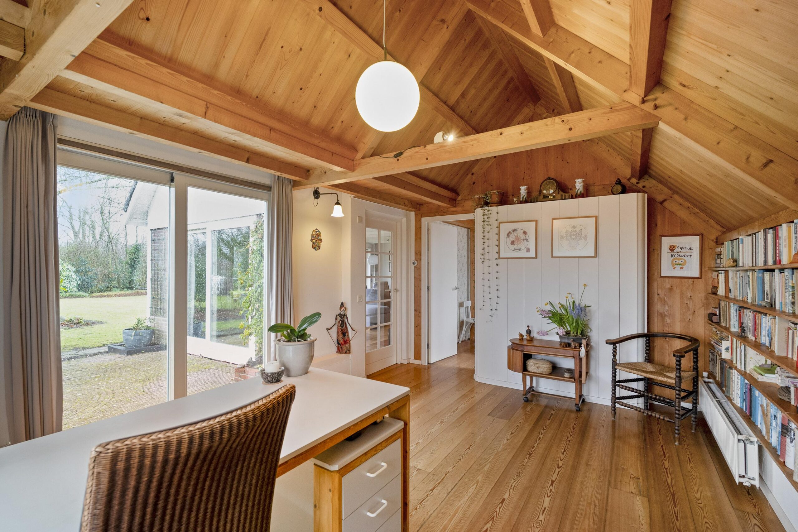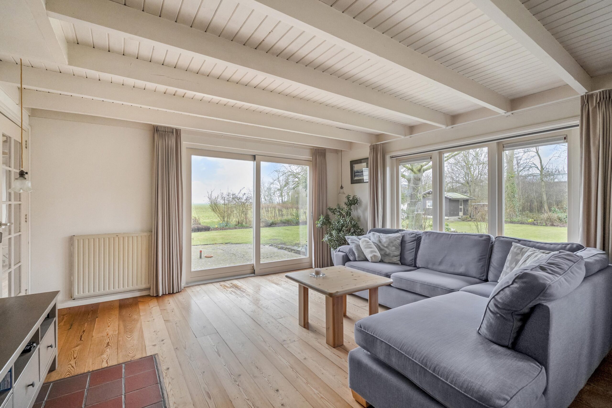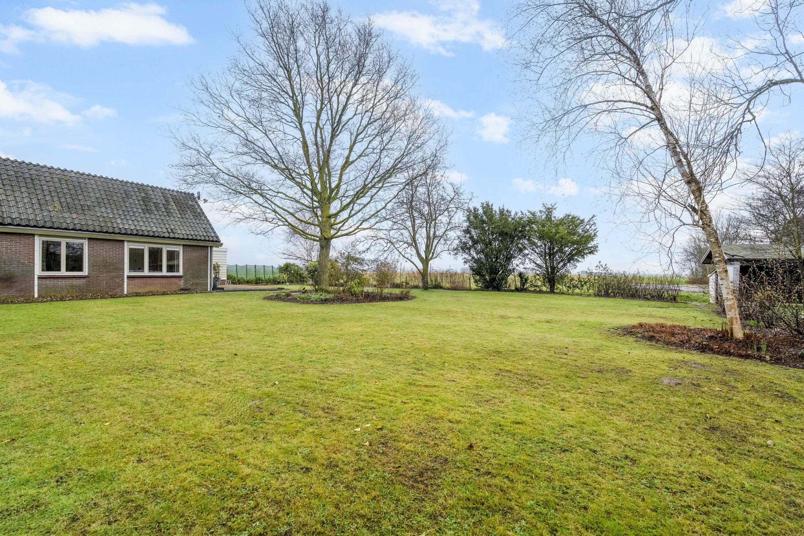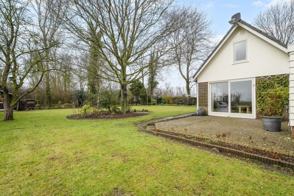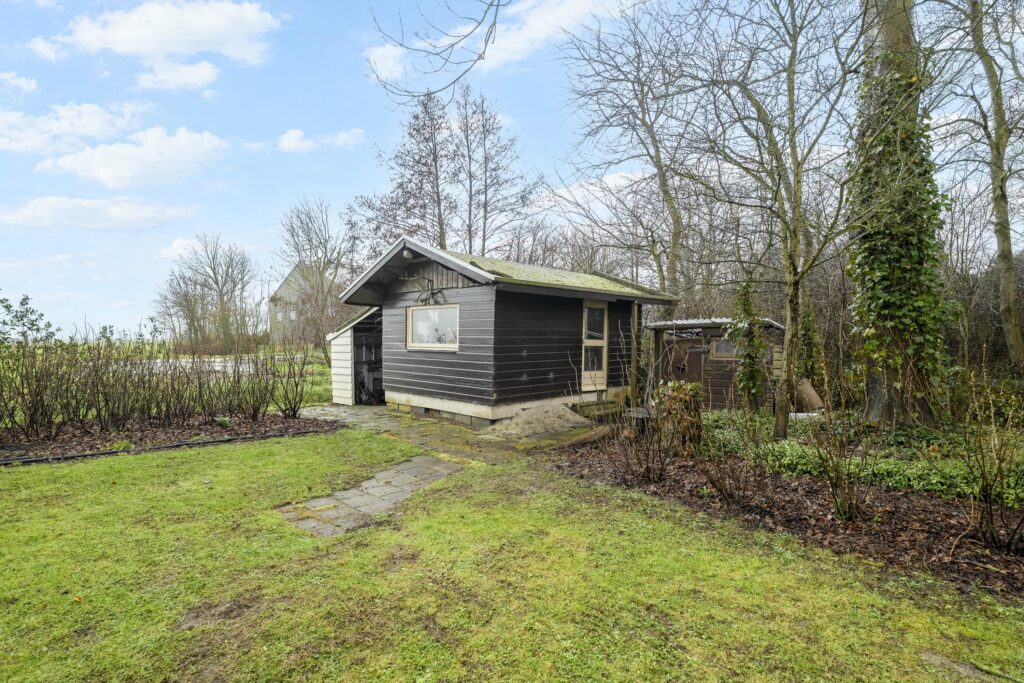 De tuin rondom is goed verzorgd en fraai aangelegd met een groot grasveld, diverse bomen en andere beplanting. Hier is in de afgelopen jaren veel zorg aan besteedt en kleurt mooi door de seizoenen heen. Bekijk vooral de sfeerfoto's die gedurende het hele jaar gemaakt zijn. Aan de voorzijde is meer dan voldoende ruimte om met meerdere auto's te parkeren. Voor opslag van (tuin)gereedschappen is nog een houten tuinhuisje/schuurtje met aanbouw van totaal zo'n 11 m². Aan de overzijde van het perceel loopt u zo naar het Oude Veer, met inham vanwaar het goed vissen of zwemmen is.