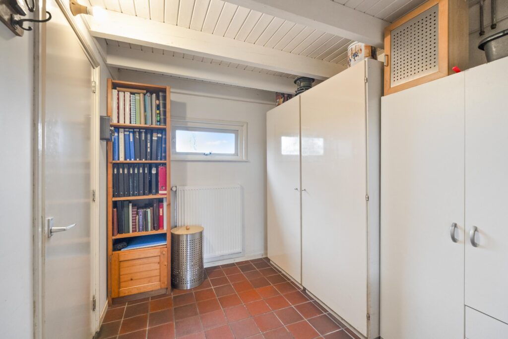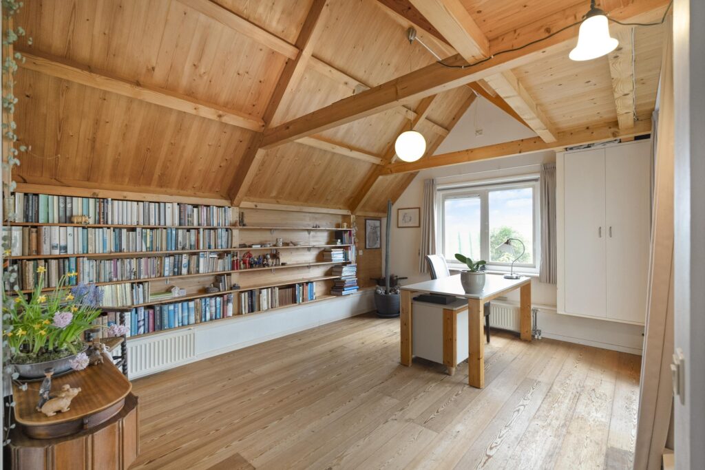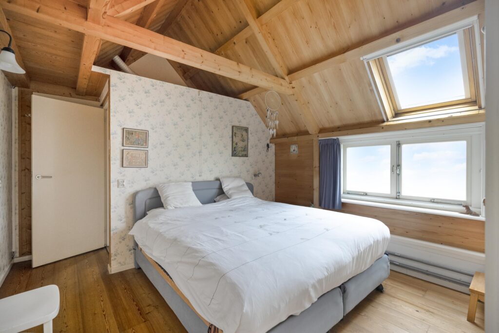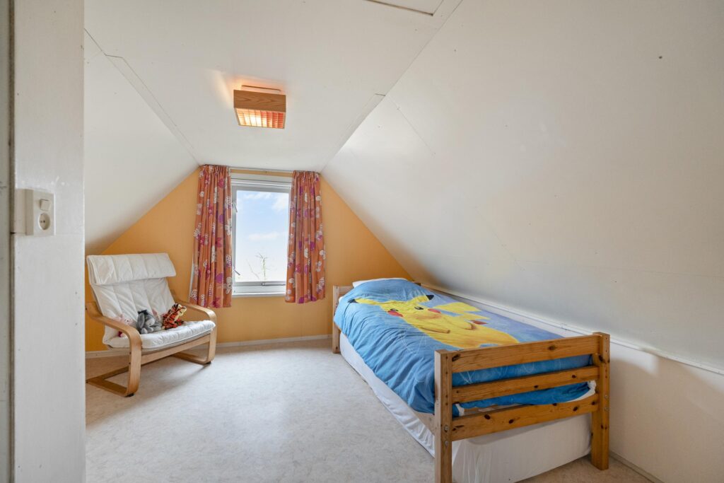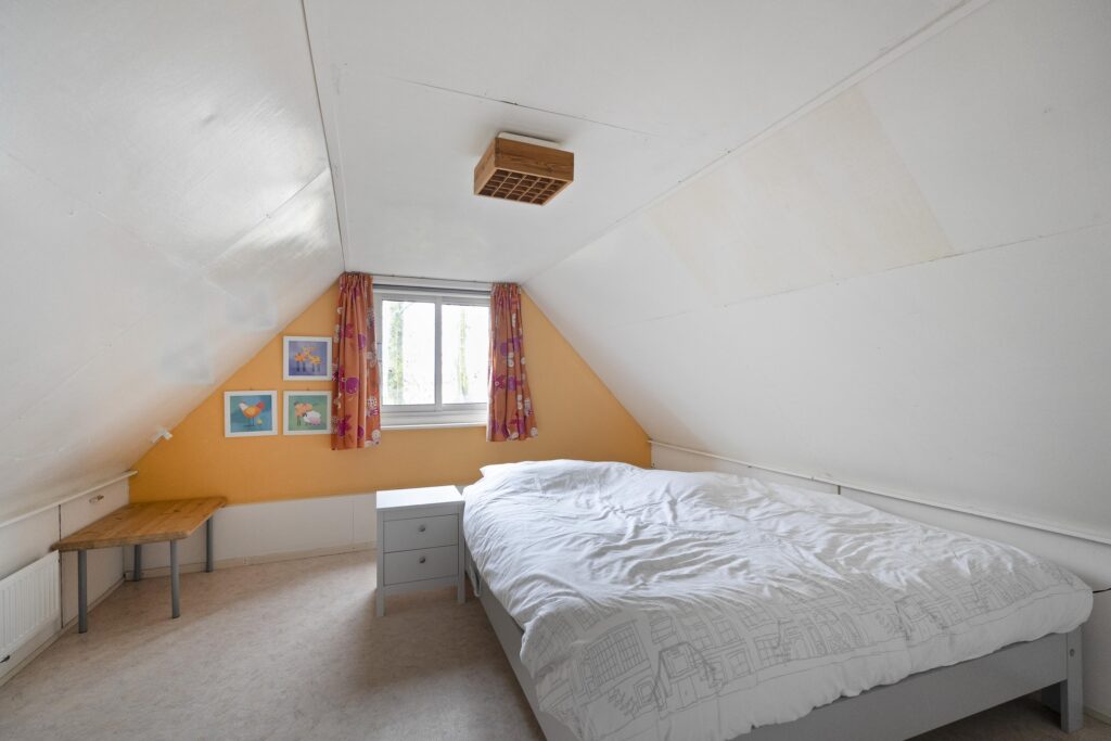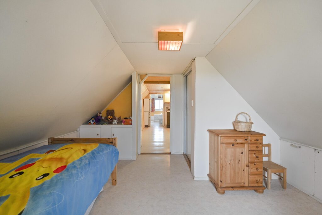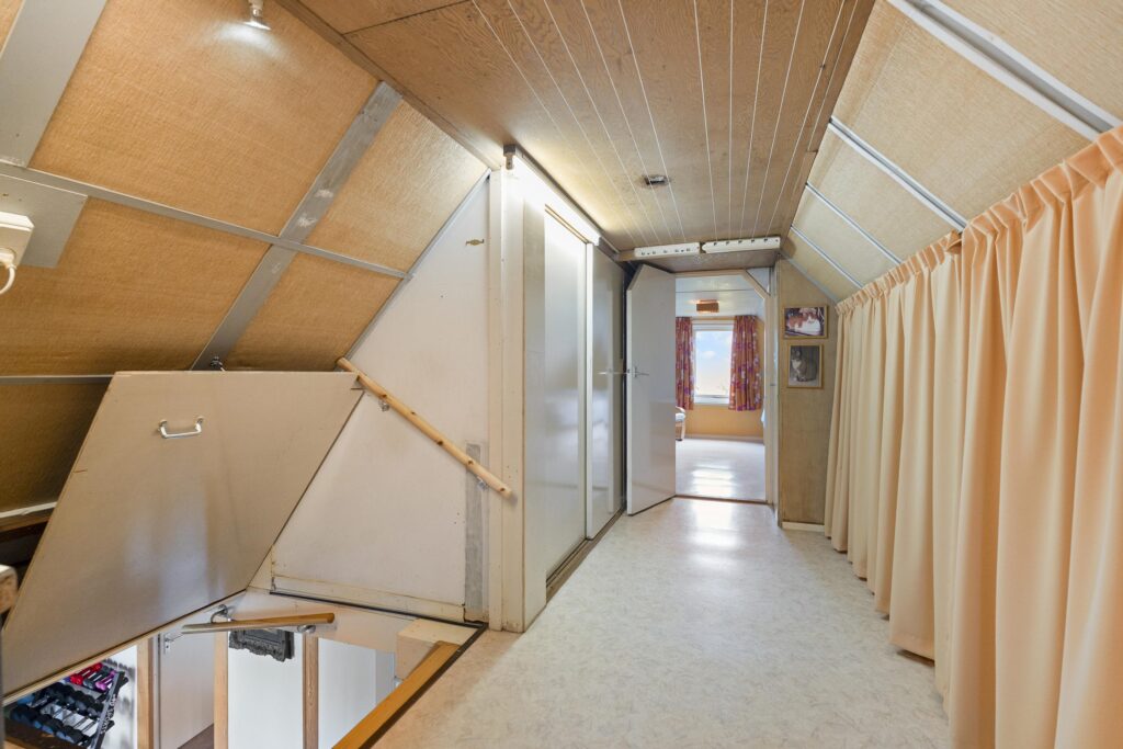 Op de verdieping is een ruime overloop met bergruimte en een tweetal slaapkamers te vinden, waarvan één met een wastafeltje en een met een vaste kast. Deze verdieping ligt geheel boven het oude woonhuis gedeelte.