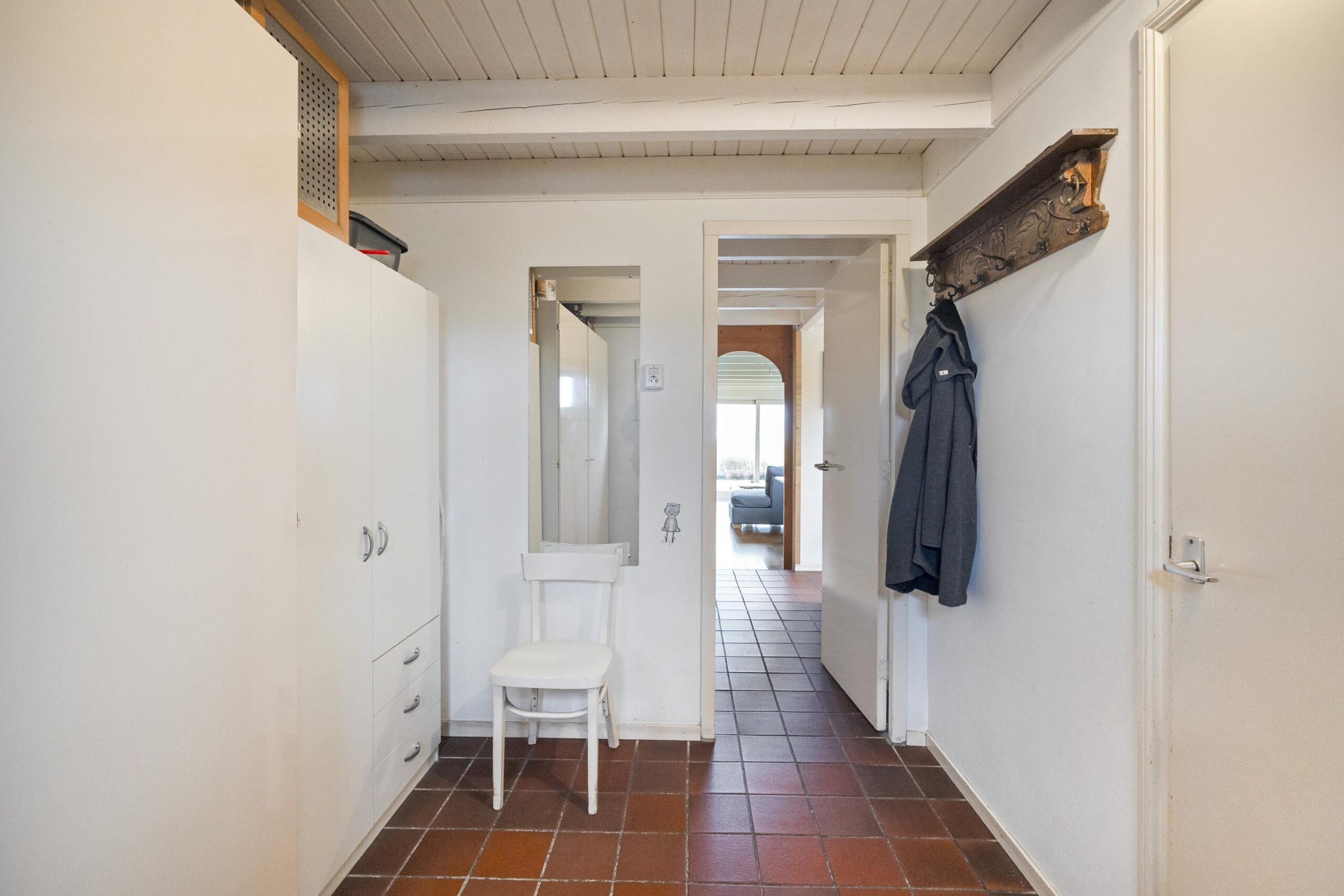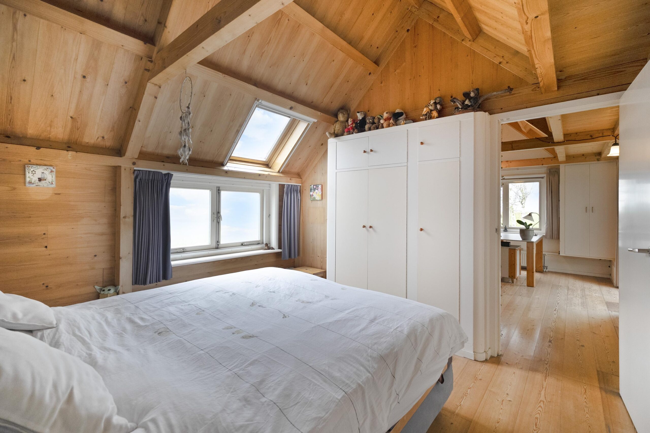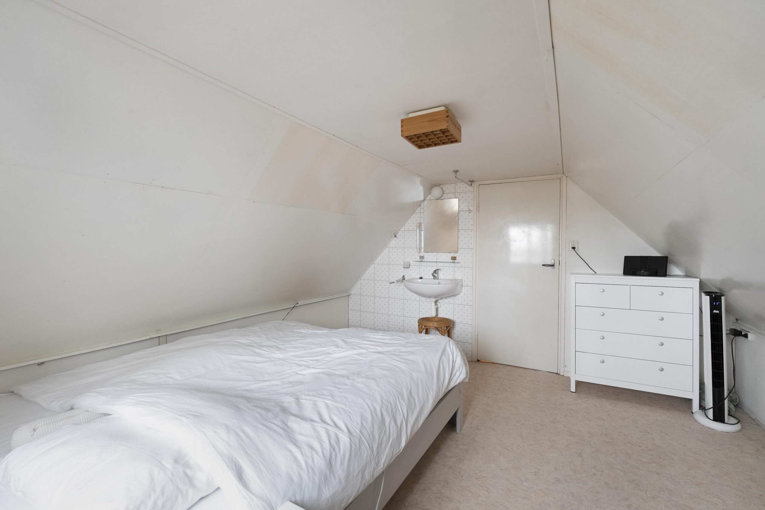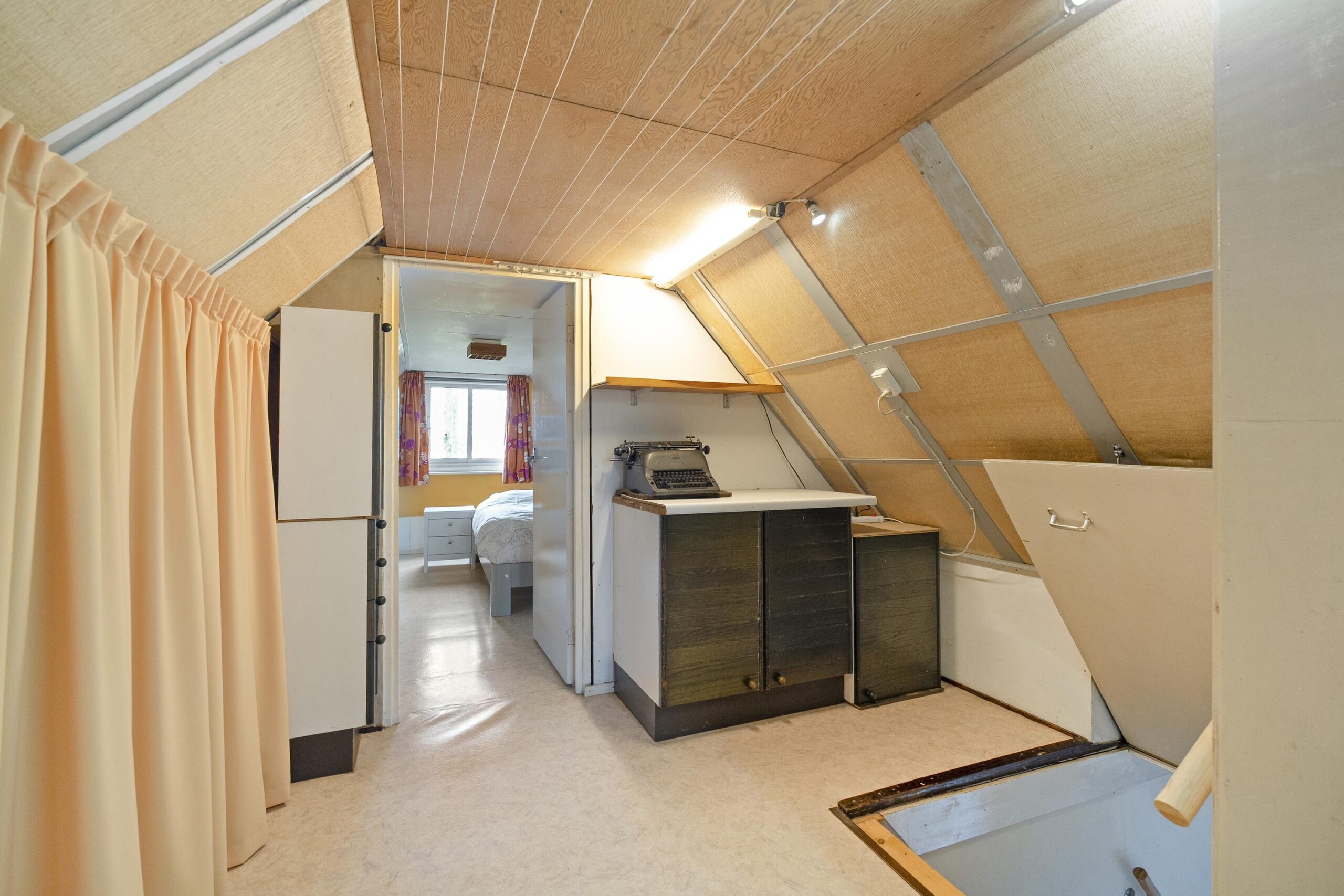 Op de verdieping is een ruime overloop met bergruimte en een tweetal slaapkamers te vinden, waarvan één met een wastafeltje en een met een vaste kast. Deze verdieping ligt geheel boven het oude woonhuis gedeelte.