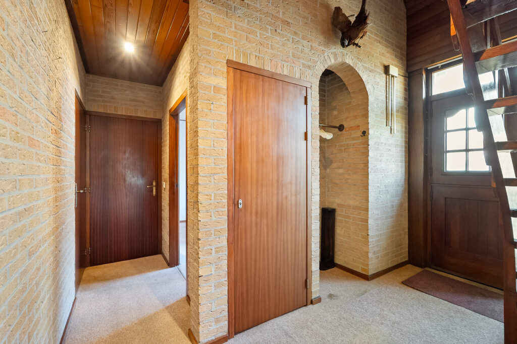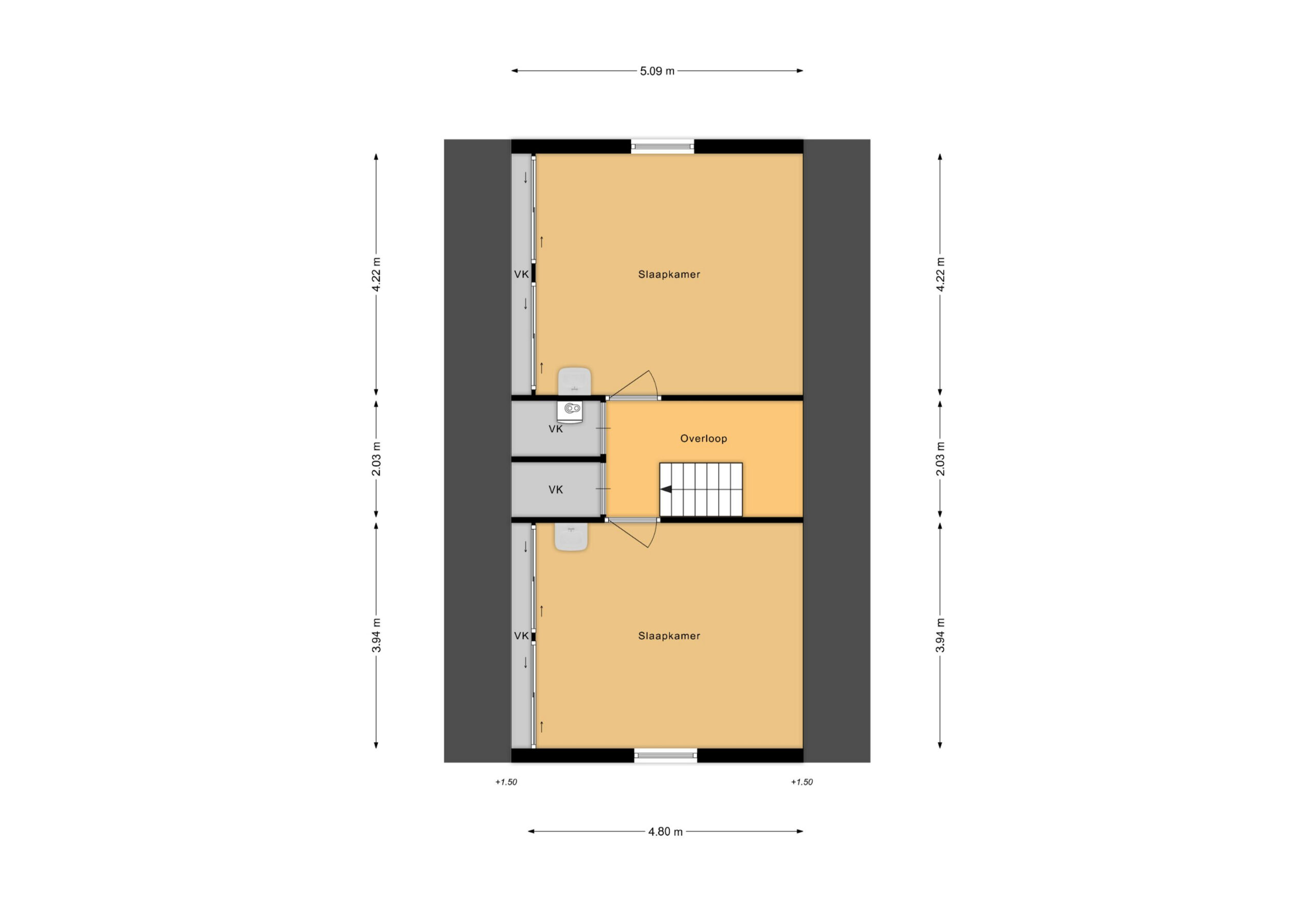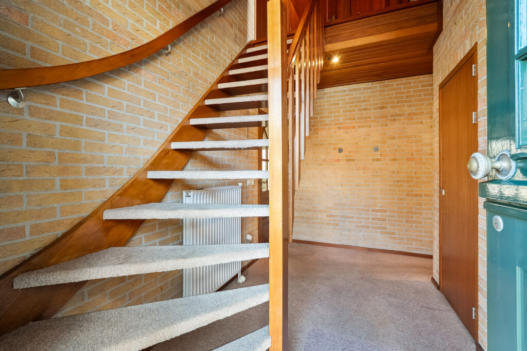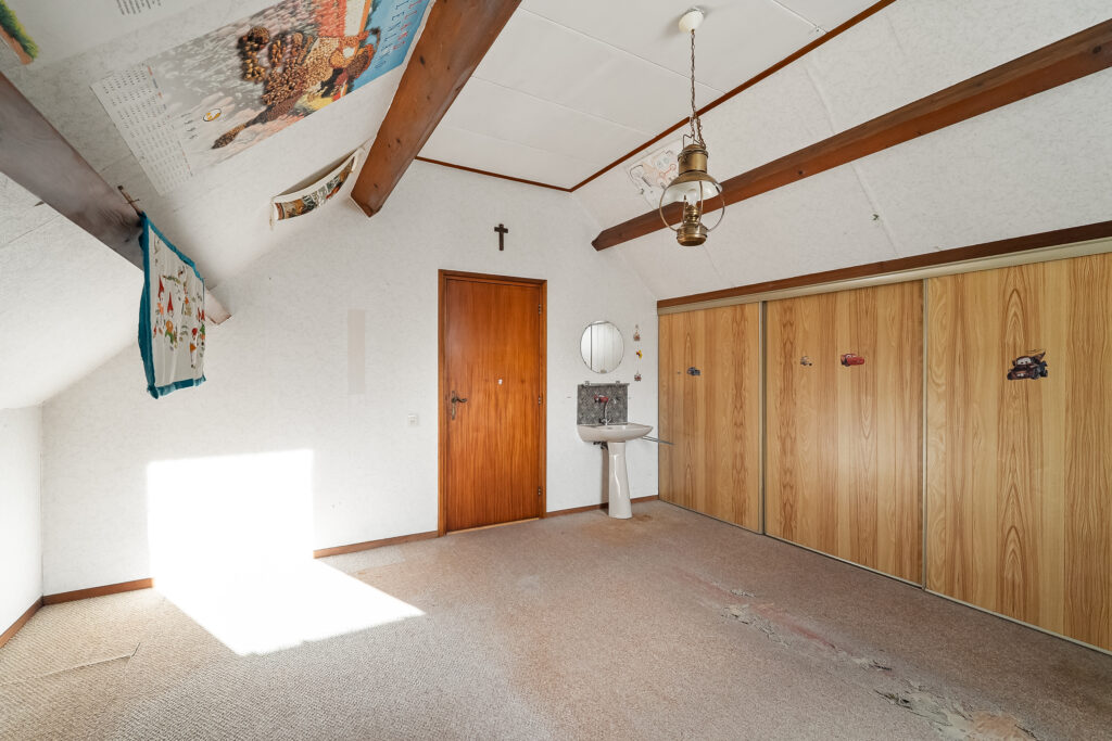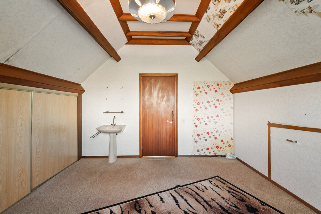 Vaste trap naar de overloop met toegang tot twee slaapkamers met beide een wastafel, vaste kast en opslagruimte achter knieschotten.