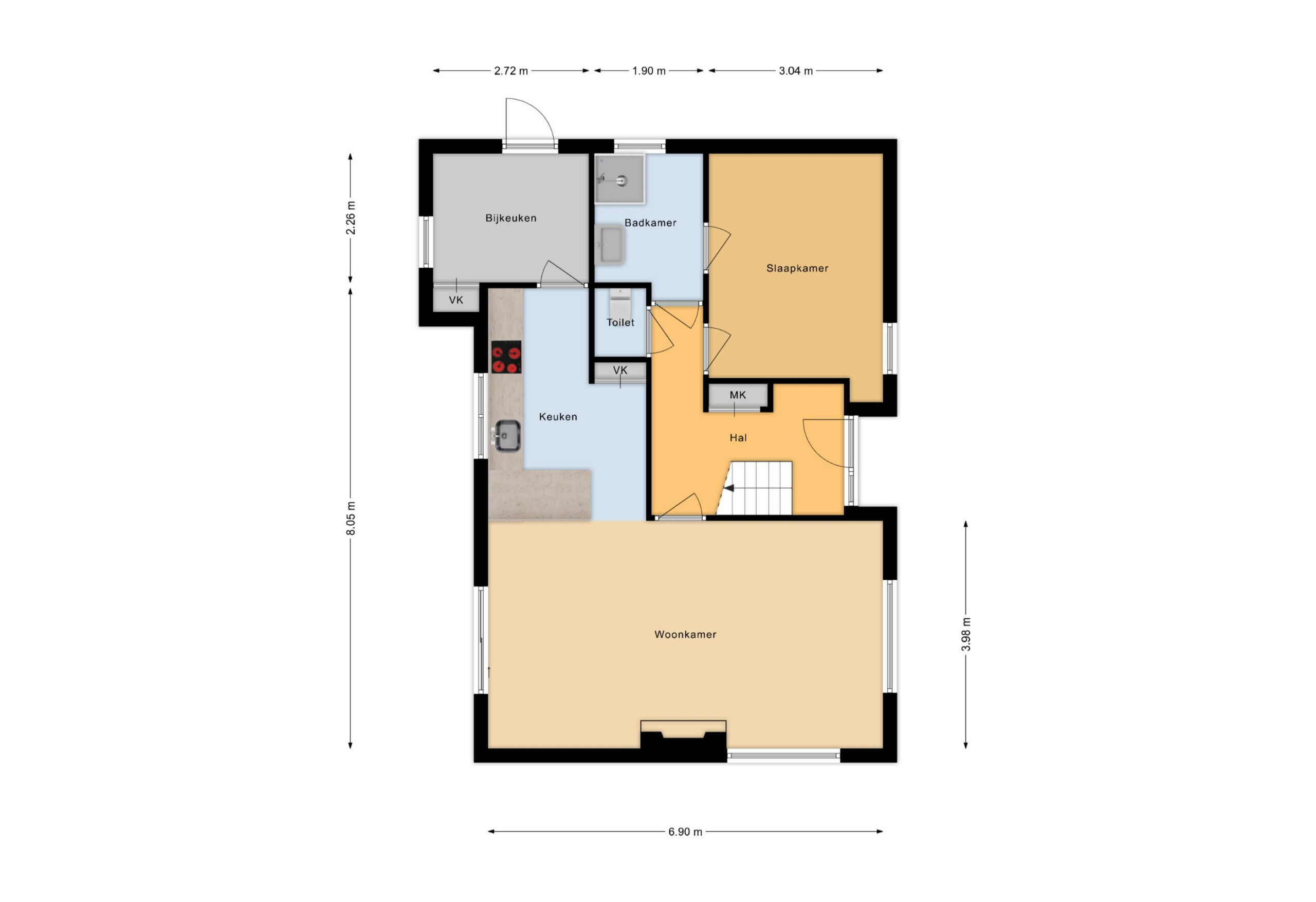 Entree, hal, meterkast, toilet en fonteintje, trapopgang naar eerste verdieping. Woonkamer aan de voorzijde van de woning, open haard en schuifpui. Half open keuken met koelkast, 4-pits gaskookplaat, afzuigkap en oven en toegang naar bijkeuken. Bijkeuken met aansluitingen (2x) voor wasmachine en/of vaatwasser, vaste kast en toegang tot de achtertuin. Via de hal heeft u tevens toegang tot de slaapkamer en de badkamer met douche en wastafel.
