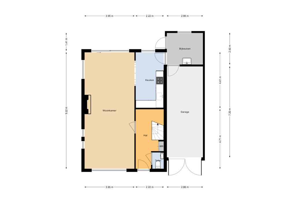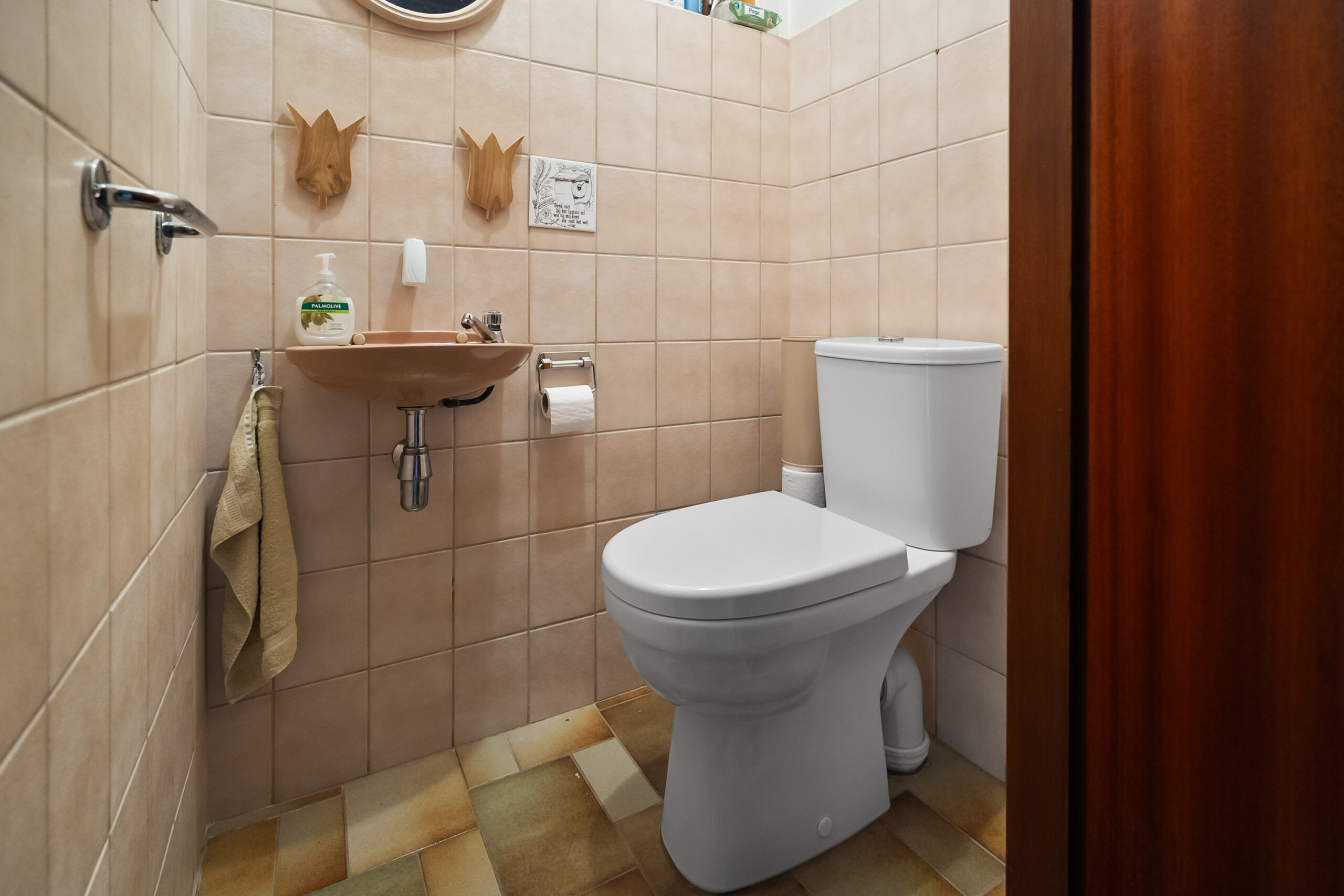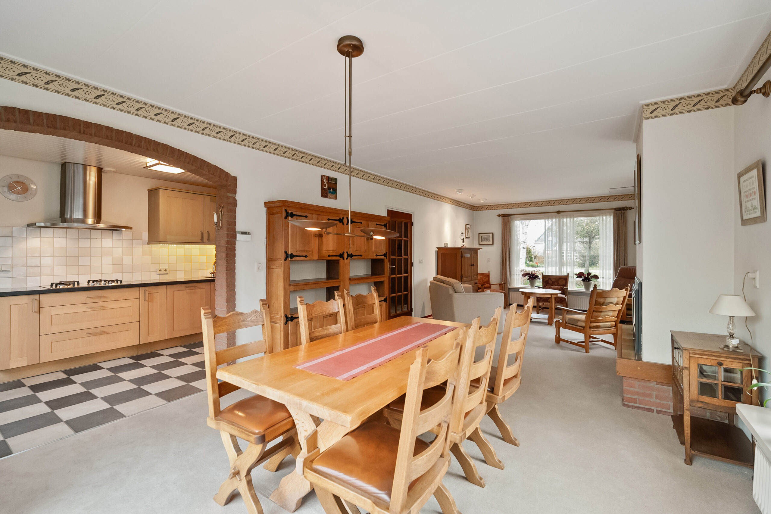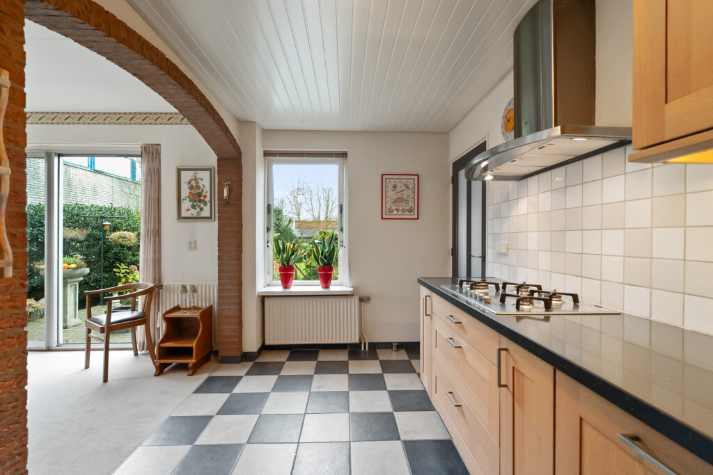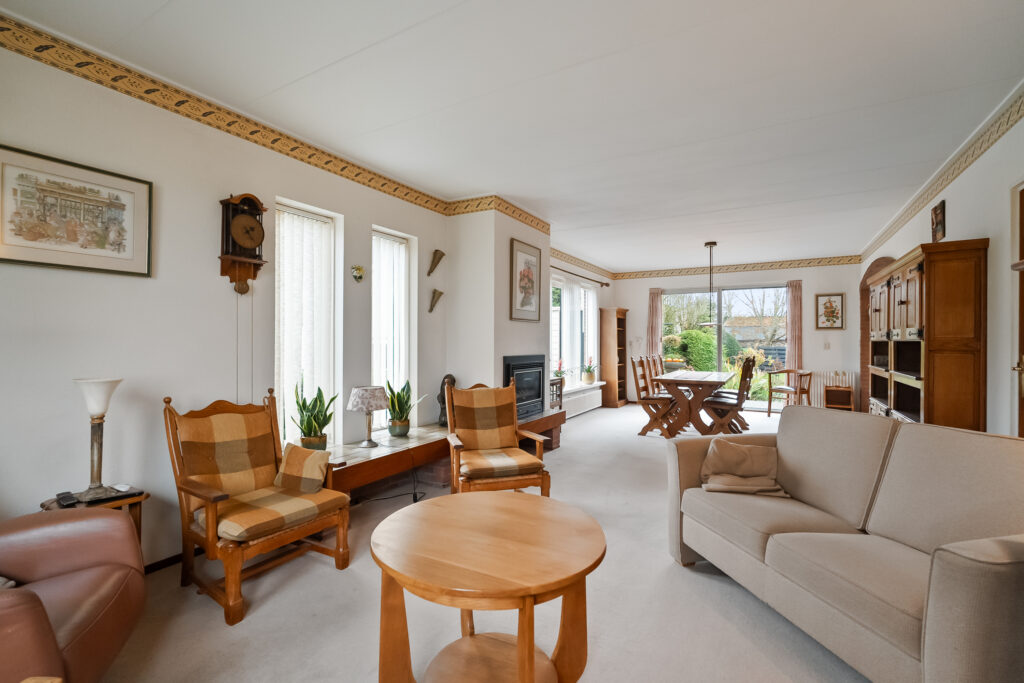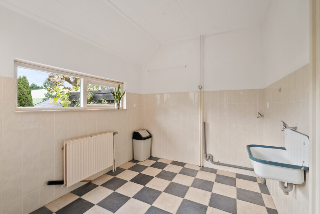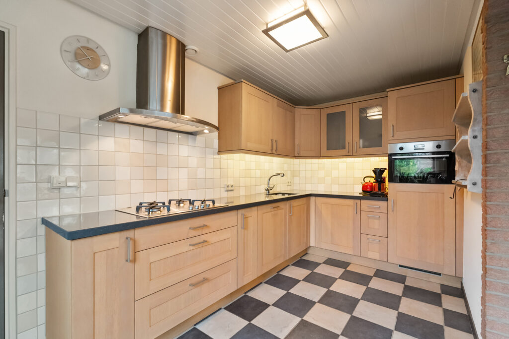Via de entree aan de voorzijde bereikt u de ruime hal met trapopgang, toiletruimte en toegang tot de overige vertrekken. De royale woonkamer beschikt over een sfeervolle gashaard en een schuifpui naar de prachtig aangelegde achtertuin. De open keuken is uitgevoerd in massief licht eiken en voorzien van diverse inbouwapparatuur, waaronder een koelkast, vaatwasser, gaskookplaat, oven en afzuigkap. Aansluitend vindt u de bijkeuken met aansluiting voor de wasmachine en extra bergruimte. Vanuit hier is de inpandige garage (ca. 21 m²) bereikbaar, evenals de achtertuin.