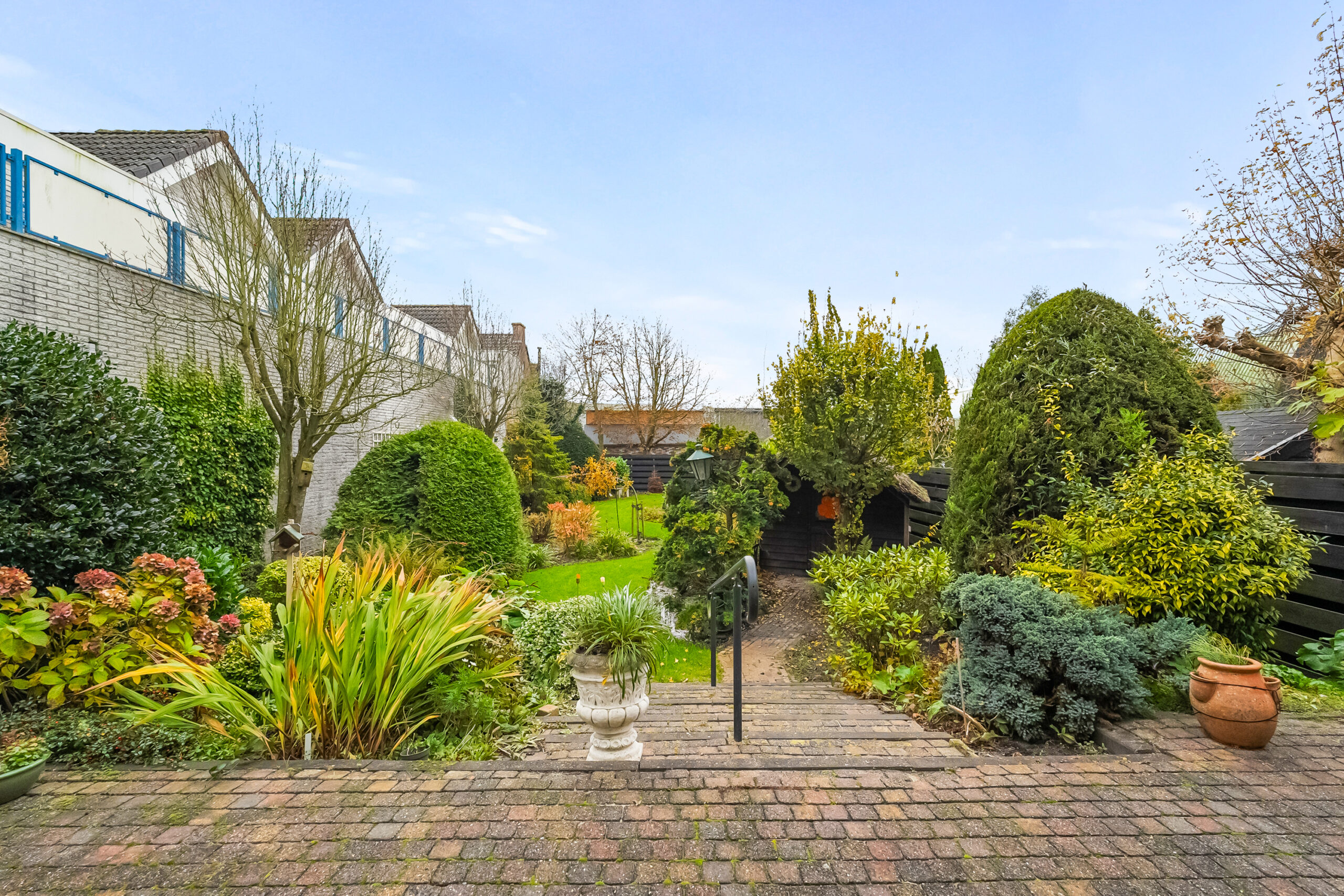 De woning beschikt over een oprit met parkeergelegenheid op eigen terrein, een verzorgde voor- en zijtuin, en een bijzonder diepe achtertuin van circa 30 meter op het zuidwesten. De tuin is fraai aangelegd met vaste beplanting en meerdere terrassen, waarvan het hoofdterras direct aan de woning grenst. Daarnaast is er een houten berging aanwezig. Ondanks dat er aan de west zijde een appartementencomplex is gebouwd kunnen wij u verzekeren dat hierdoor geen hinder wordt ondervonden door inkijk in de achtertuin. Vanaf deze galerij is de achtertuin niet te zien, waardoor er veel privacy is in de achtertuin.