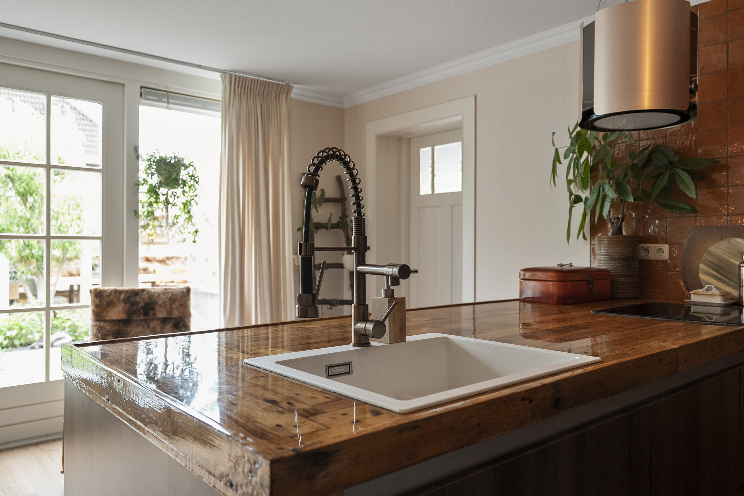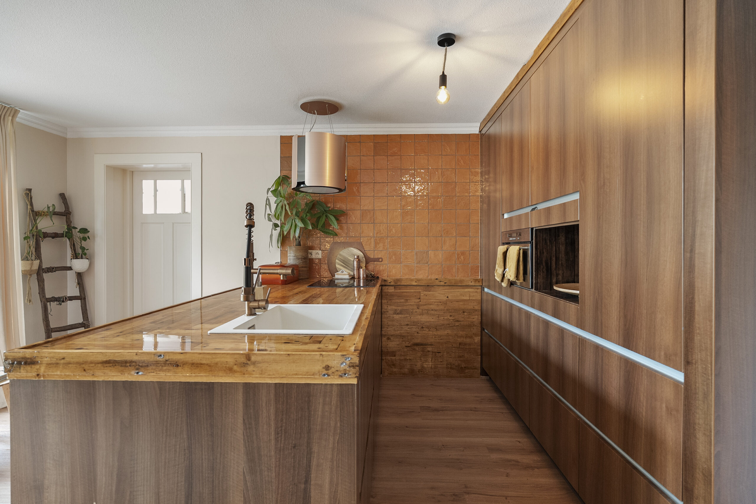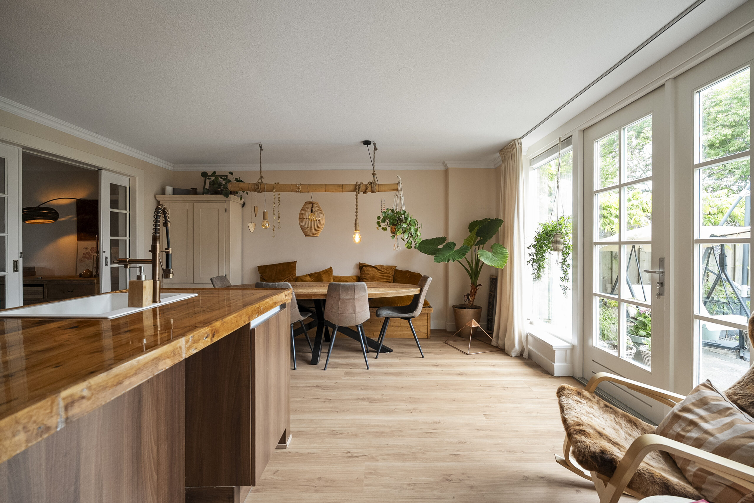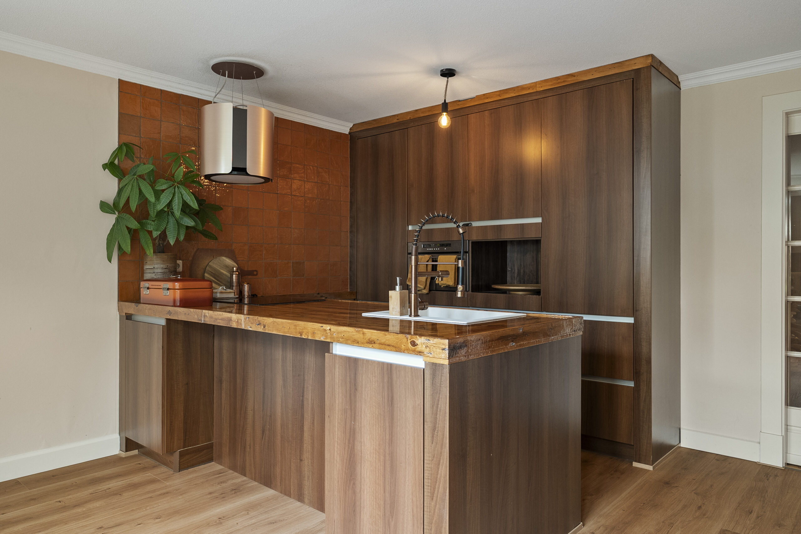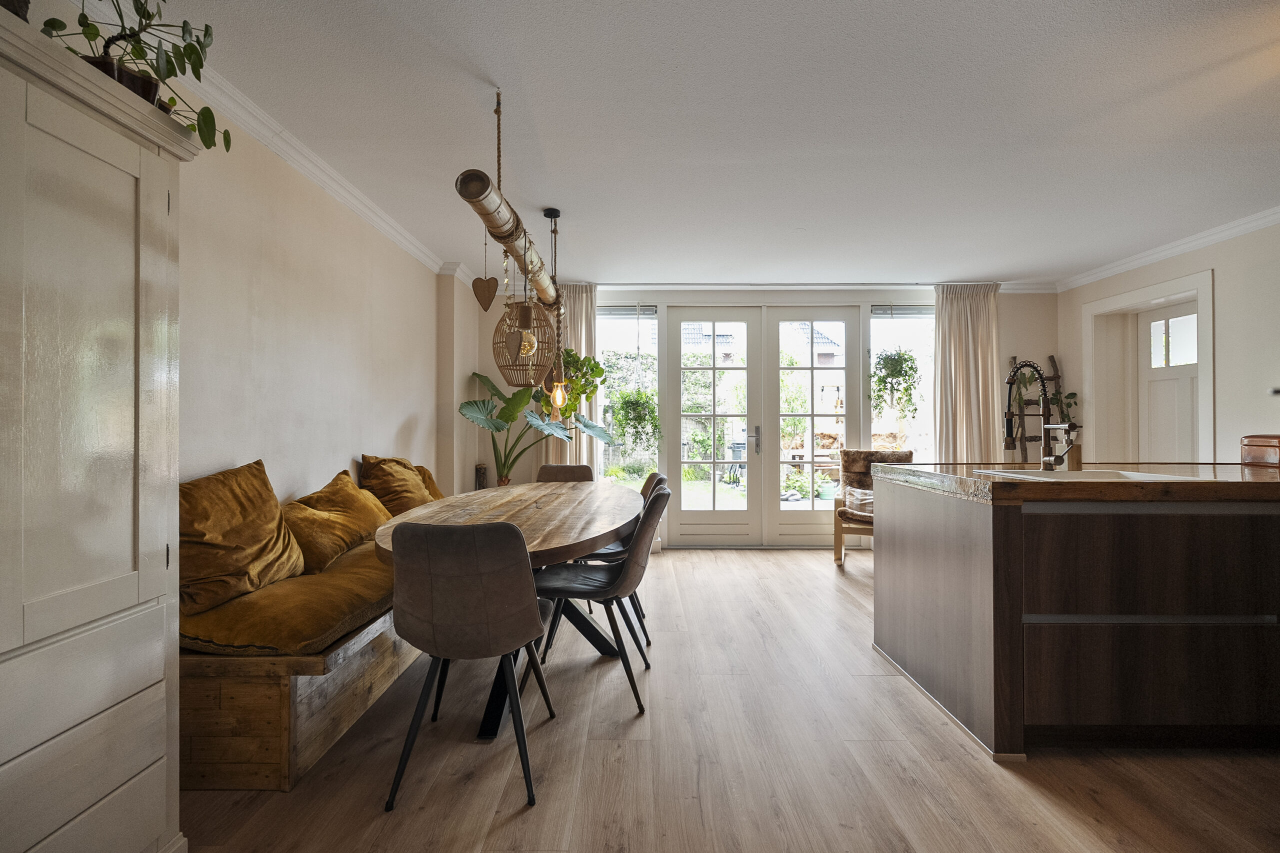 De uitgebouwde woonkeuken is uitgerust met een royaal kookeiland en voorzien van moderne inbouwapparatuur. Vanuit de woonkeuken zijn zowel de bijkeuken als de garage bereikbaar. Via de openslaande deuren heb je toegang tot de zonnige achtertuin gelegen op het zuiden.