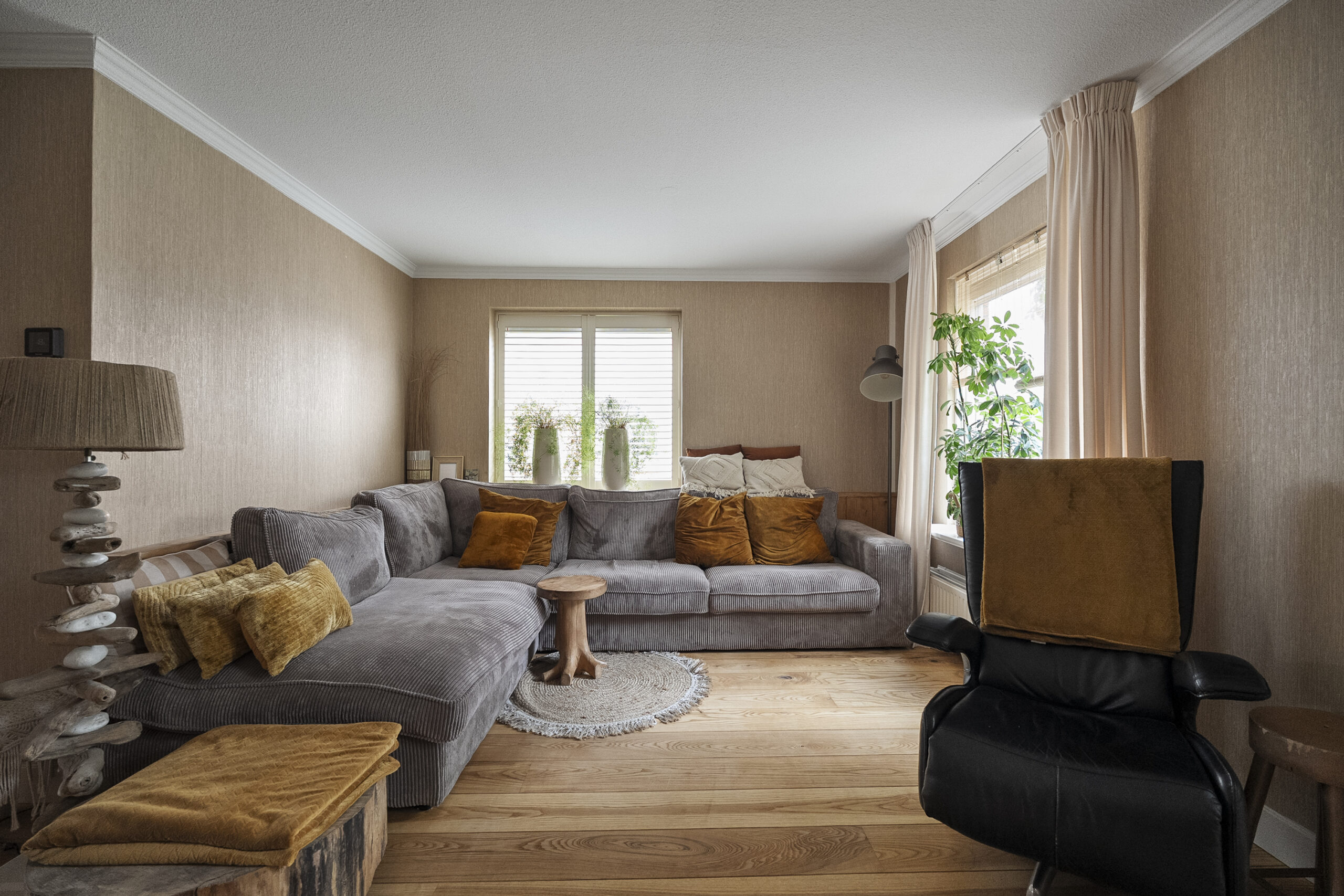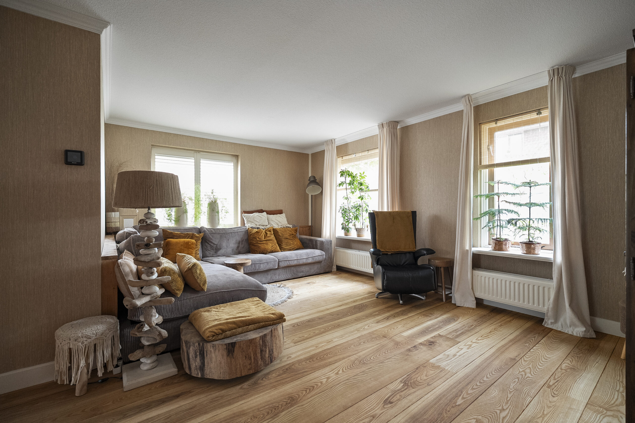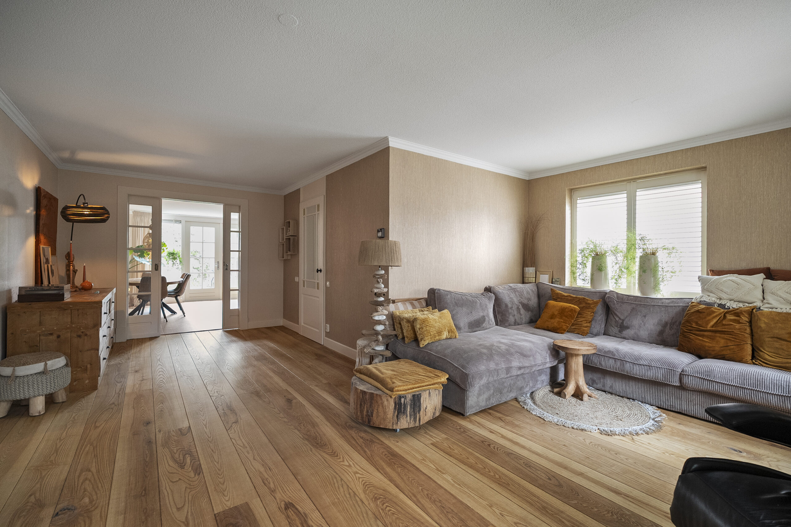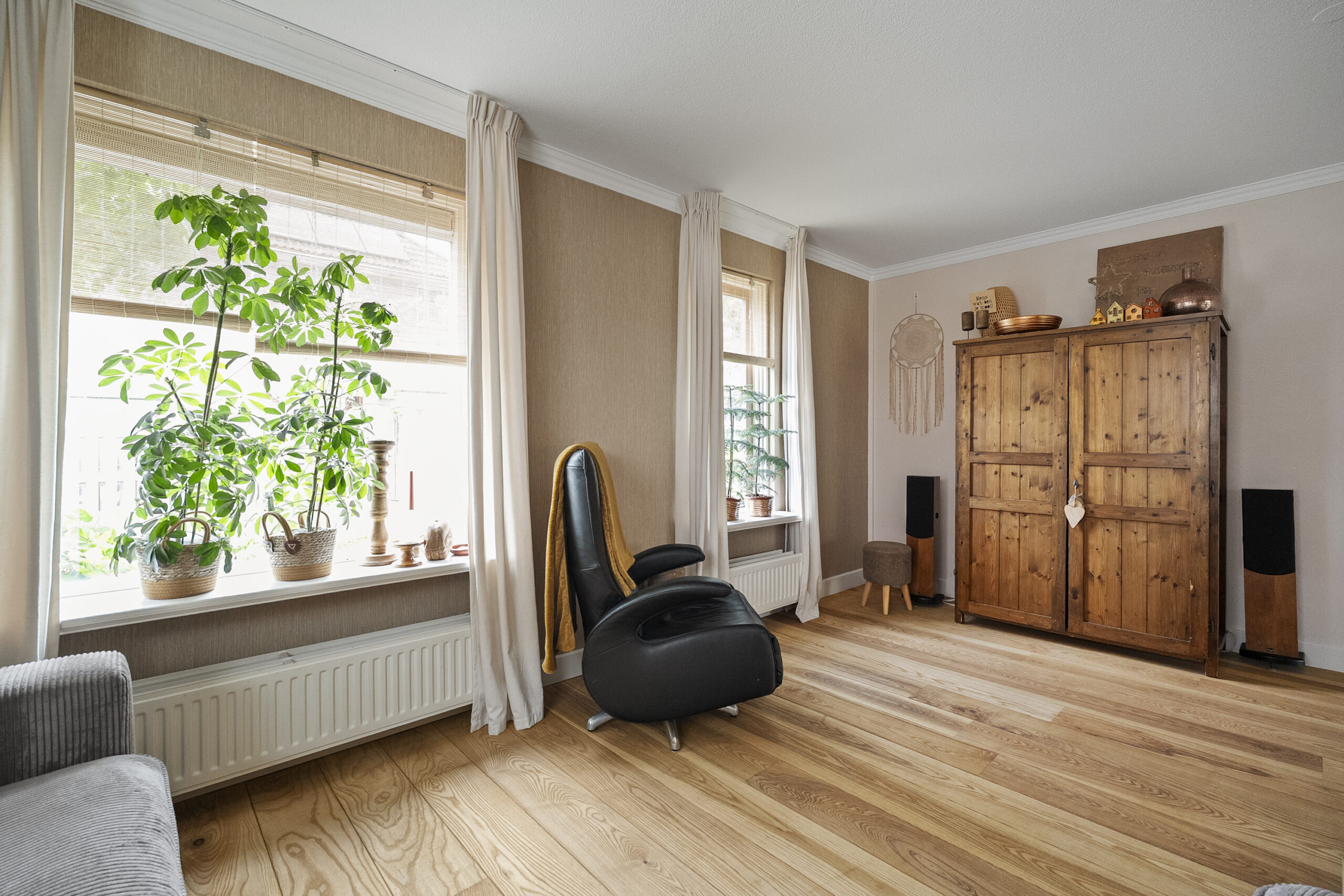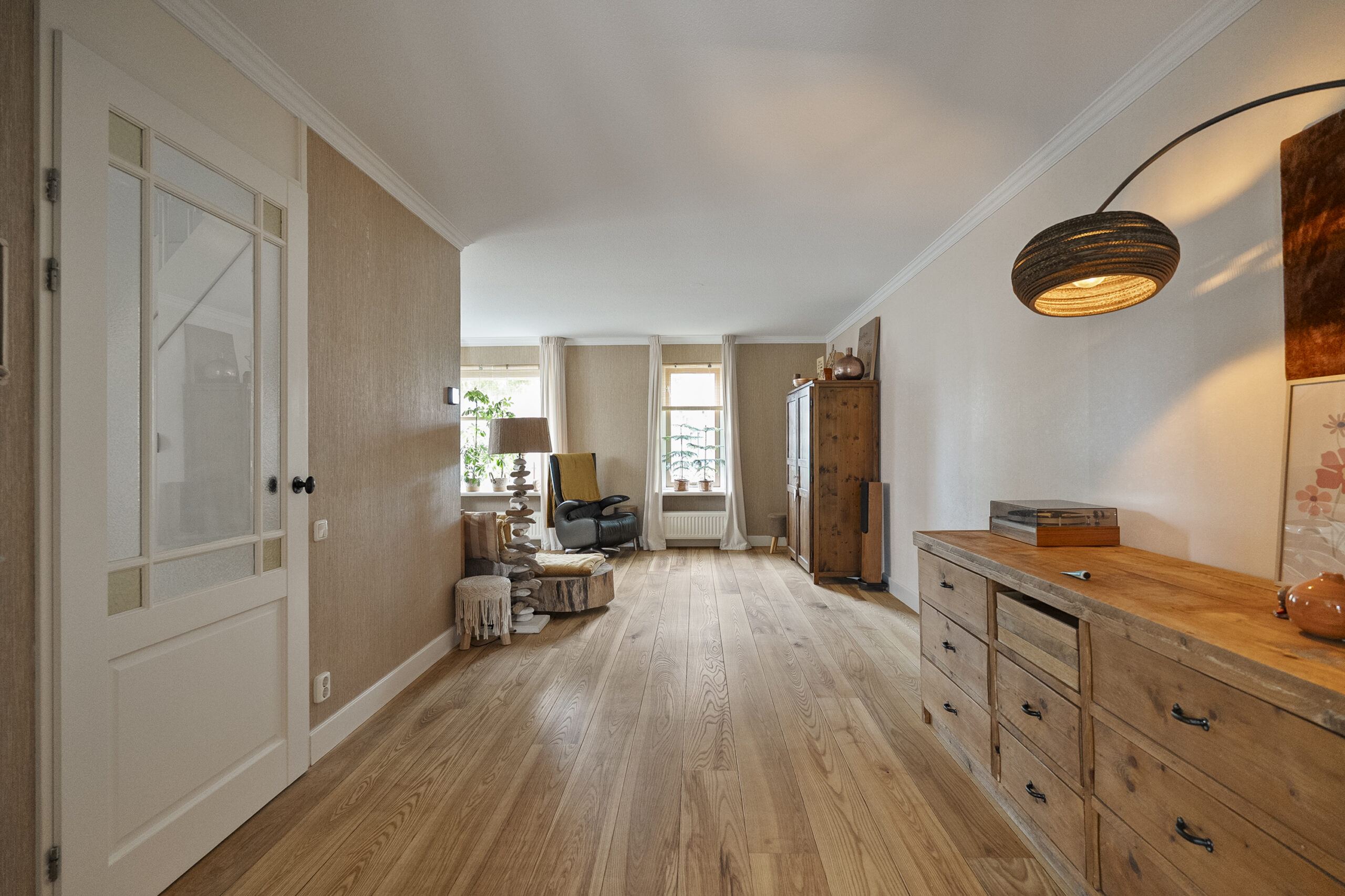 De begane grond bestaat uit twee kamers, waaronder een royale woonkamer waarin natuurlijk licht rijkelijk naar binnen stroomt via de grote ramen. Dit maakt het een aangename plek om te ontspannen of gasten te ontvangen.