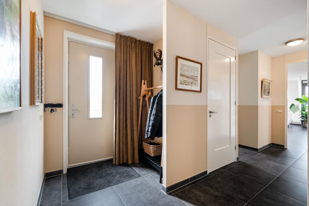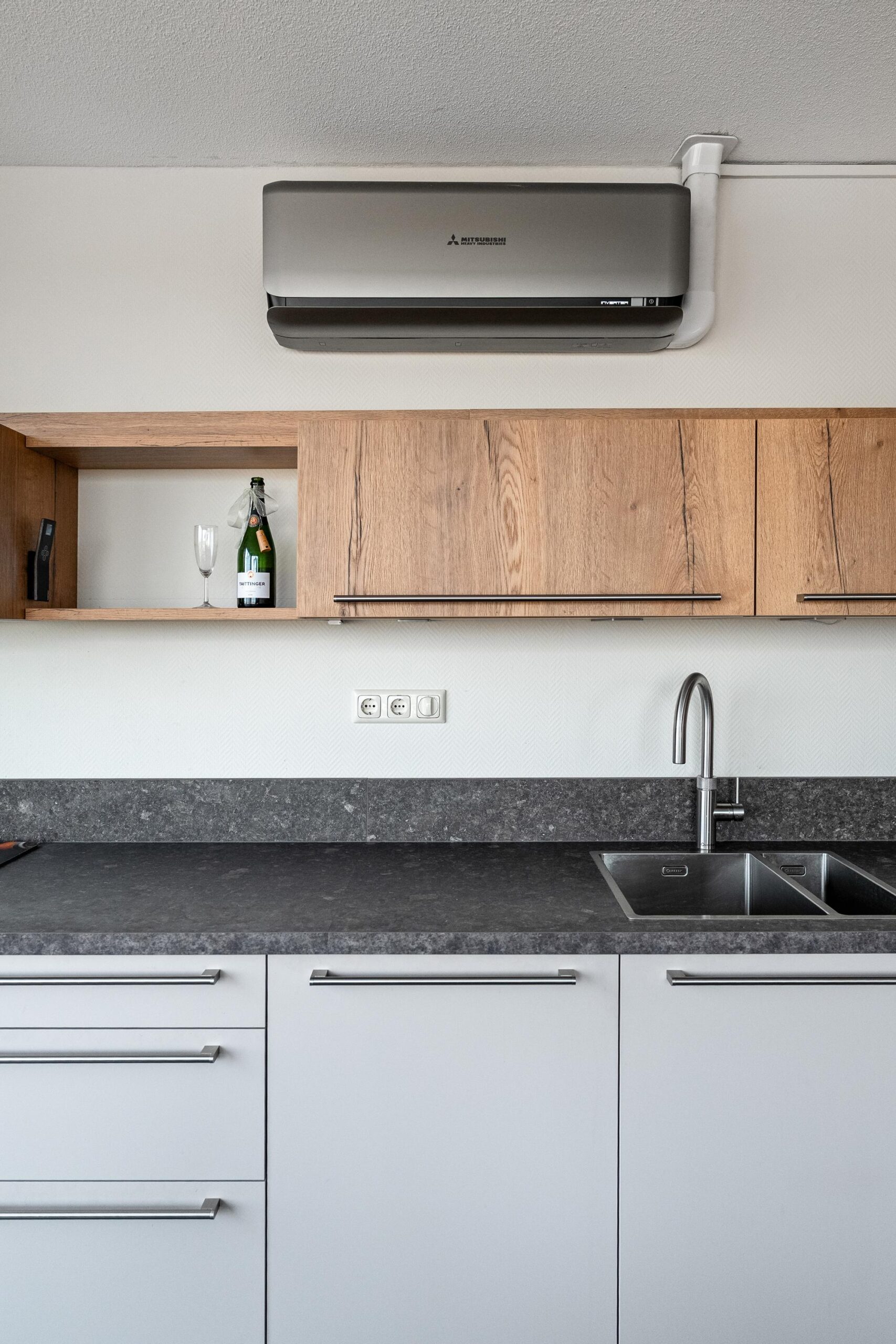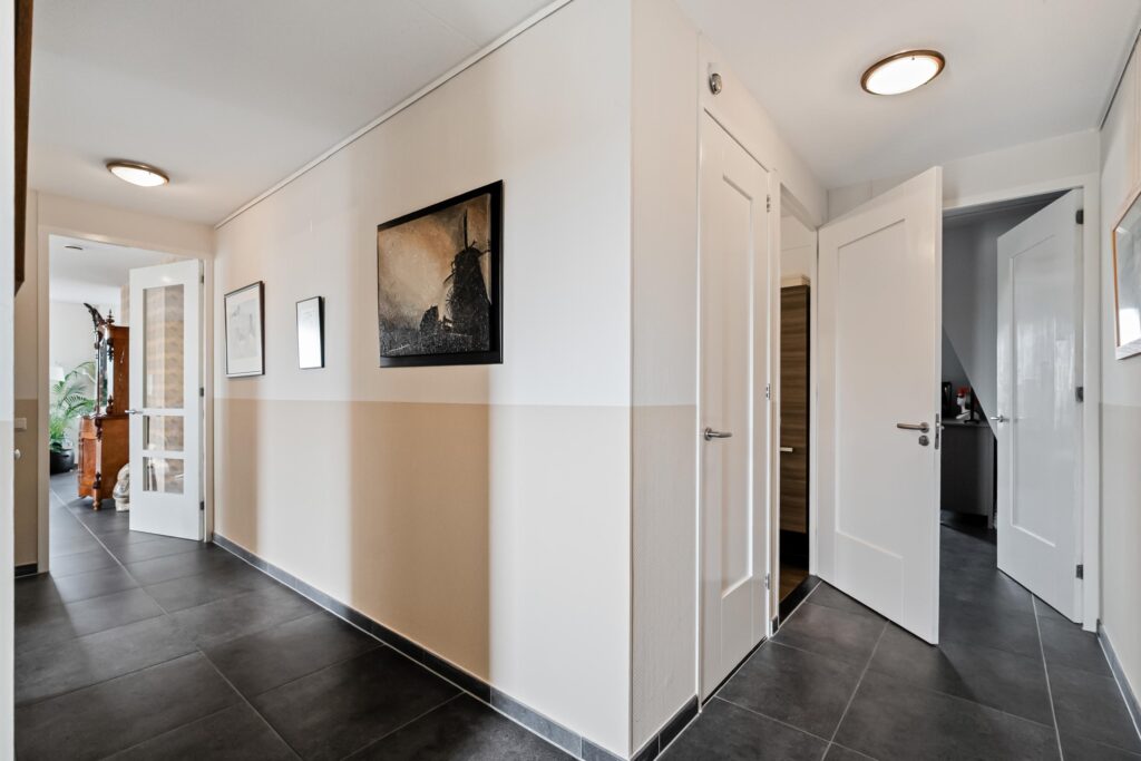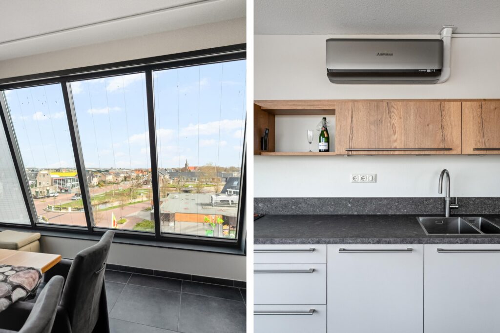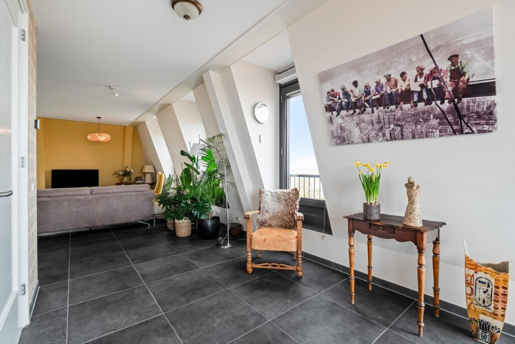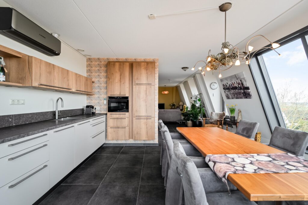 Via de afgesloten entree met intercom, brievenbussen, trappenhuis en lift bereikt u de woning op de derde en tevens bovenste verdieping van het complex. U komt binnen in de centrale hal, die toegang biedt tot alle vertrekken. De riante woonkamer met open keuken vormt het hart van de woning. Door de hoekligging en de grote raampartijen is dit een heerlijk lichte en ruimtelijke leefruimte. Vanuit de woonkamer heeft u directe toegang tot het zonnige dakterras en de praktische technische ruimte met witgoedaansluiting en bergruimte. De moderne open keuken (2024) is uitgevoerd met hoogwaardige inbouwapparatuur, waaronder een kokendwaterkraan, koelkast, vaatwasser en een inductiekookplaat. In de keuken is tevens een airco aanwezig.