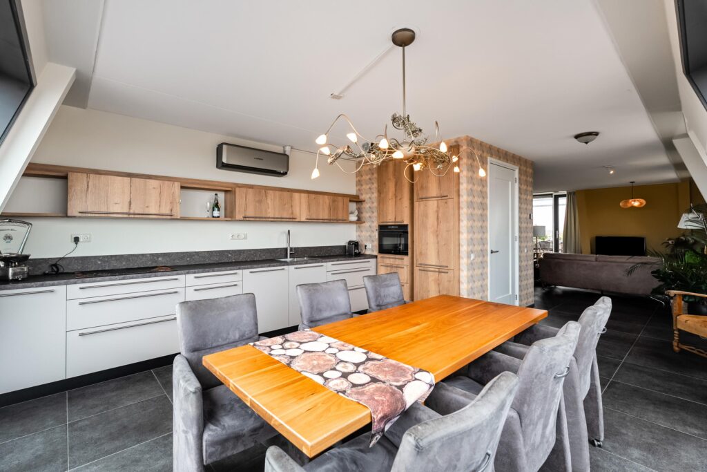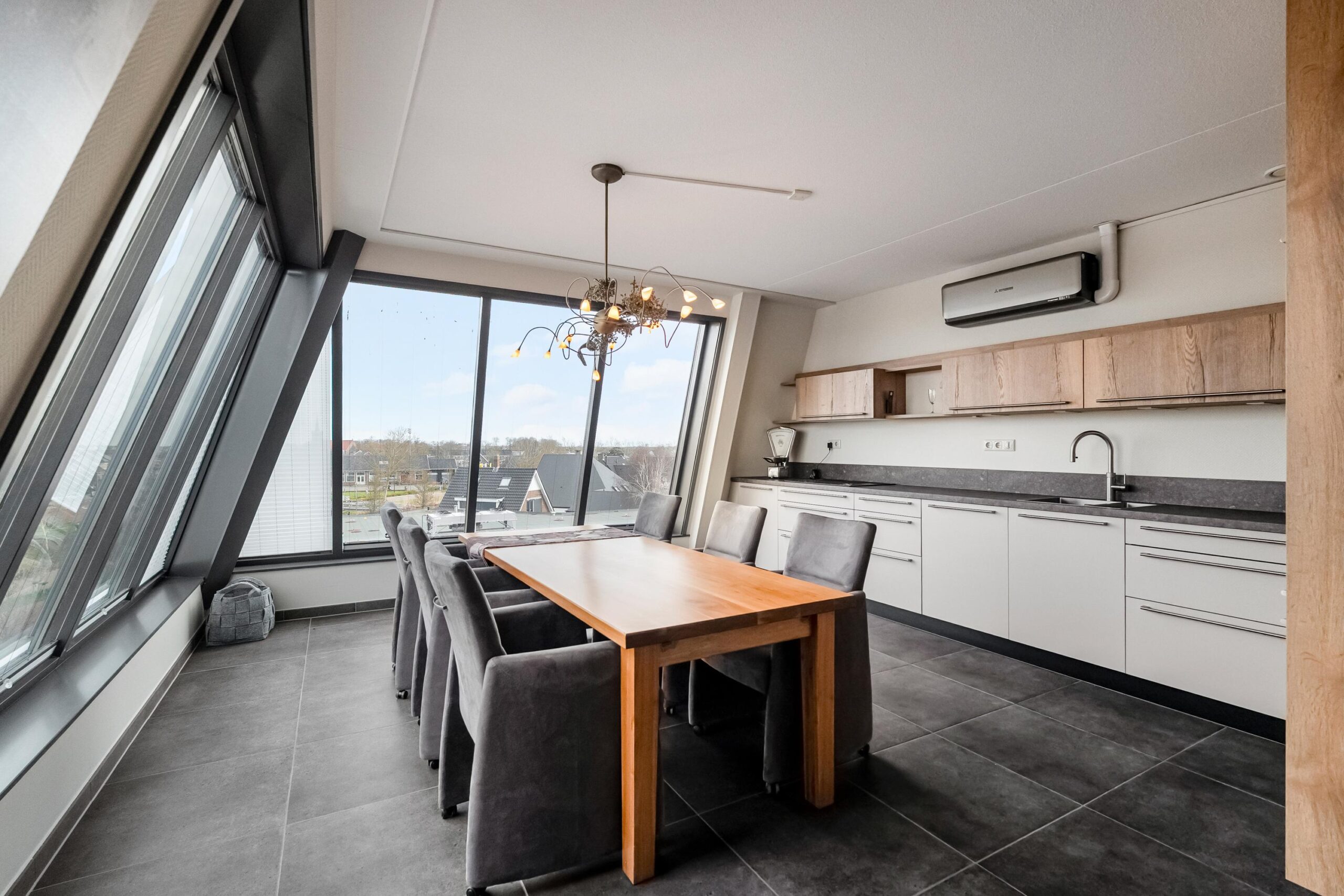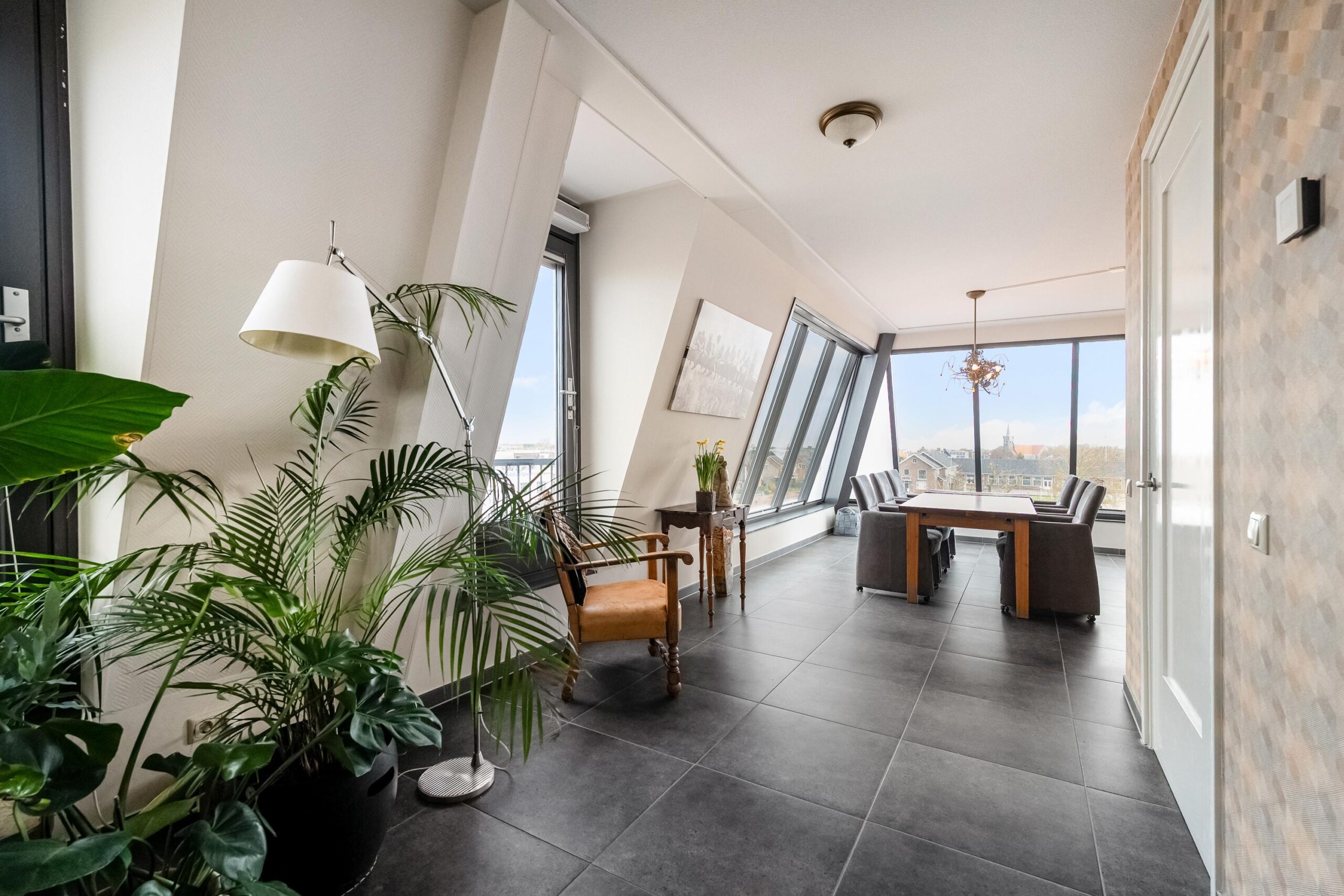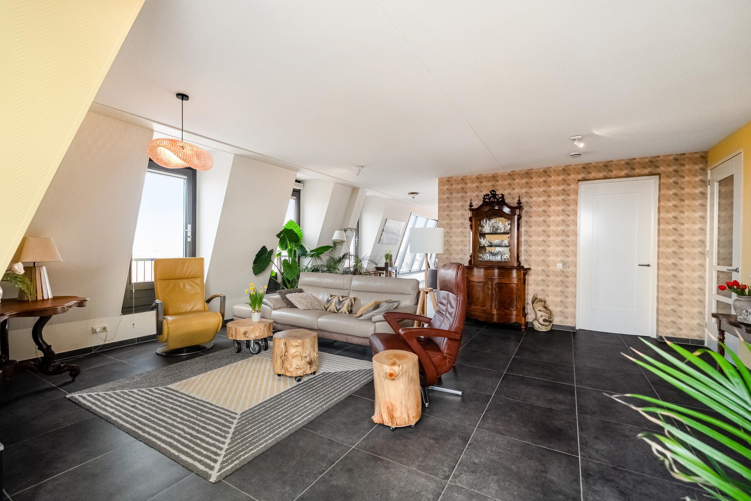 Via de afgesloten entree met intercom, brievenbussen, trappenhuis en lift bereikt u de woning op de derde en tevens bovenste verdieping van het complex. U komt binnen in de centrale hal, die toegang biedt tot alle vertrekken. De riante woonkamer met open keuken vormt het hart van de woning. Door de hoekligging en de grote raampartijen is dit een heerlijk lichte en ruimtelijke leefruimte. Vanuit de woonkamer heeft u directe toegang tot het zonnige dakterras en de praktische technische ruimte met witgoedaansluiting en bergruimte. De moderne open keuken (2024) is uitgevoerd met hoogwaardige inbouwapparatuur, waaronder een kokendwaterkraan, koelkast, vaatwasser en een inductiekookplaat. In de keuken is tevens een airco aanwezig.