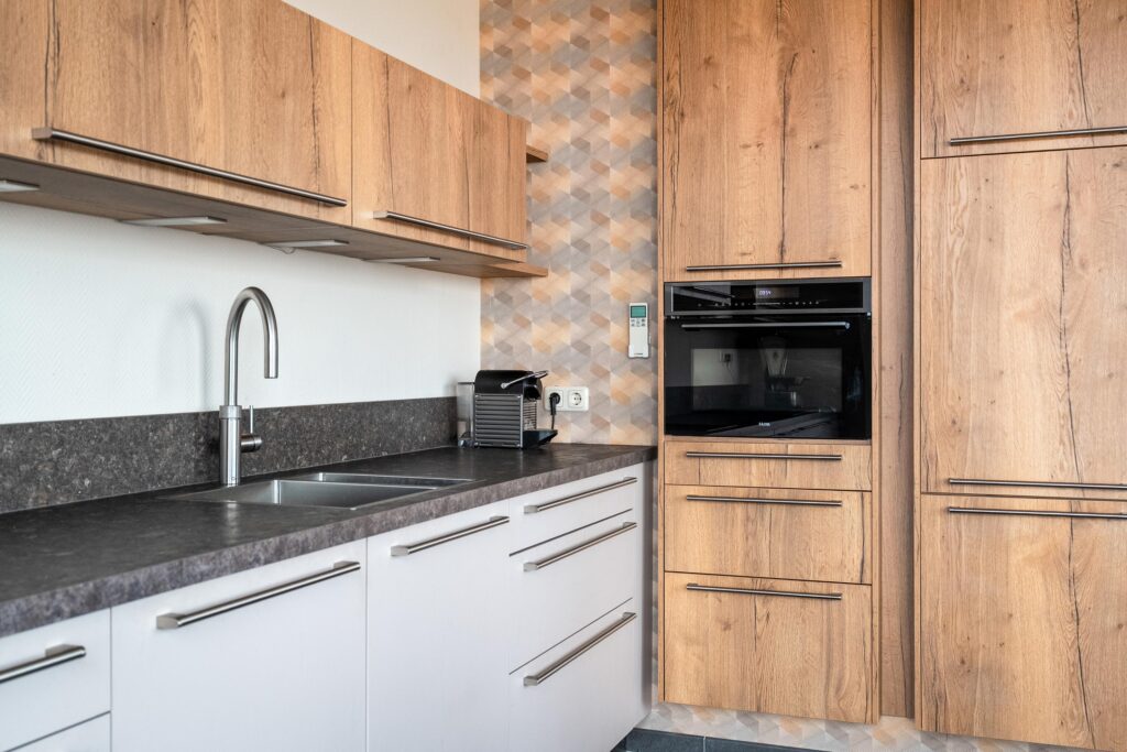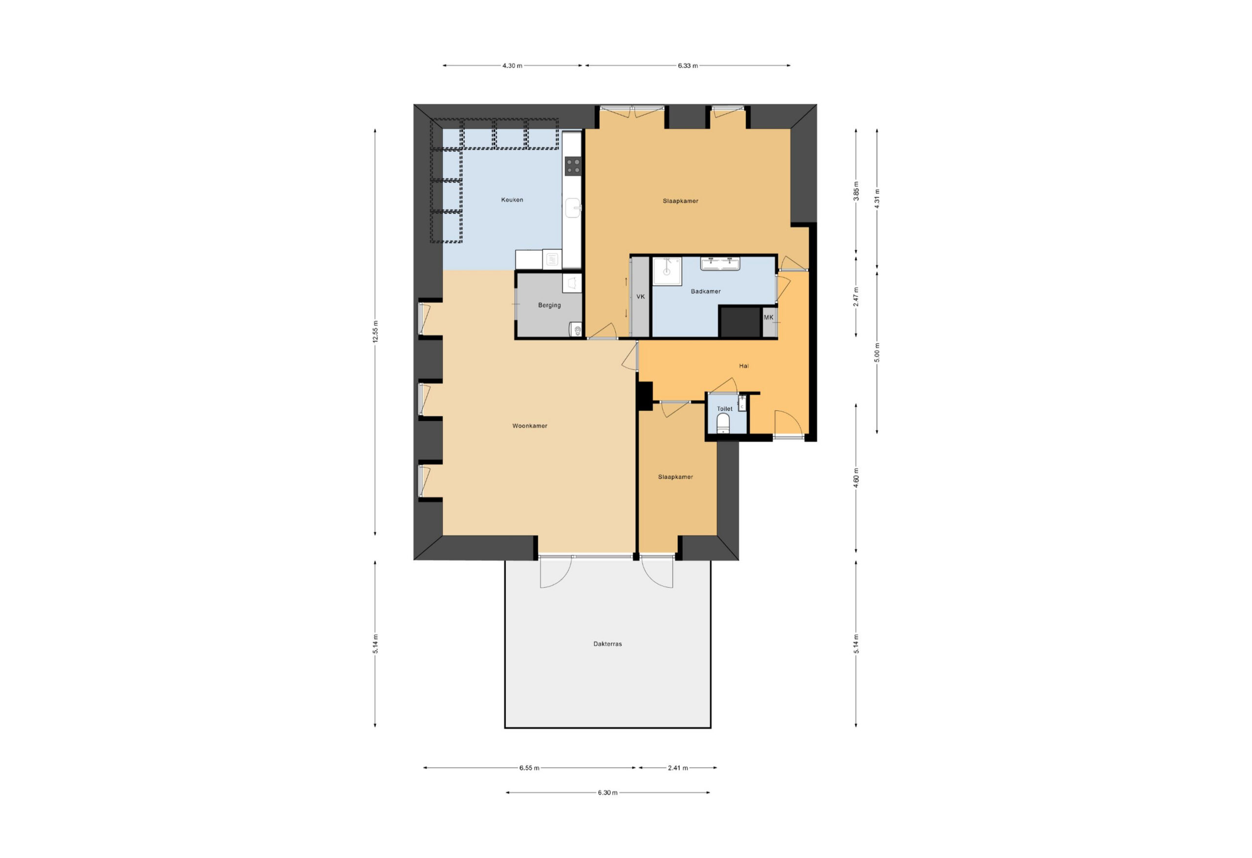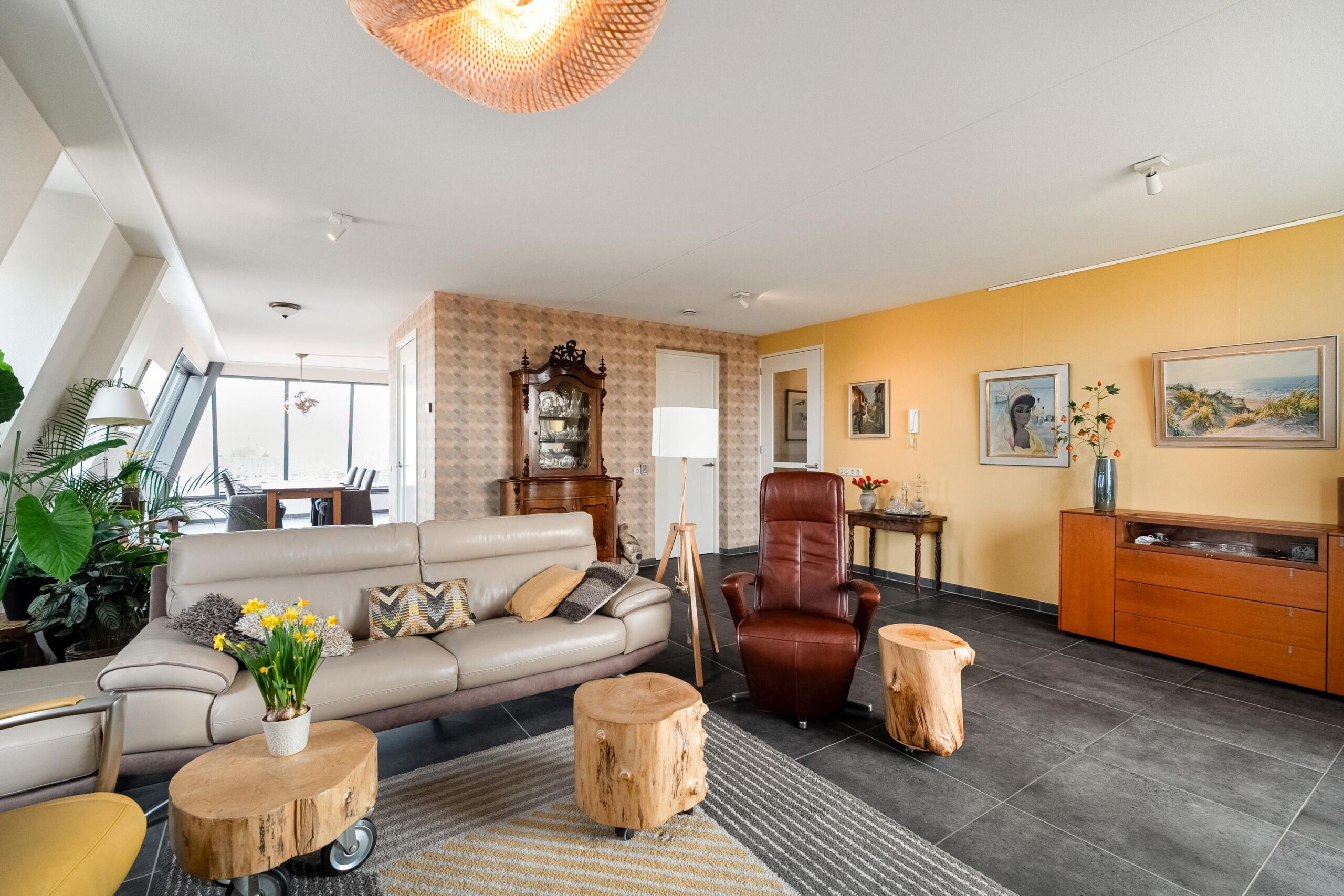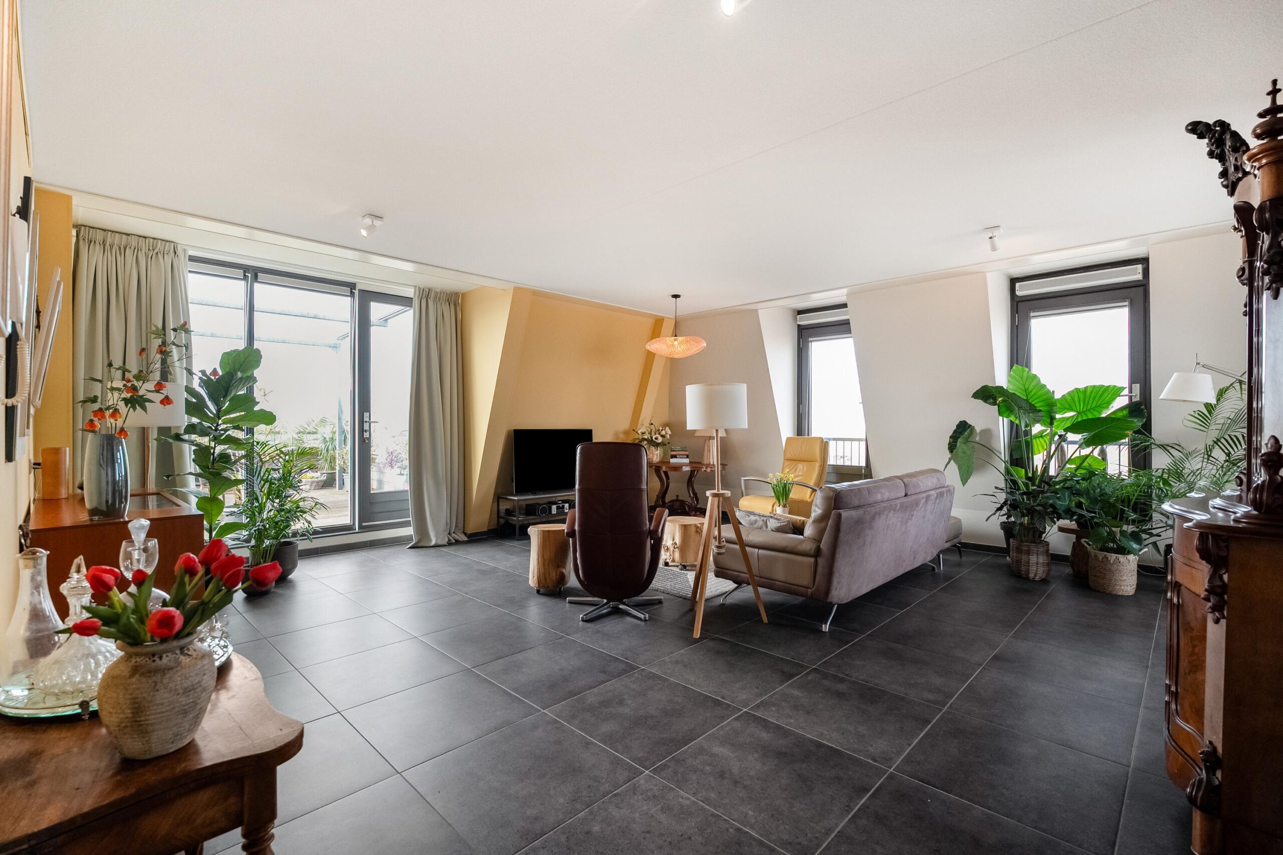 Via de afgesloten entree met intercom, brievenbussen, trappenhuis en lift bereikt u de woning op de derde en tevens bovenste verdieping van het complex. U komt binnen in de centrale hal, die toegang biedt tot alle vertrekken. De riante woonkamer met open keuken vormt het hart van de woning. Door de hoekligging en de grote raampartijen is dit een heerlijk lichte en ruimtelijke leefruimte. Vanuit de woonkamer heeft u directe toegang tot het zonnige dakterras en de praktische technische ruimte met witgoedaansluiting en bergruimte. De moderne open keuken (2024) is uitgevoerd met hoogwaardige inbouwapparatuur, waaronder een kokendwaterkraan, koelkast, vaatwasser en een inductiekookplaat. In de keuken is tevens een airco aanwezig.