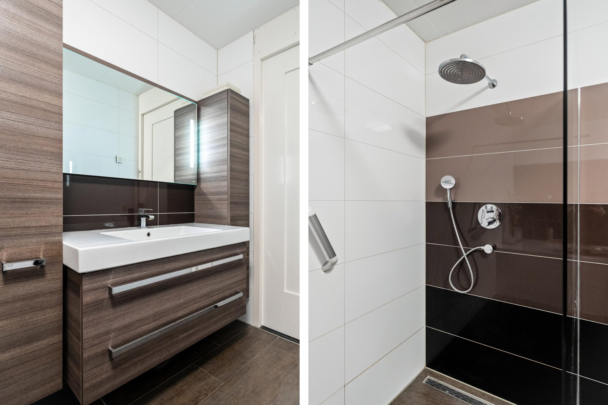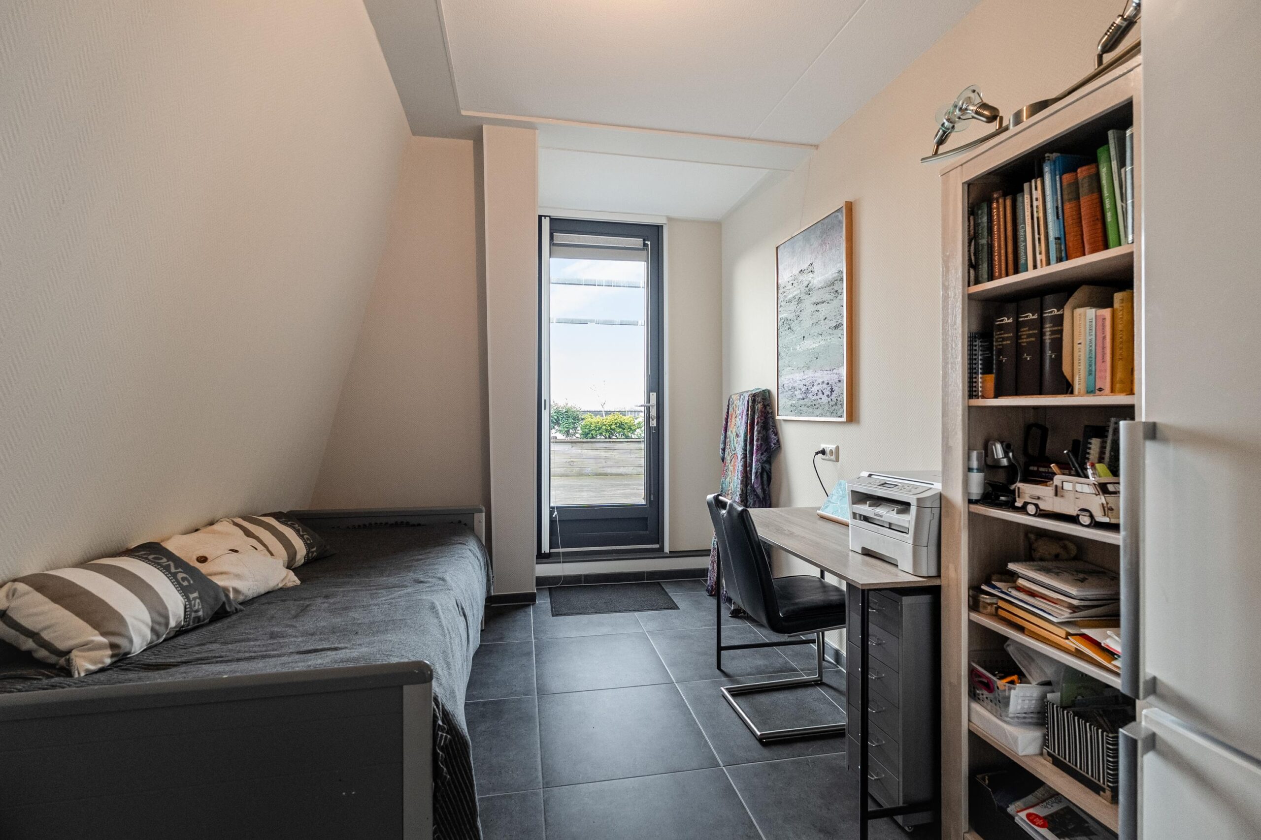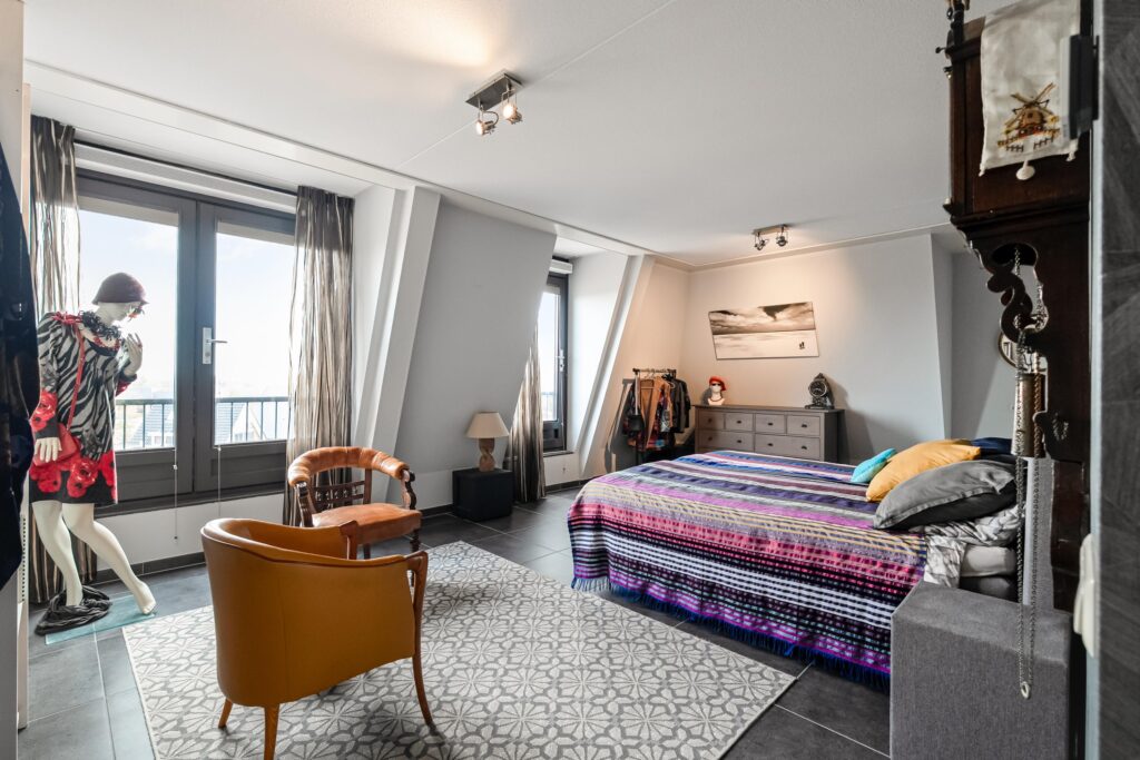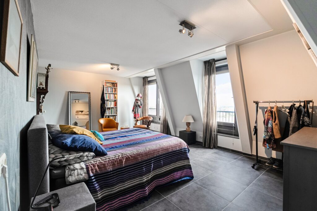 Het appartement beschikt over twee ruime slaapkamers. De master bedroom is bijzonder royaal en voorzien van een Frans balkon. De tweede slaapkamer biedt eveneens toegang tot het dakterras en is multifunctioneel in te richten, bijvoorbeeld als werk- of hobbyruimte. De badkamer is luxe uitgevoerd en voorzien van een inloopregendouche, een wastafel met meubel en een toilet. Daarnaast is er een separaat toilet aanwezig. Het geheel is afgewerkt met een hoogwaardige tegelvloer met vloerverwarming, wat zorgt voor extra comfort en een moderne uitstraling.