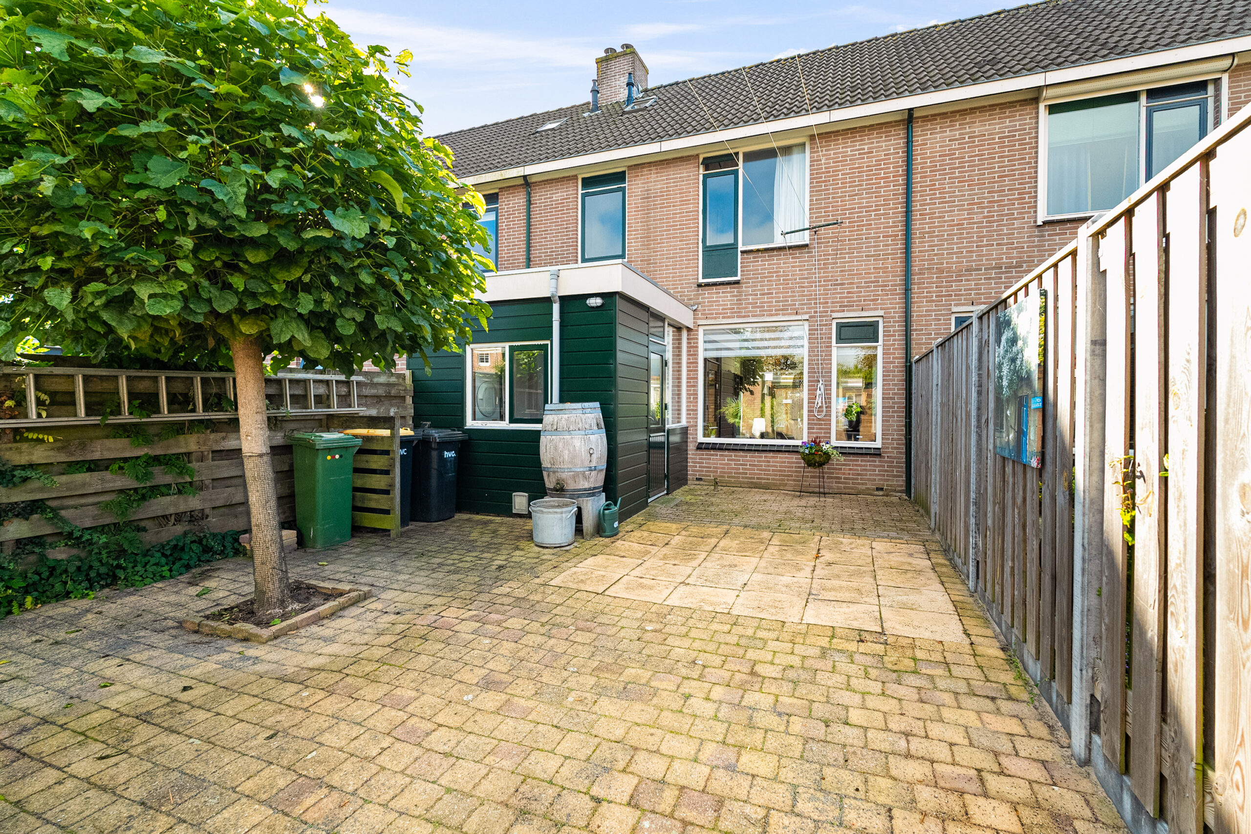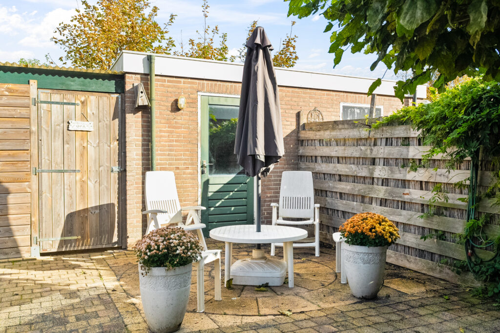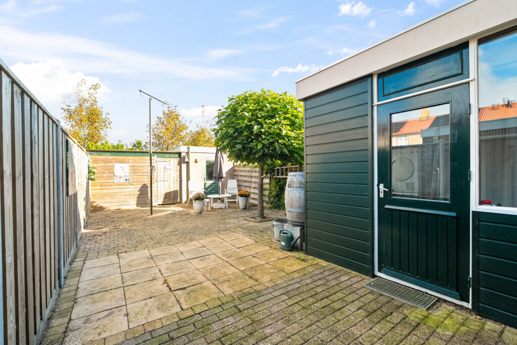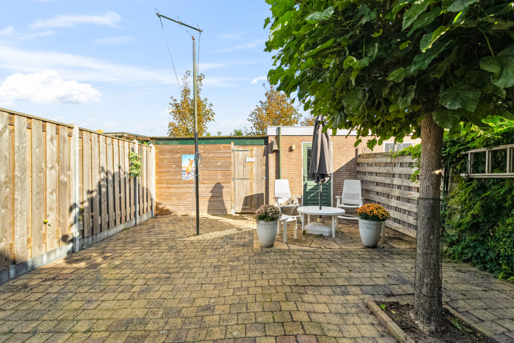 De achtertuin is onderhoudsvriendelijk betegeld en voorzien van een grotendeels nieuwe schutting (2022). Achterin de tuin bevinden zich een stenen berging én een houten berging, ideaal voor fietsen of tuingereedschap. De voortuin is fraai aangelegd en geeft direct een verzorgd aanzicht.