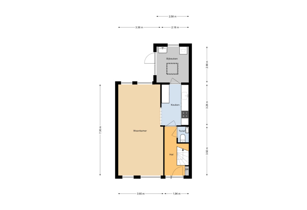 Via de entree aan de voorzijde bereikt u de hal met trapopgang, meterkast en modern toilet. Het toilet is volledig betegeld en voorzien van een hangend closet en fonteintje. Vanuit de hal betreedt u de moderne keuken, ingericht met combi-oven, koelkast, vriezer, vaatwasser, afzuigkap, 5-pits gasfornuis en ruime kastruimte. De lichte doorzon woonkamer is netjes afgewerkt en voorzien van radiatoren. In de bijkeuken bevindt zich de witgoedaansluiting en een praktische wasbak.