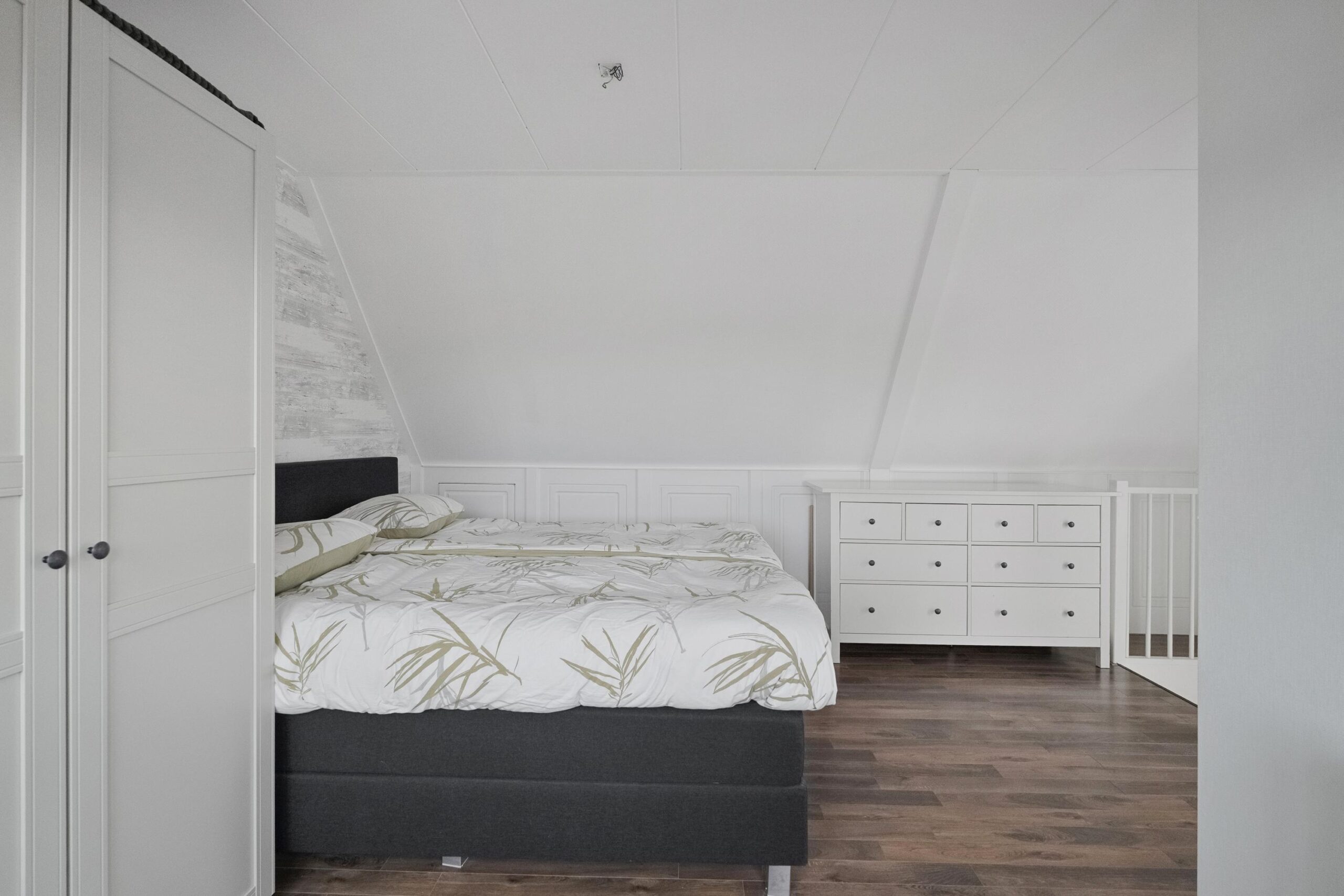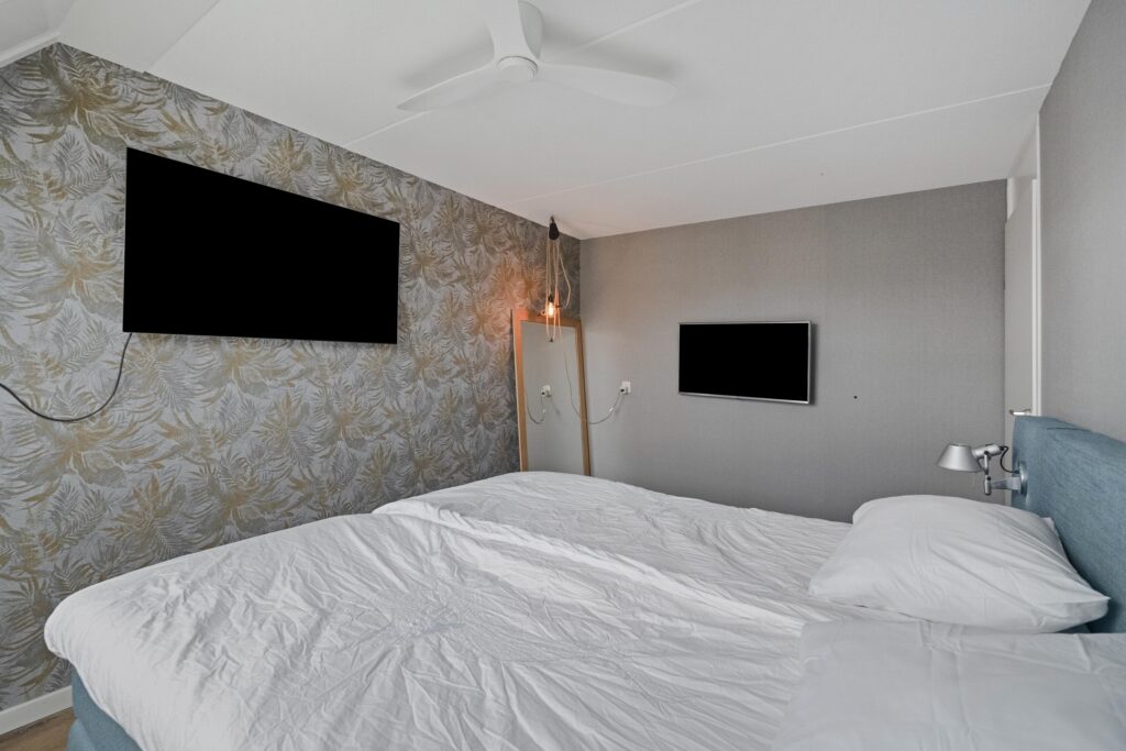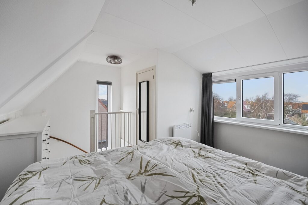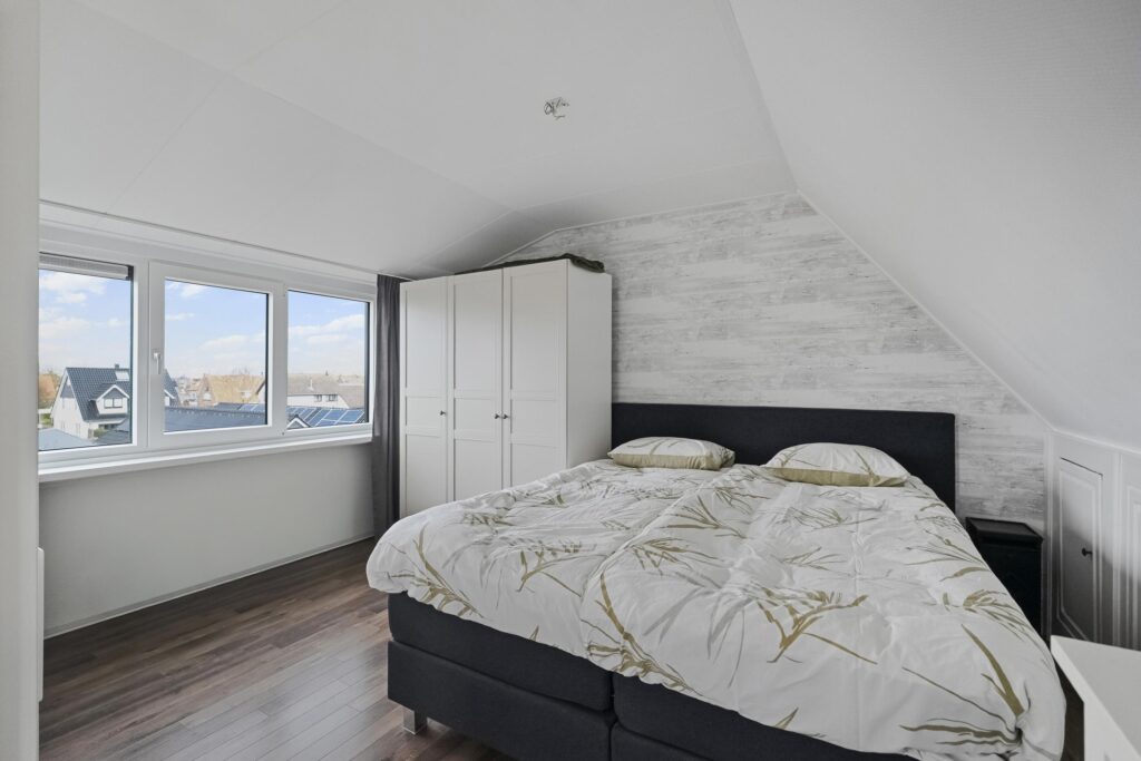 De overloop geeft toegang tot drie slaapkamers en de badkamer. Er zijn twee ruime kamers en één compactere kamer, geschikt als kinder-, werk- of hobbykamer. De moderne badkamer (2024) is compleet uitgevoerd met een douche, dubbele wastafel met meubel, designradiator en elektrische vloerverwarming.