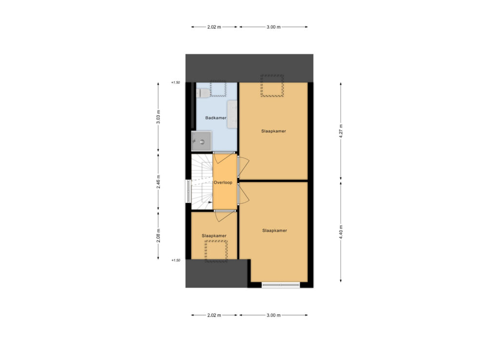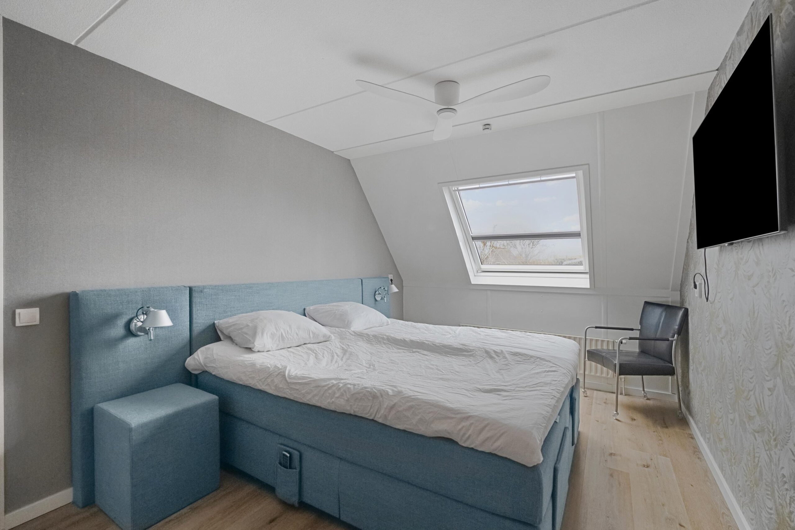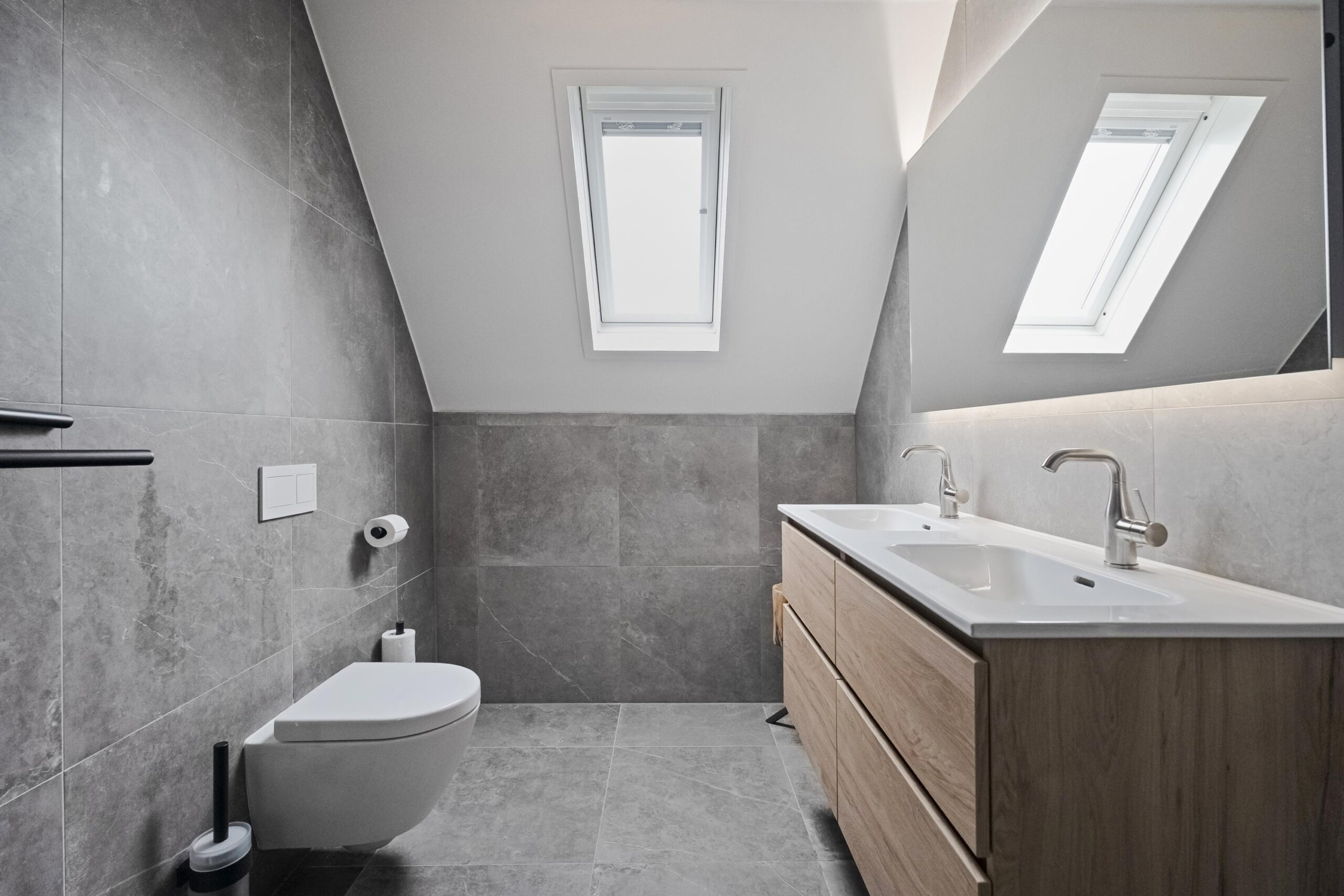 De overloop geeft toegang tot drie slaapkamers en de badkamer. Er zijn twee ruime kamers en één compactere kamer, geschikt als kinder-, werk- of hobbykamer. De moderne badkamer (2024) is compleet uitgevoerd met een douche, dubbele wastafel met meubel, designradiator en elektrische vloerverwarming.