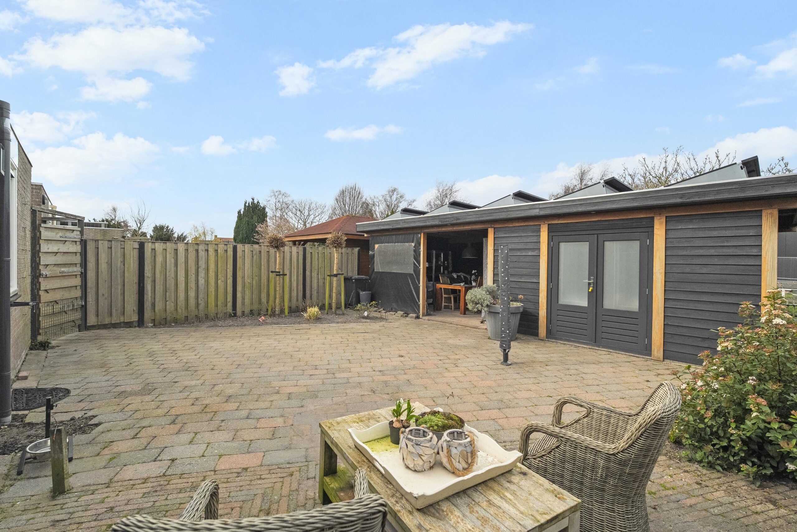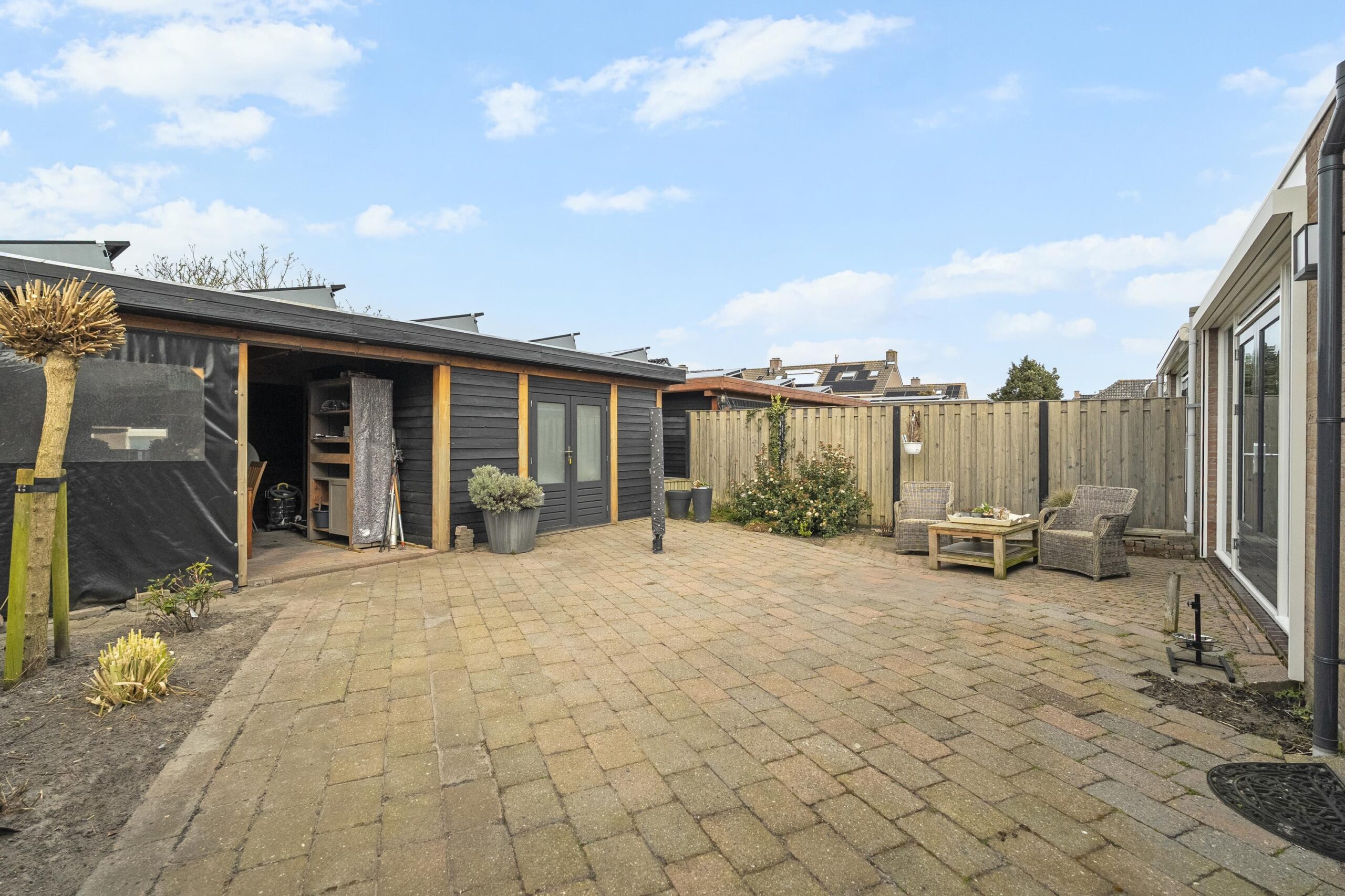 Aan de voorzijde biedt de woning een verzorgde voortuin en een ruime oprit. Via de achterom bereikt u de achtertuin, keurig aangelegd en voorzien van een overkapping met praktische berging , ideaal voor extra opbergruimte of een gezellige buitenplek.