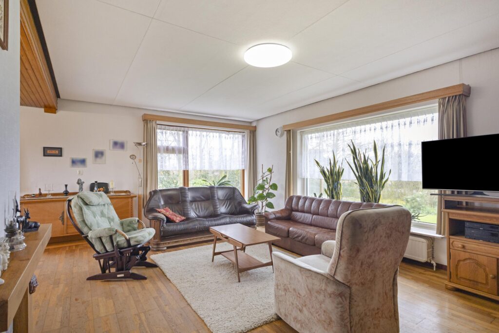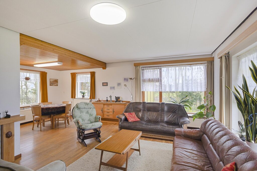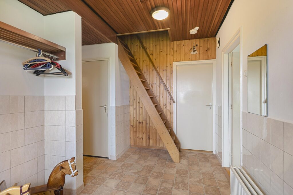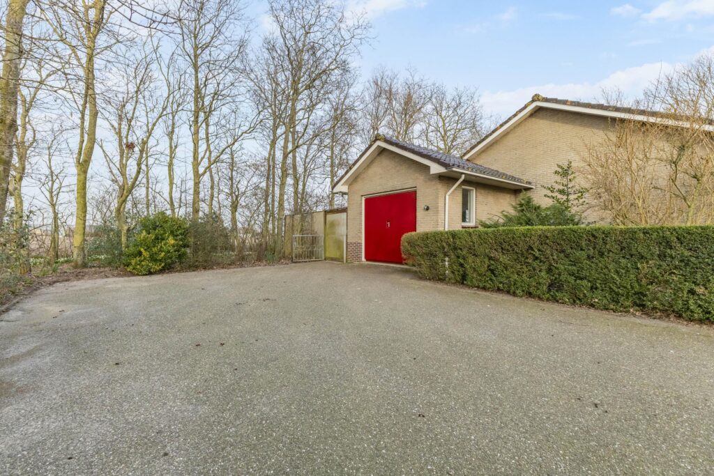 Wat deze woning extra aantrekkelijk maakt, is de praktische indeling op de begane grond. Hier bevinden zich de slaapkamers en de badkamer, wat gelijkvloers wonen mogelijk maakt. Op de eerste verdieping bevindt zich nog een slaapkamer. Daarnaast beschikt de woning over een ruime inpandige garage van circa 25 m², ideaal voor hobbyisten en opslag.