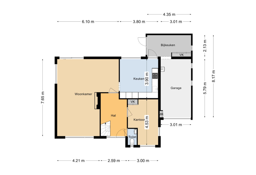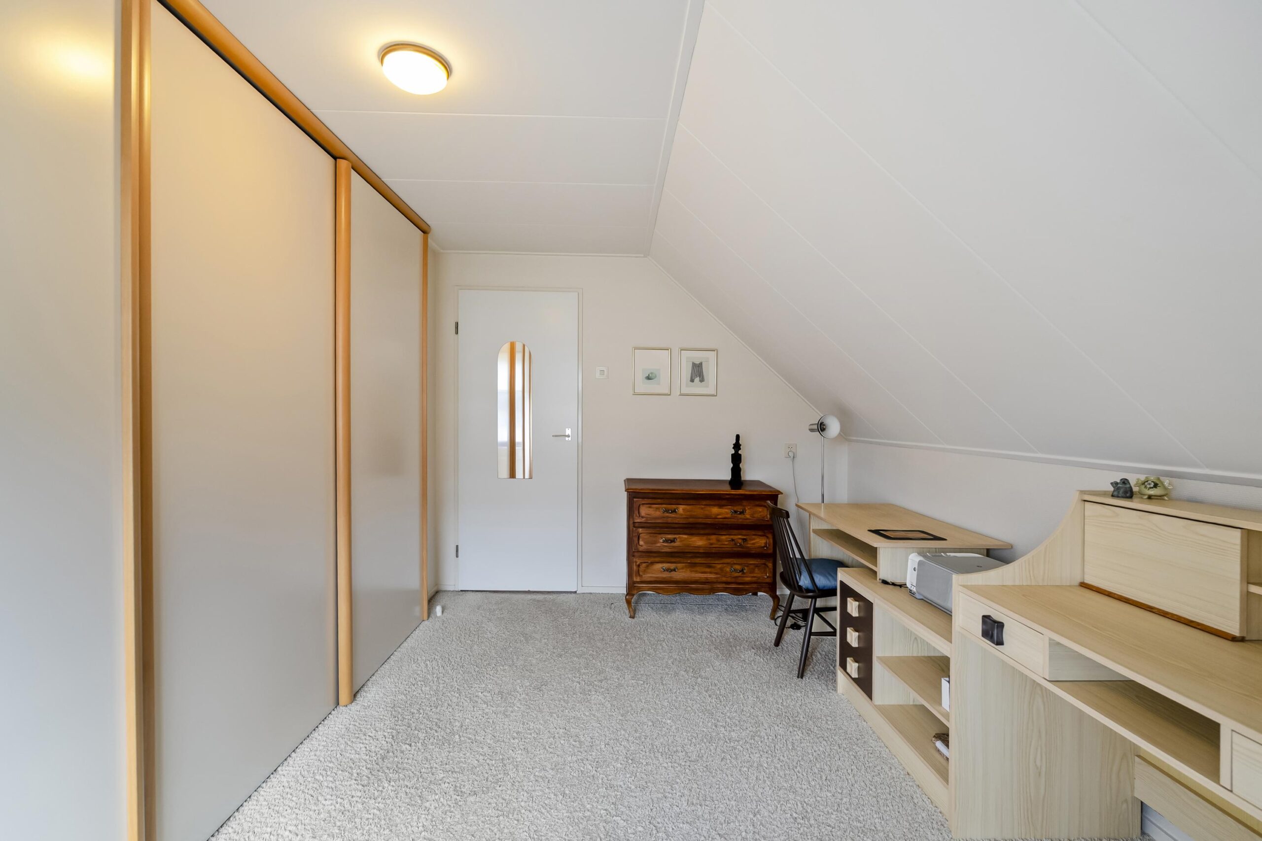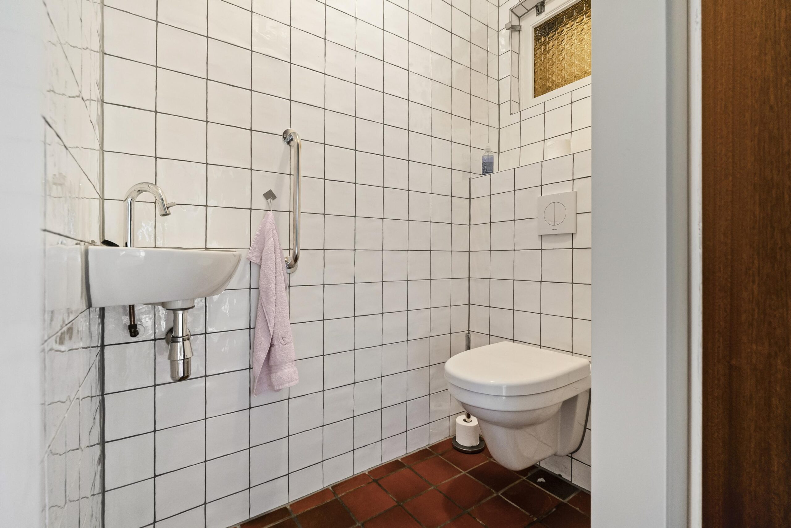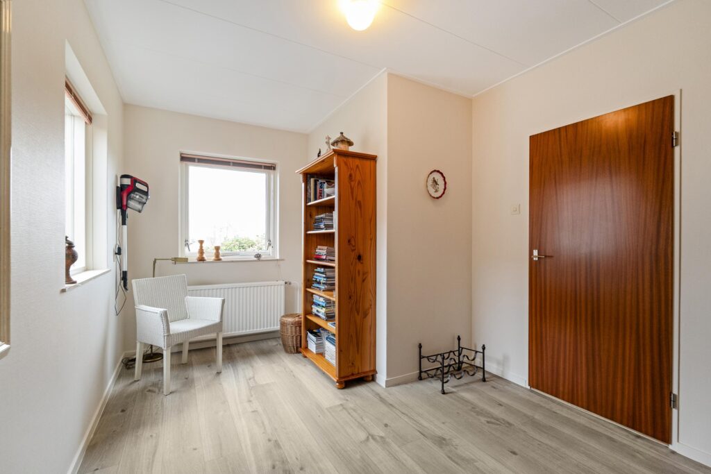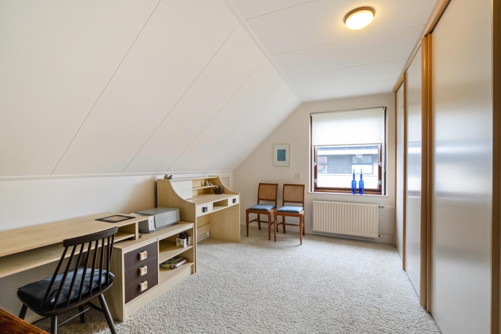 Via de entree aan de voorzijde betreedt u de ruime hal met trapopgang, modern toilet en toegang tot de slaapkamer/kantoor en de woonkamer. Het toilet is voorzien van een hangend closet en fonteintje. De slaapkamer/kantoor op de begane grond beschikt over een laminaatvloer, vaste kast en radiatoren, ideaal als thuiswerkplek of gelijkvloerse slaapkamer.