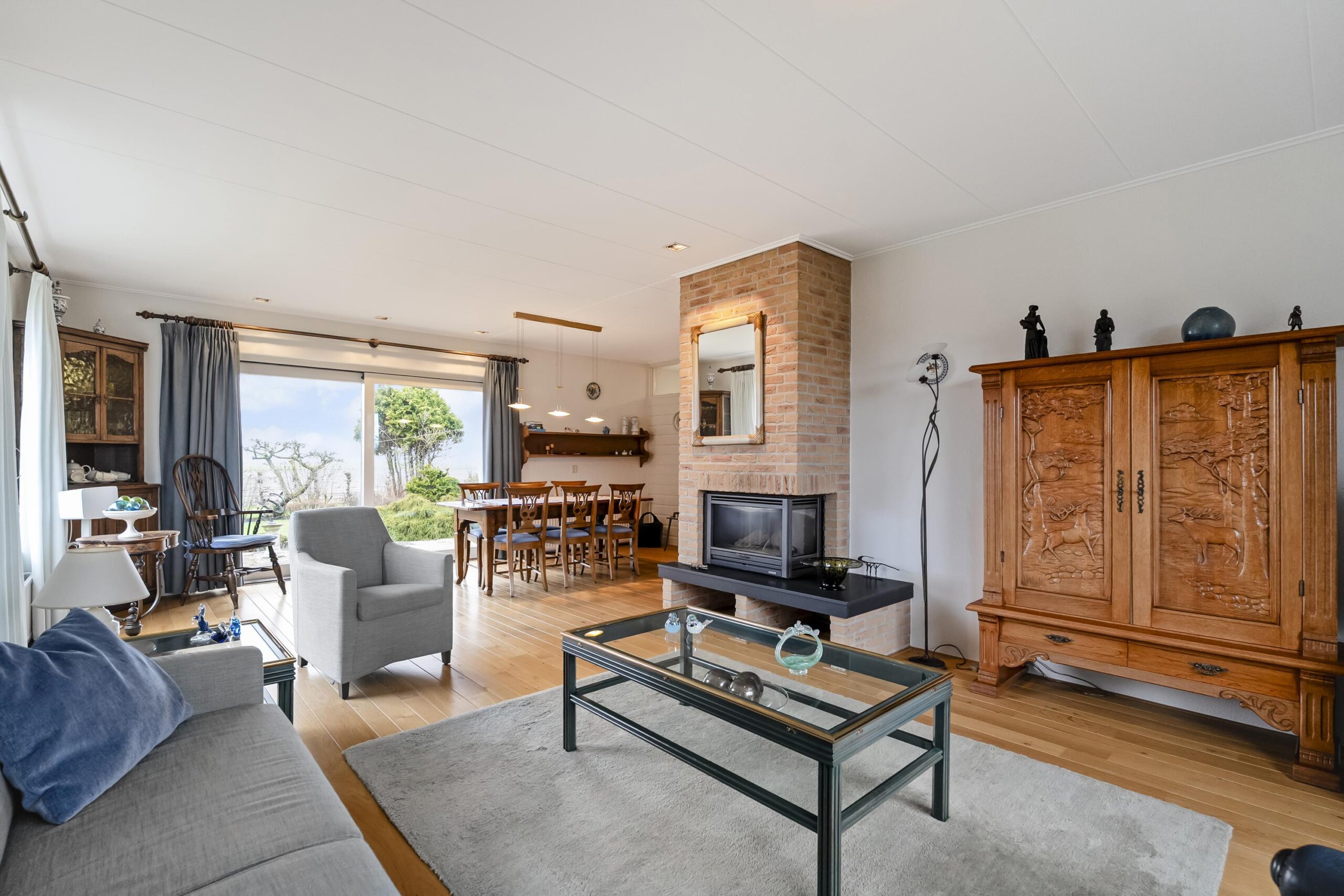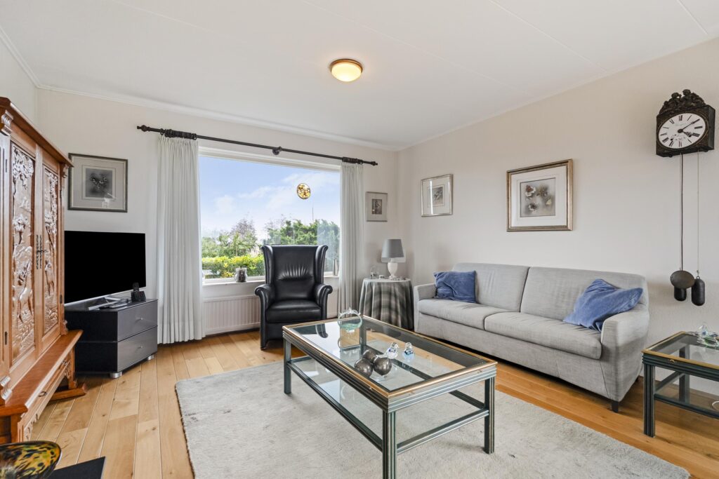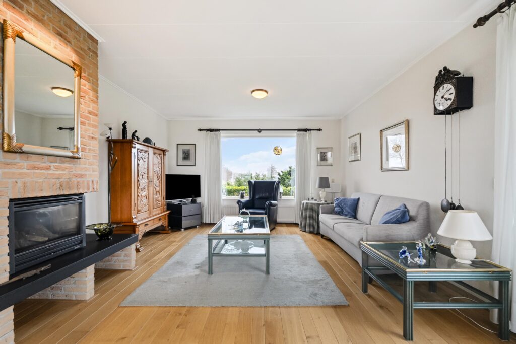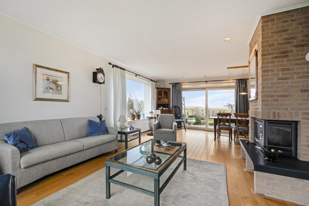 De royale woonkamer is heerlijk licht dankzij de grote raampartijen. De ruimte is afgewerkt met een parketvloer en wordt verwarmd middels radiatoren en een sfeervolle gashaard. Via de schuifpui loopt u zo de achtertuin in, waar u geniet van een fantastisch vrij uitzicht over de bollenvelden. Een groot zonnescherm zorgt voor aangename schaduw op zonnige dagen.