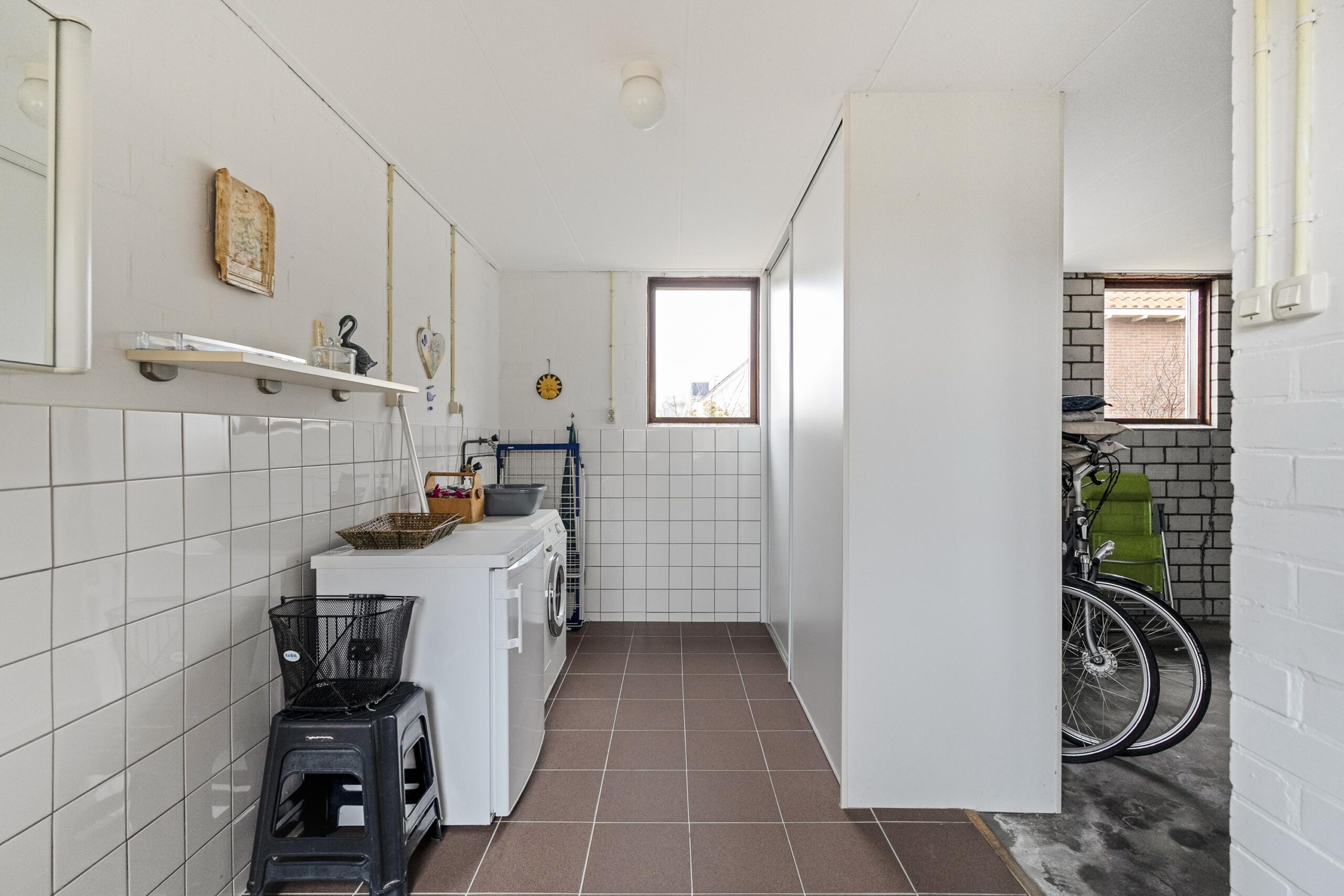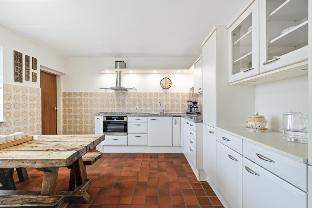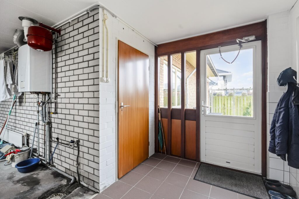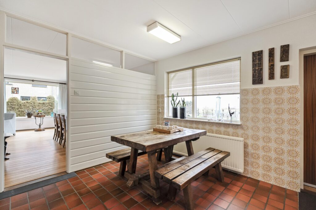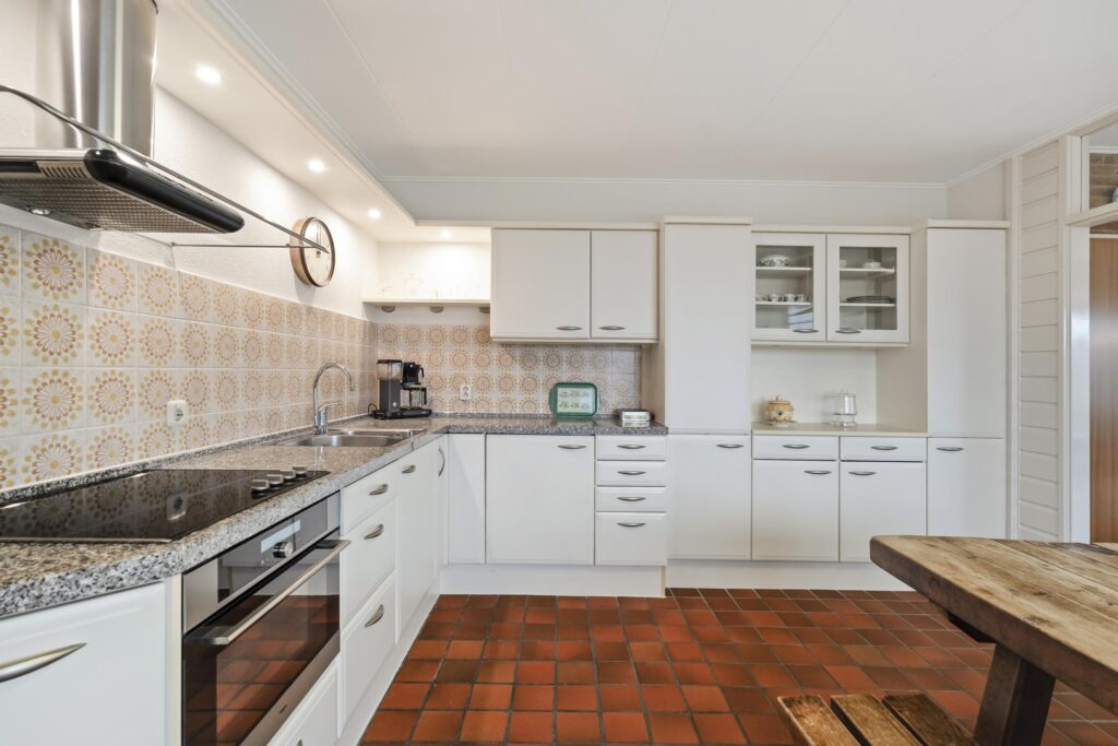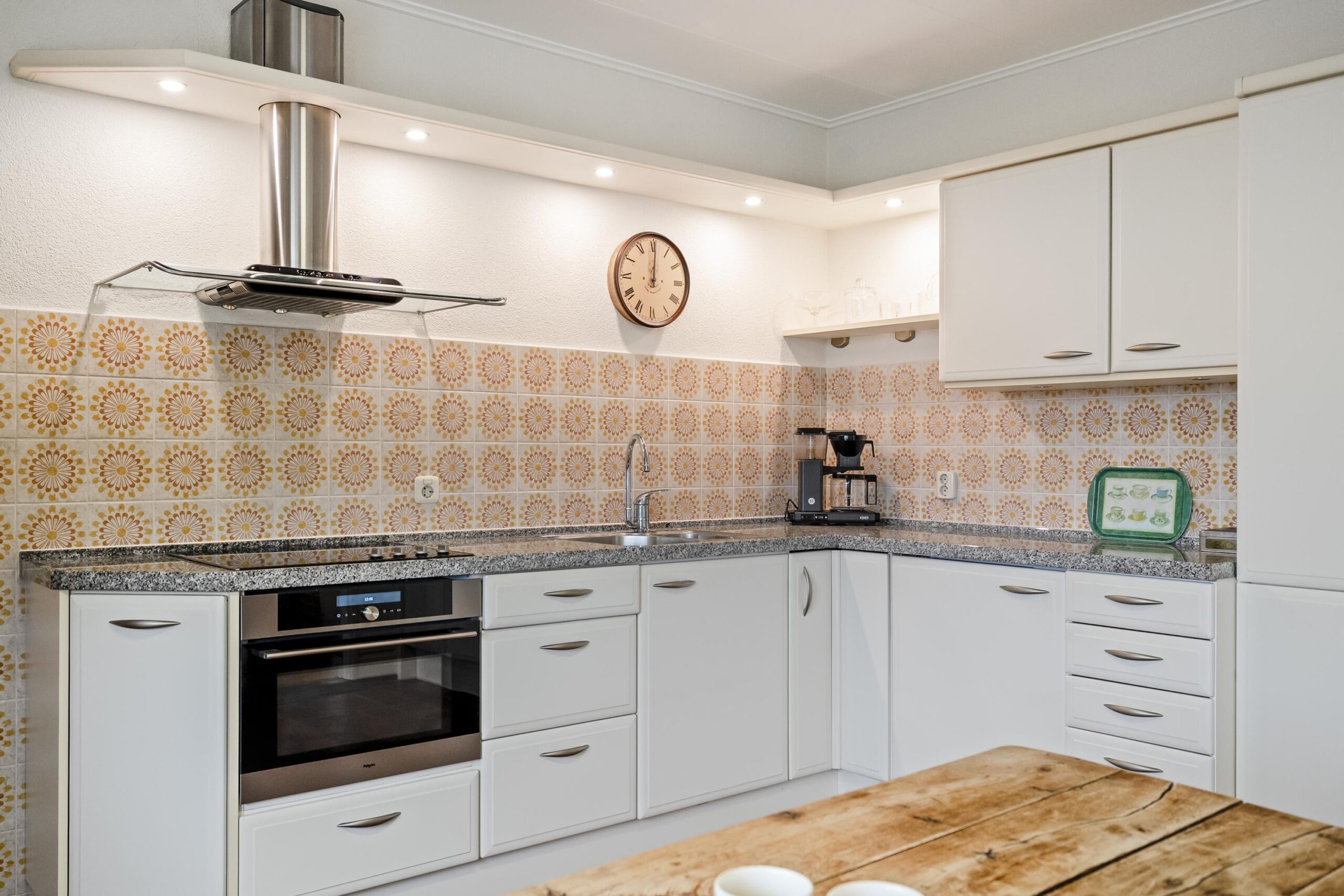 De woonkeuken grenst aan de woonkamer en is compleet uitgevoerd met een combi-oven, inductiekookplaat, afzuigkap en koelkast. Vanuit de keuken bereikt u de bijkeuken en de garage. De bijkeuken is voorzien van de witgoedaansluiting, in de garage bevindt zich de cv-opstelling. De geïsoleerde garage biedt ruimte voor het stallen van een auto en is eveneens verwarmd.