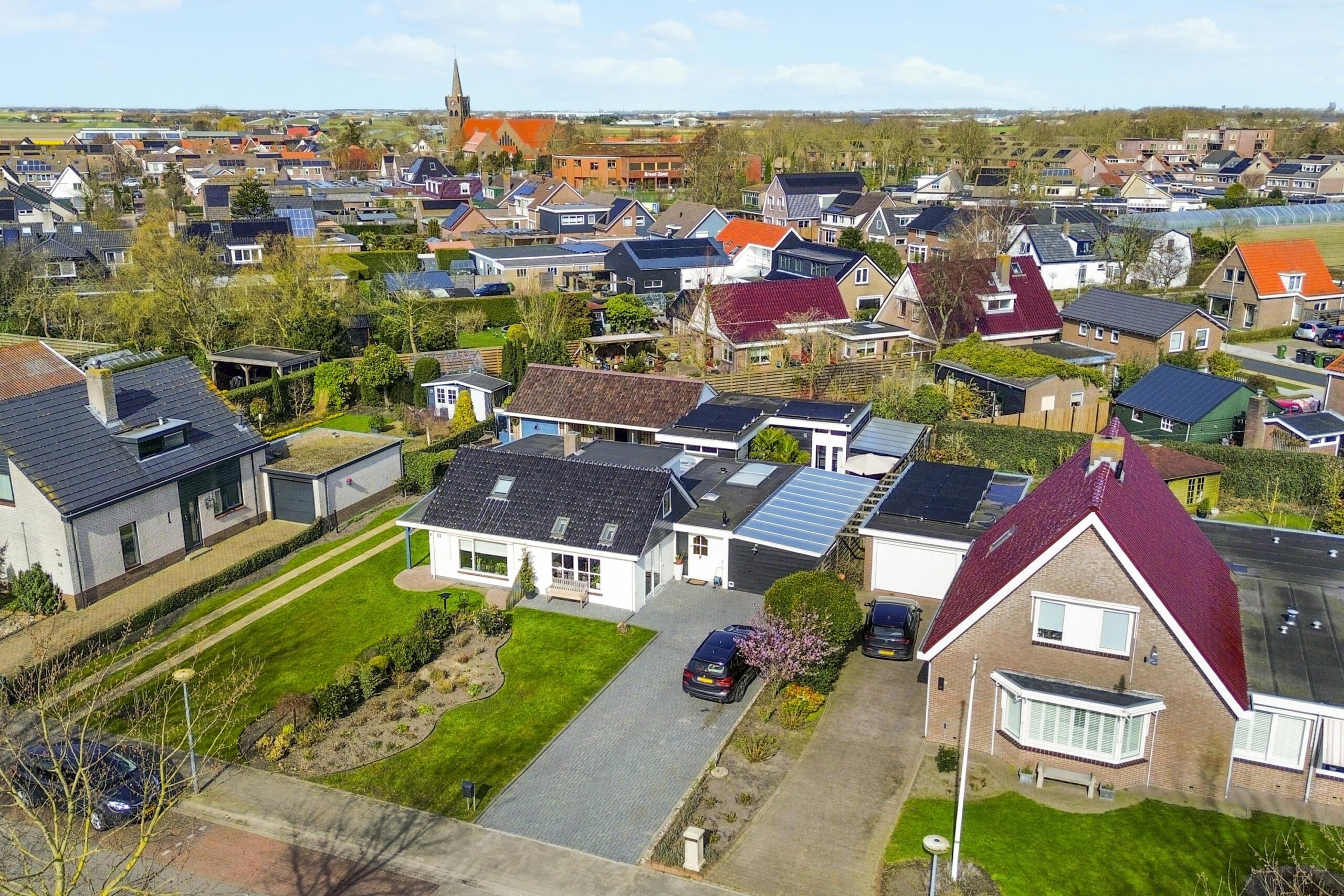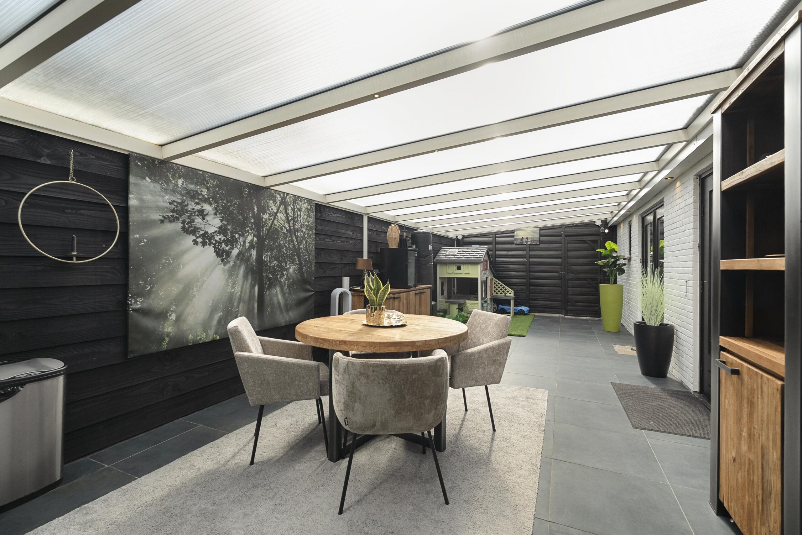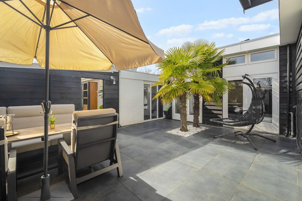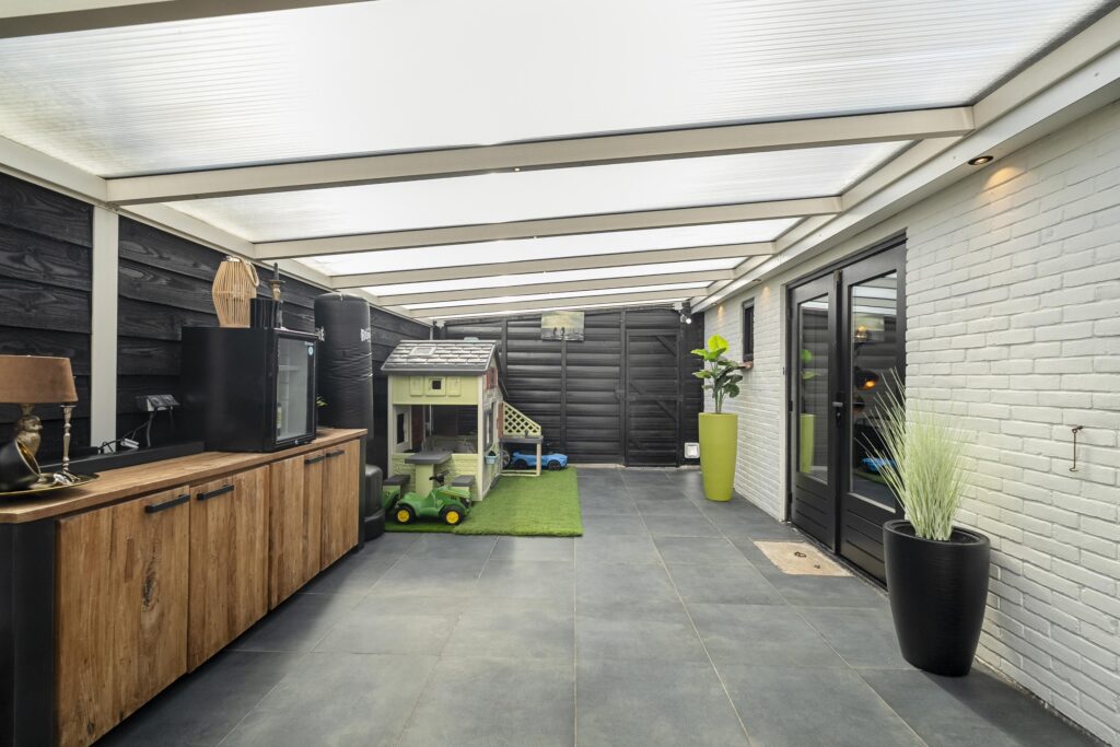De woning heeft een grote voortuin met diverse vaste beplanting en een riant en strak gazon. De lange oprit heeft plek voor meerdere auto's. Achter is een fijne patiotuin tussen de serre en de aanbouw met lekker veel privacy en ook zeer onderhoudsvriendelijk aangelegd. In de achtertuin is verder nog een grote schuur van zo'n 15 m² voor de nodige opbergruimte.