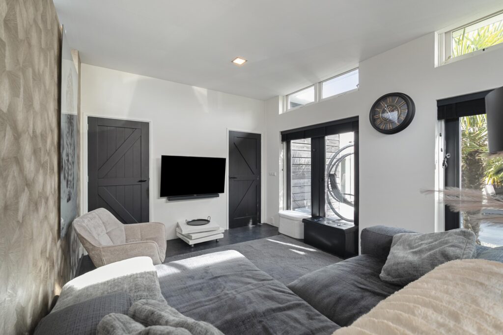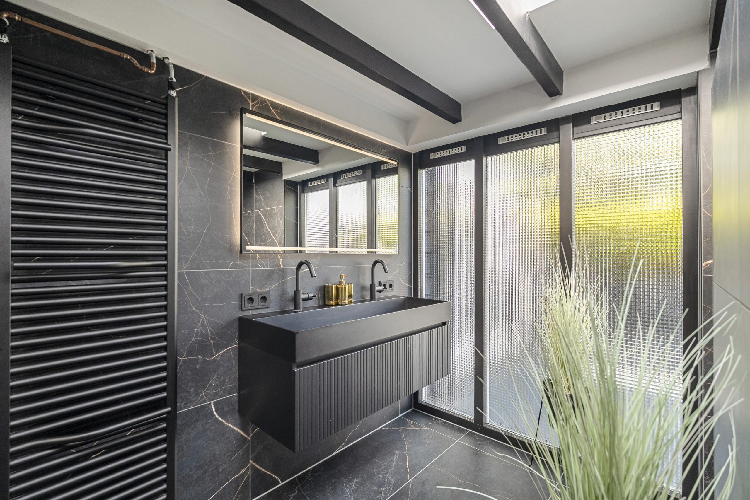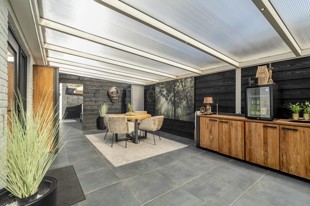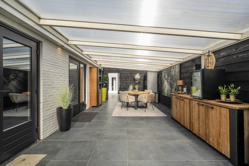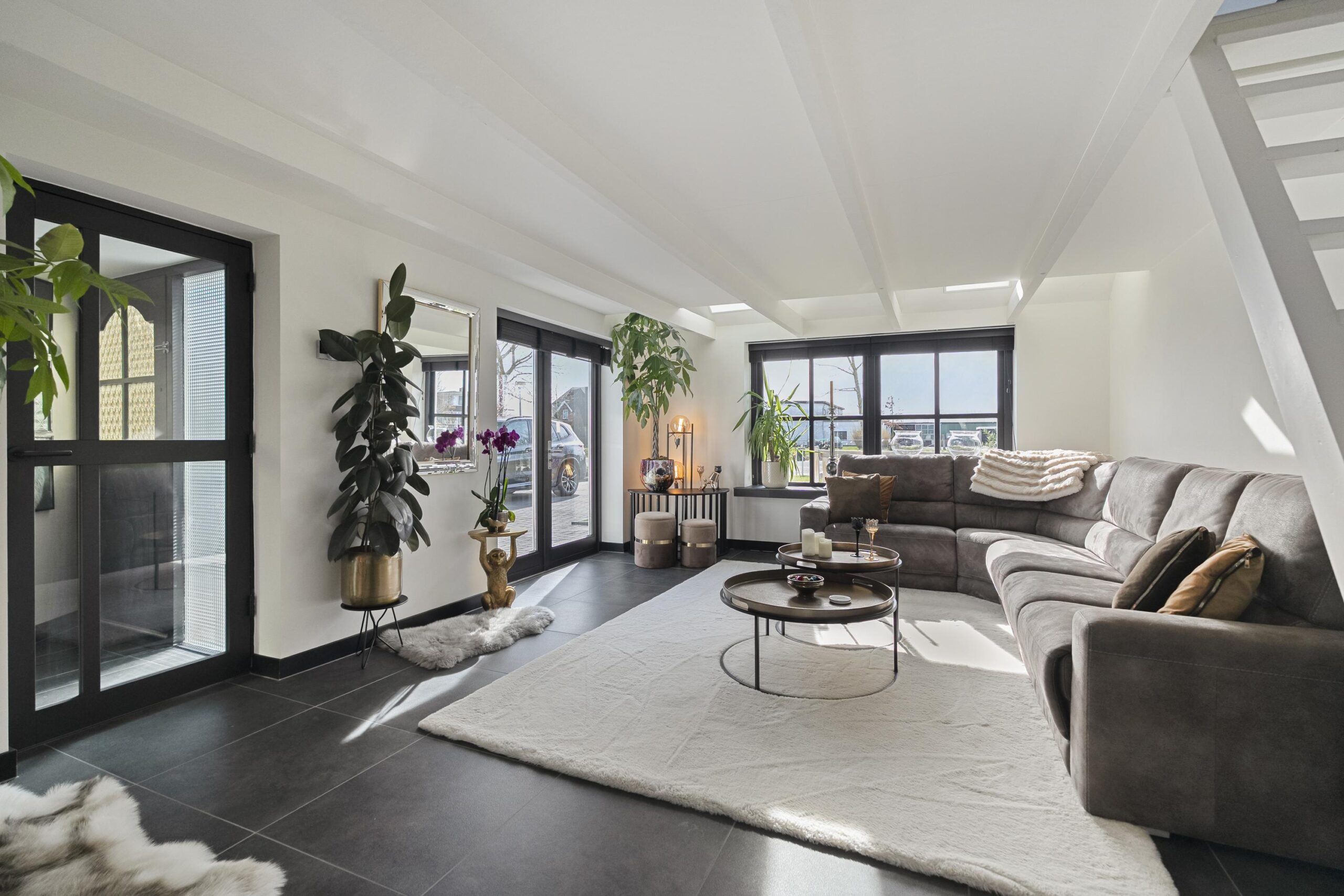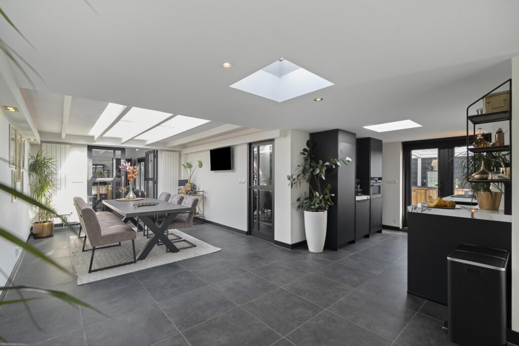 De entree is aan de voorzijde van de woning in een hal met meterkast en toilet. Het ultramoderne toilet heeft een wandcloset en is modern betegeld. Het grootste gedeelte van de begane grond heeft een solide tegelvloer met vloerverwarming, wat de woning een luxe en moderne uitstraling geeft. Door de vele ramen, lichtkoepels en bovenlichten is de begane grond een fijne lichte ruimte. In de woonkamer is de open trap naar de verdieping. De open keuken is voorzien van de nodige apparatuur waaronder een inductiekookplaat met interne afzuiging, vaatwasser, combi-oven, koelkast en vriezer. Een bijkeukentje met witgoedopstelling en dan de ruime en moderne badkamer, met doorloopdouche en dubbele wastafel. De achtergelegen aanbouw is volledig geïsoleerd, heeft drie openslaande deuren en de tweede, lichte badkamer met inloopdouche, wastafel en toilet. Verder maar liefst twee slaapkamers, waarvan één met vaste kastenwand. Aan de zijkant van de woning is nog een ruime serre aangebouwd.