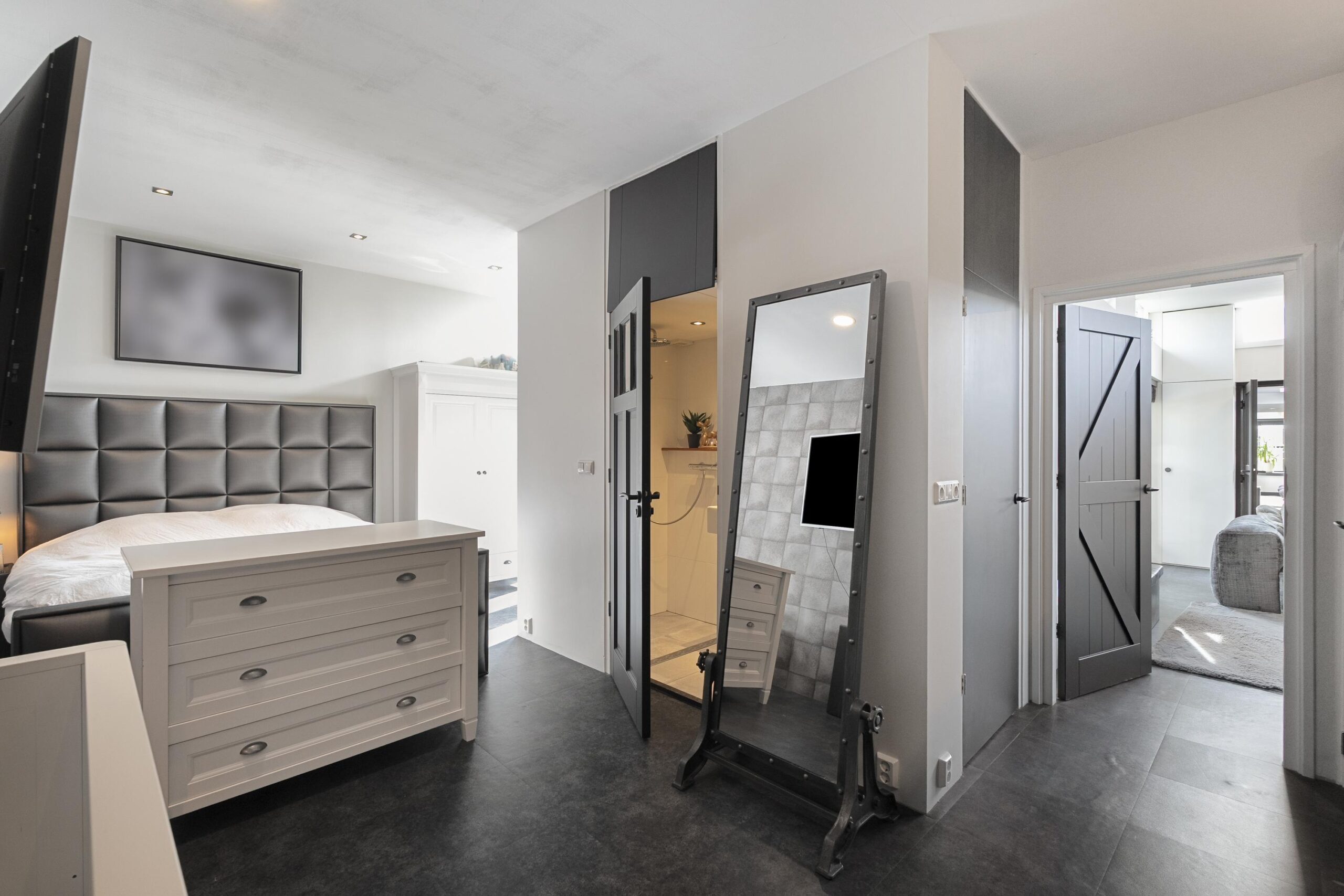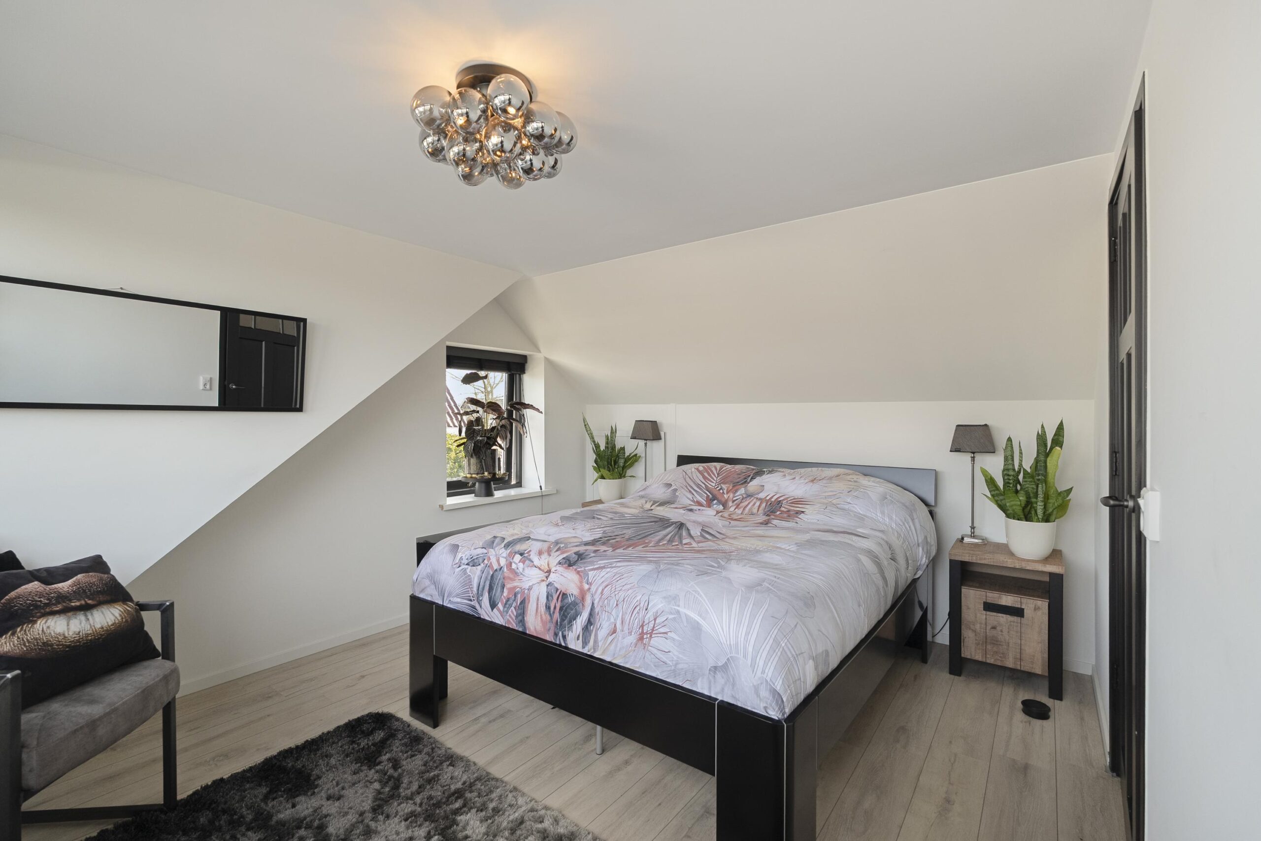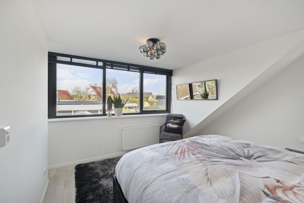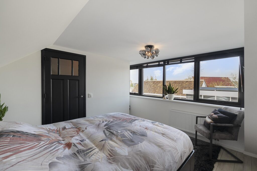 Overloop en een grote slaapkamer in een ruime dakkapel. Door de dakkapel heeft de slaapkamer ook lekker veel natuurlijk licht en voelt ze lekker ruim aan.
