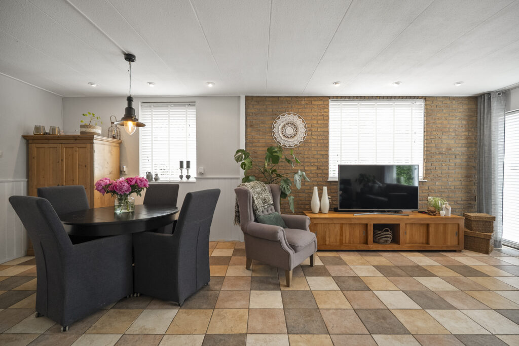 Bij binnenkomst in de hal, treft u de meterkast en de keurig betegelde toiletruimte aan. Vanuit deze hal komt u in een ruime woonkamer aan de voorzijde van de woning met open trap naar boven en de open keuken. Via de keuken is de eetkamer/achteruitbouw te bereiken. Deze (in 2005 aangebouwde) ruimte is heerlijk licht door de grote raampartijen, wat bijdraagt aan de algehele gezellige sfeer van de woning en geeft direct toegang tot de heerlijk ruime achtertuin op het zuidoosten. De gehele begane grondvloer is voorzien van vloerverwarming.