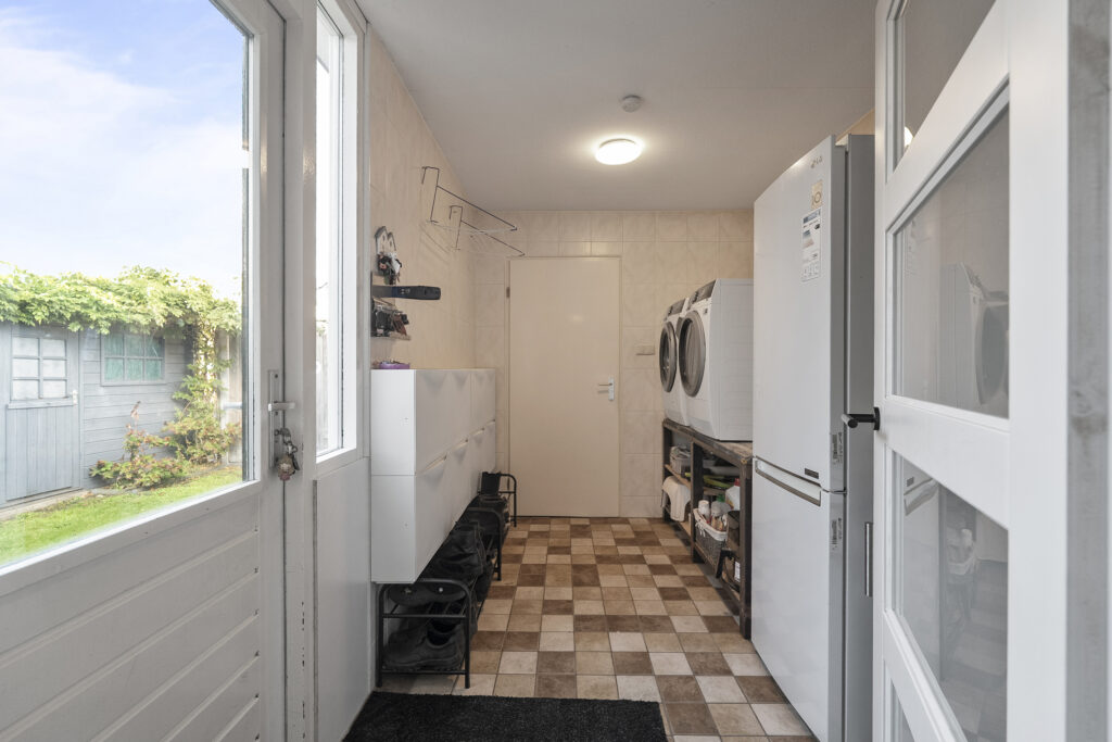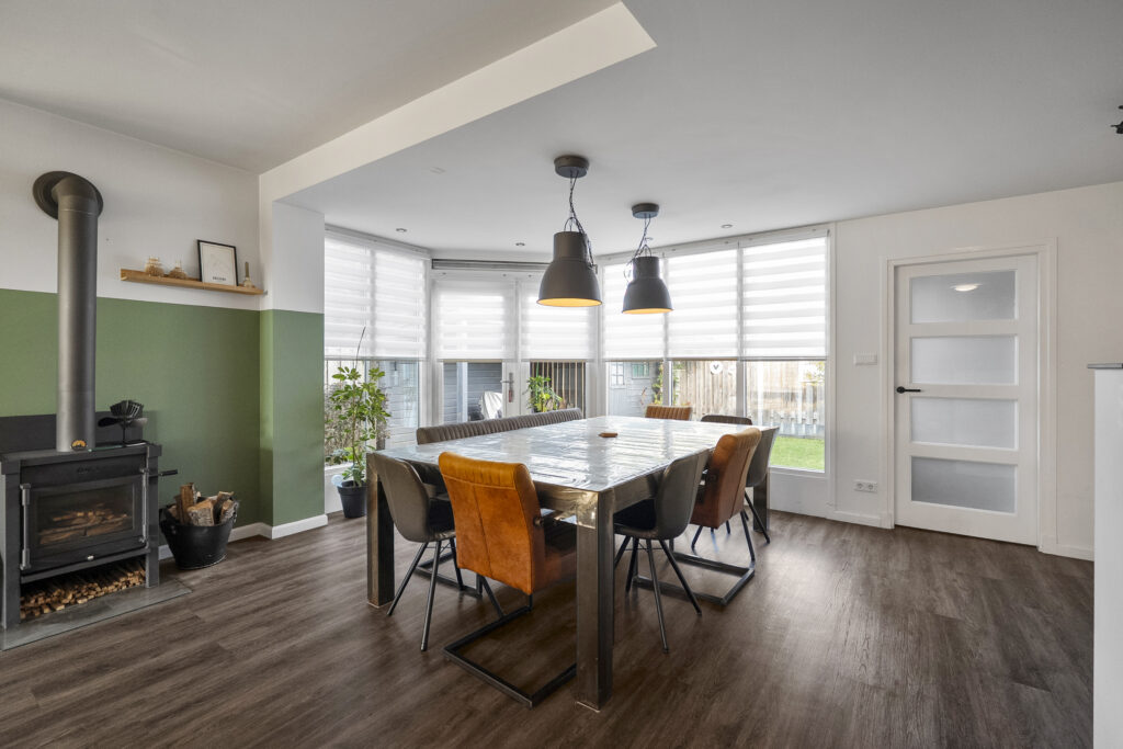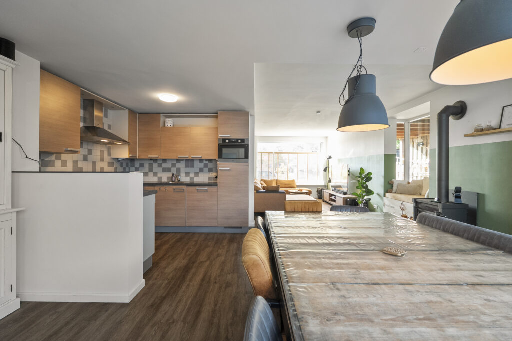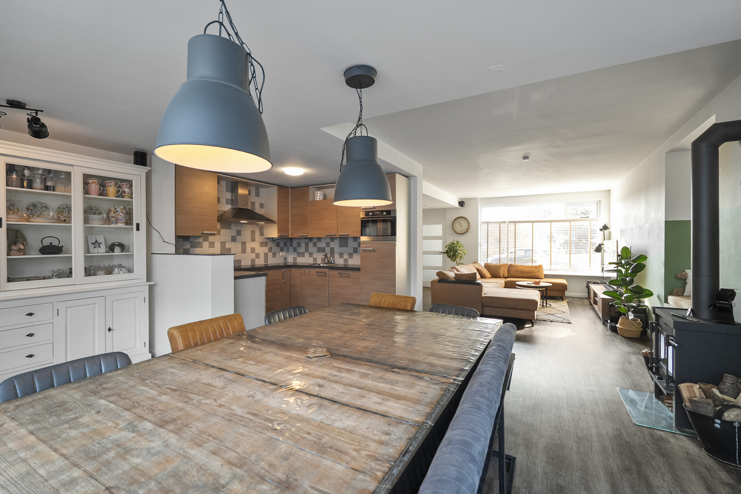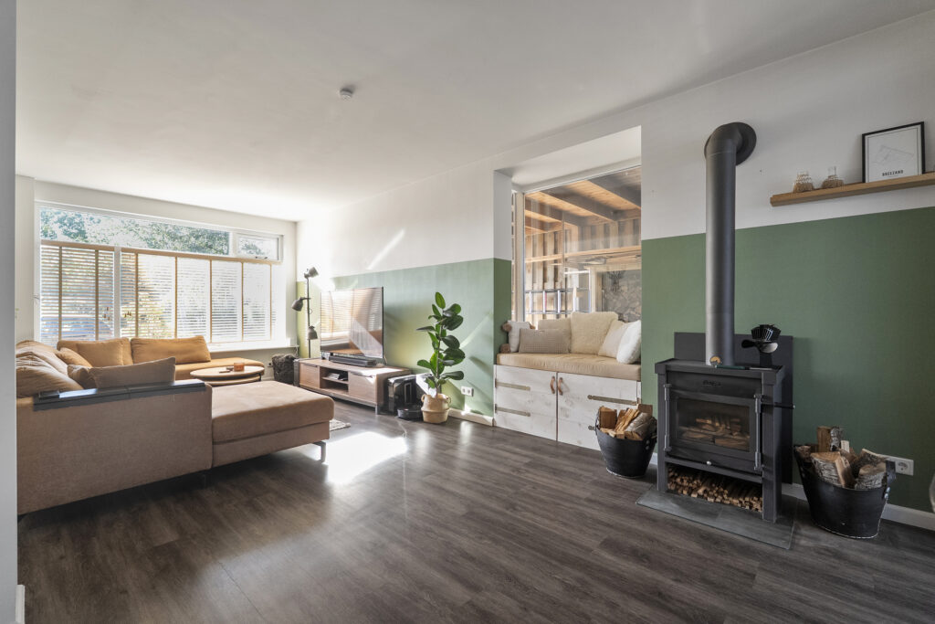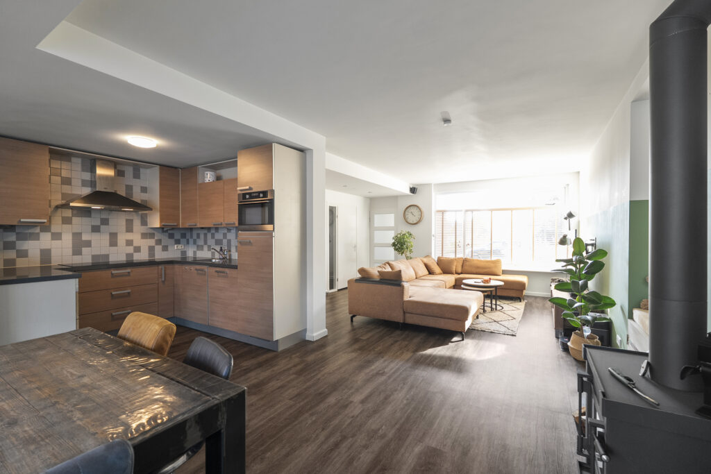 Binnen komend in de entree, vindt u een toiletruimte voorzien van een hangend closet met fontein en de meterkast. Via de woonkamer is de hal naar trap te bereiken. Ook is de woonruimte voorzien van een open hoekkeuken, openslaande deuren naar de tuin en een fraaie houthaard voor de knusse avonden. De keuken is voorzien van diverse inbouwapparatuur zoals een inductiekookplaat, combi-oven, vaatwasser, een koelkast en afzuigkap. In de keuken bevindt zich de deur naar de bijkeuken met daar een wasmachineaansluiting en doorgang naar de berging.