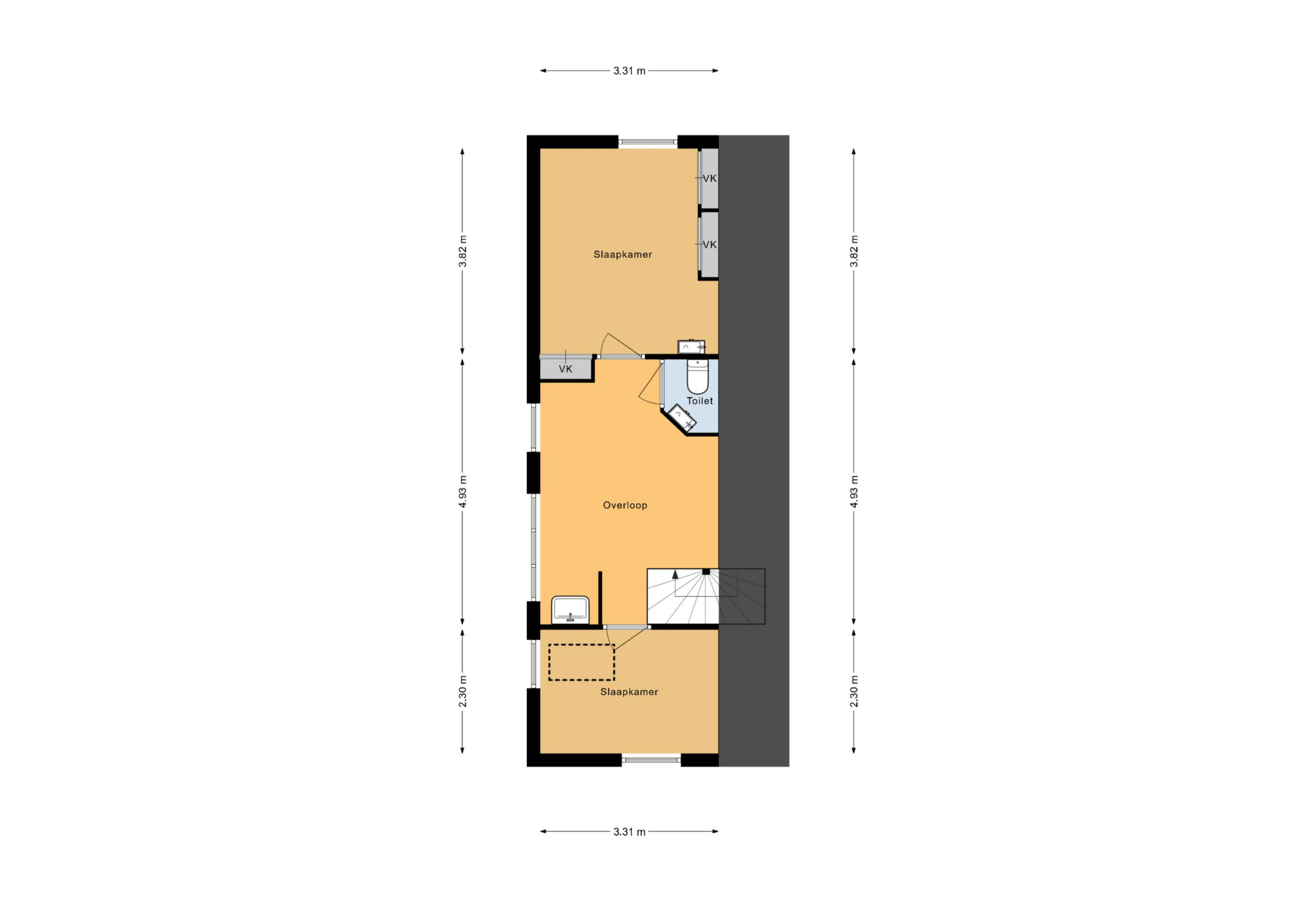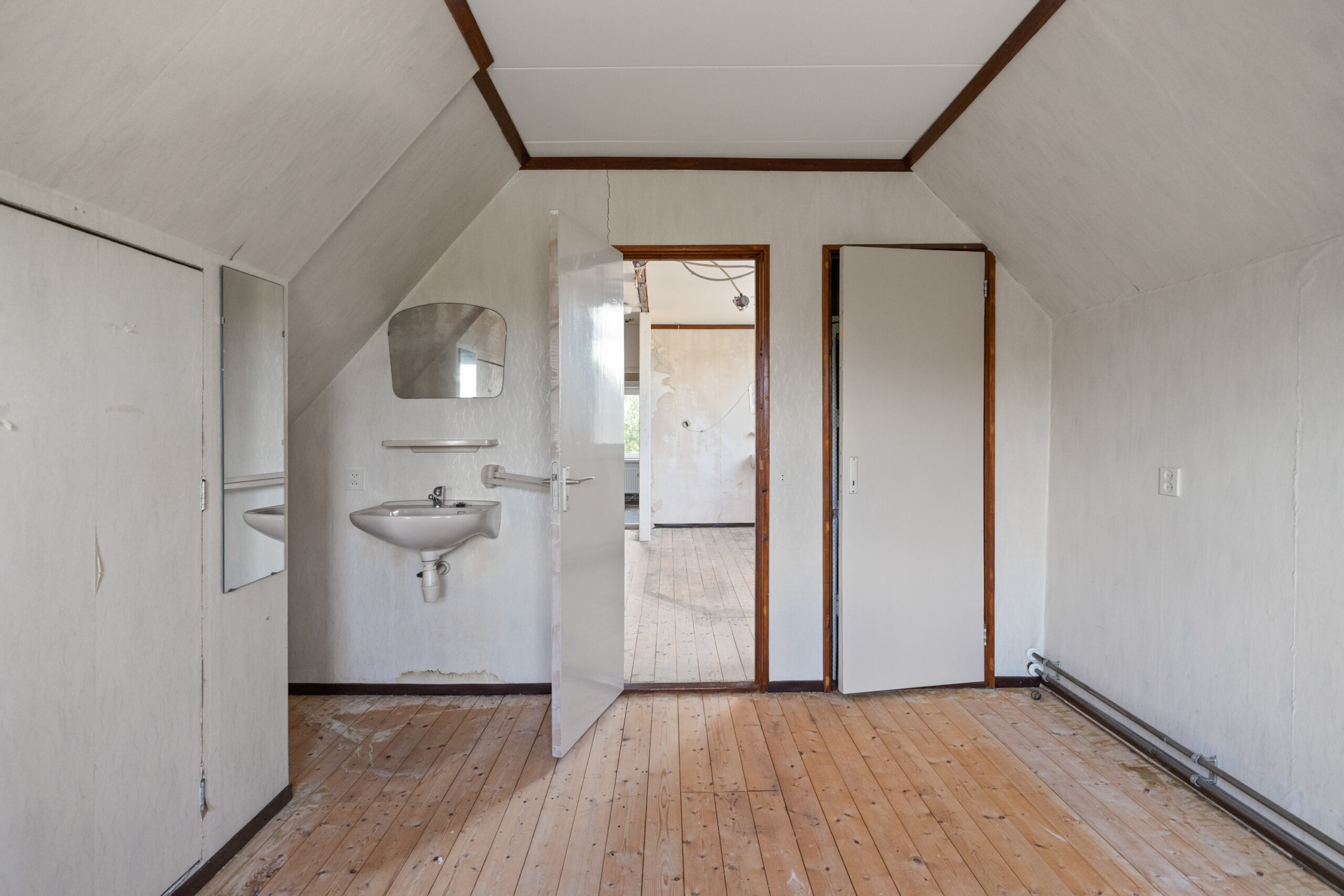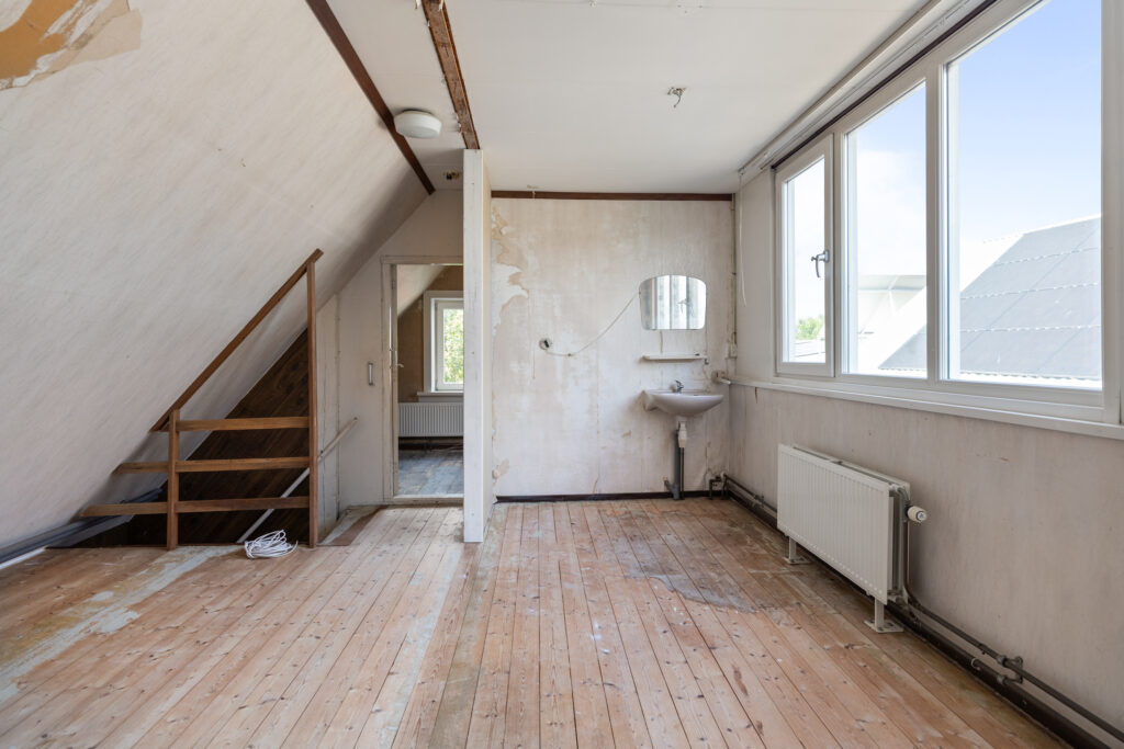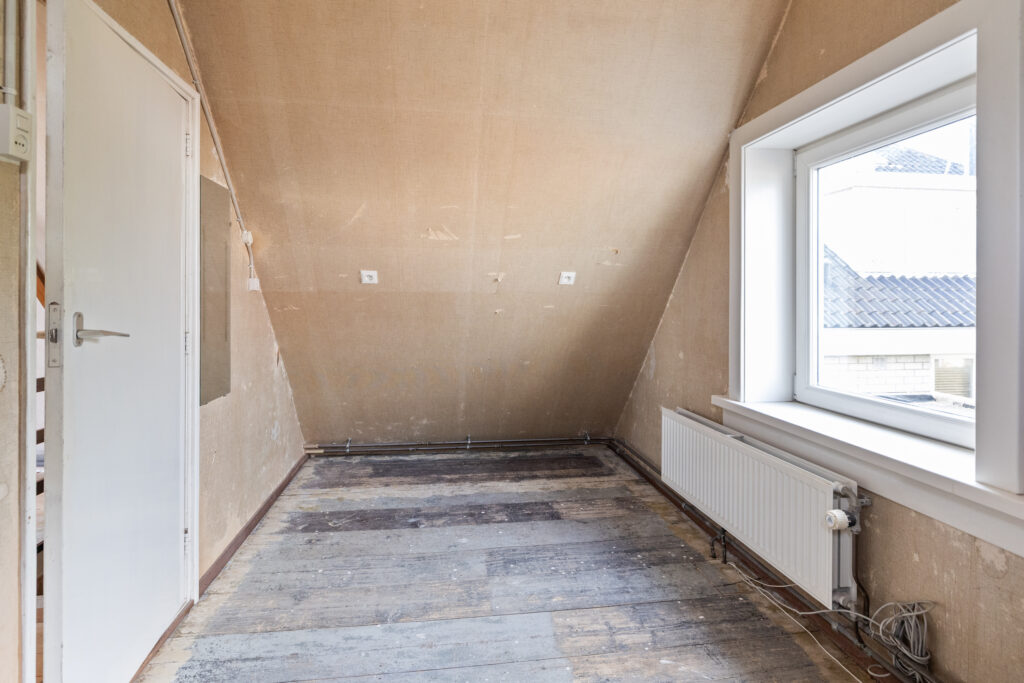 De verdieping is bereikbaar via een vaste trap. Op de overloop bevinden zich de deuren naar twee slaapkamers, een toilet en wastafelopstelling. De verdieping behoeft nog enige afwerking, dus u kunt hier nog naar eigen smaak aan de slag met indelen van wellicht grotere slaapkamers of een extra badkamer. Tevens is daar de toegang tot een vliering