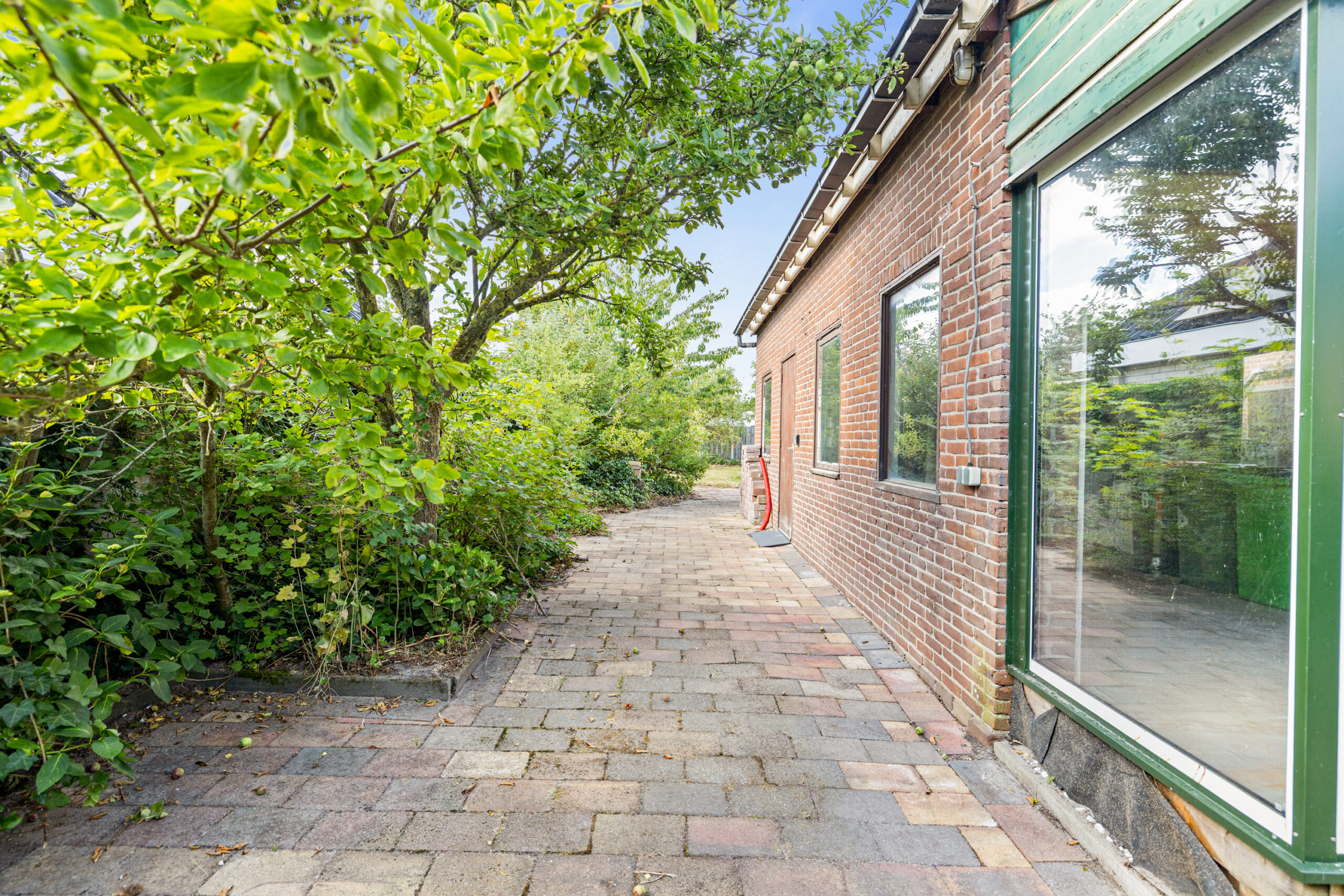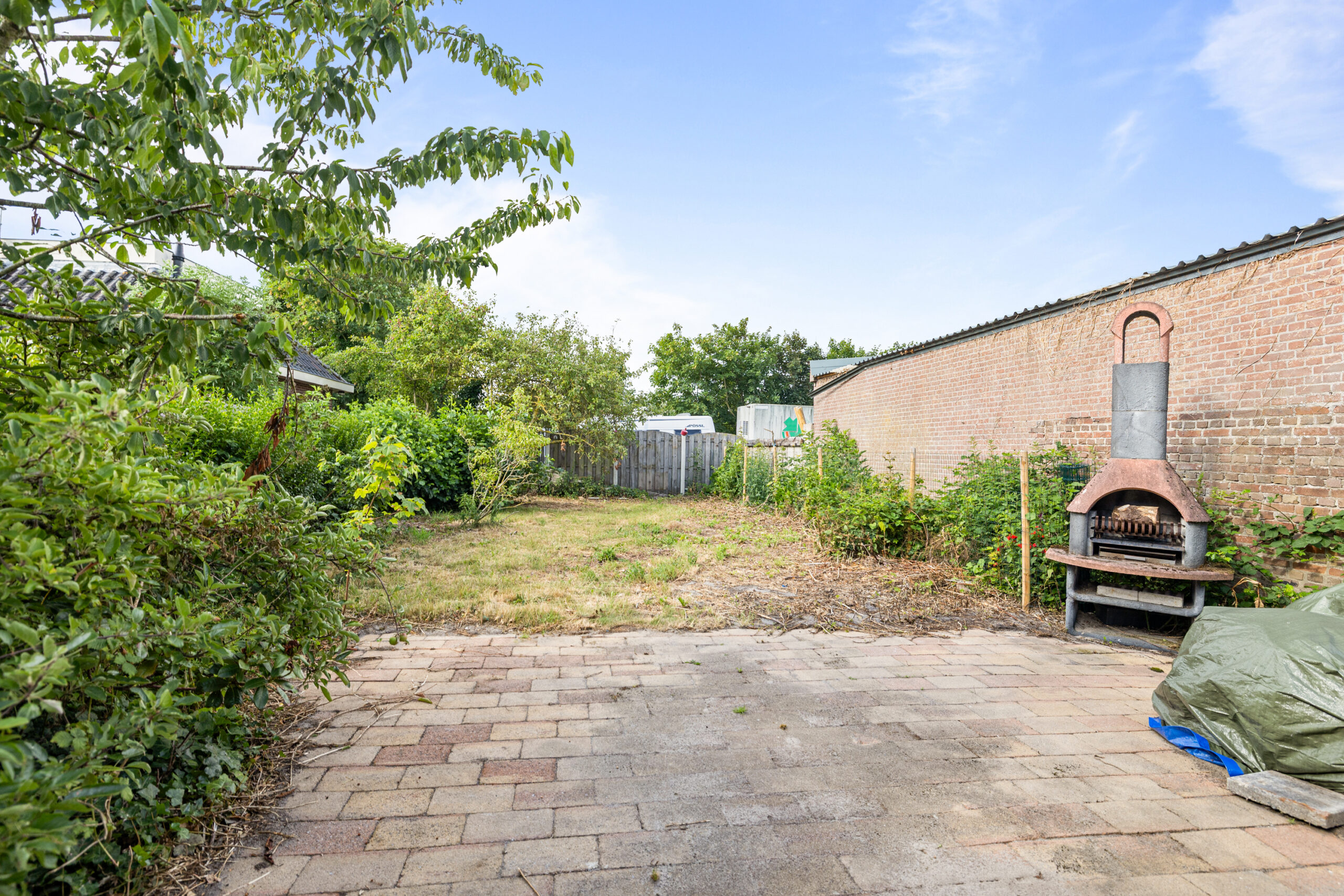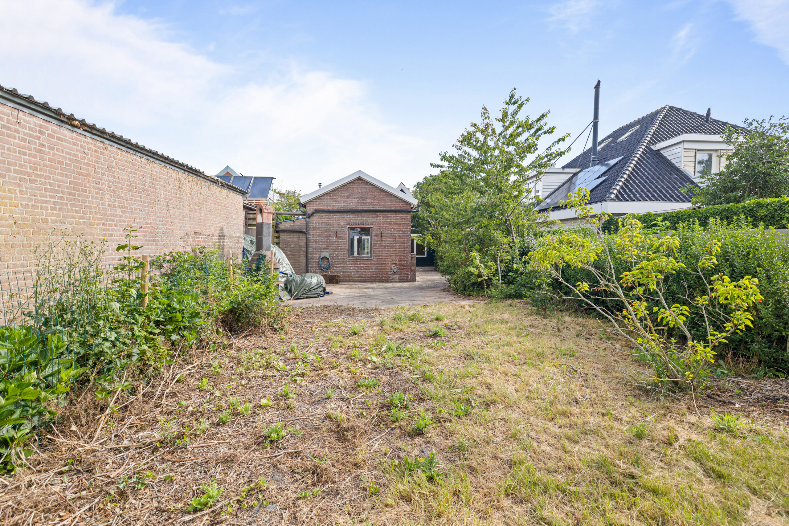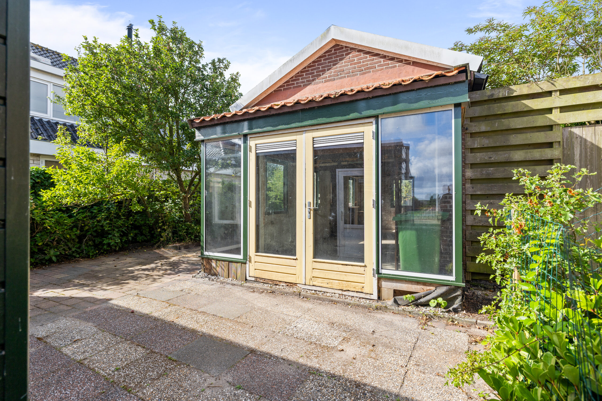 De woning beschikt over een rondom gelegen tuin met veel privacy. In de tuin bevindt zich een ruime berging met vliering, die wat onderhoud nodig heeft. De berging is voorzien van een eigen toilet.