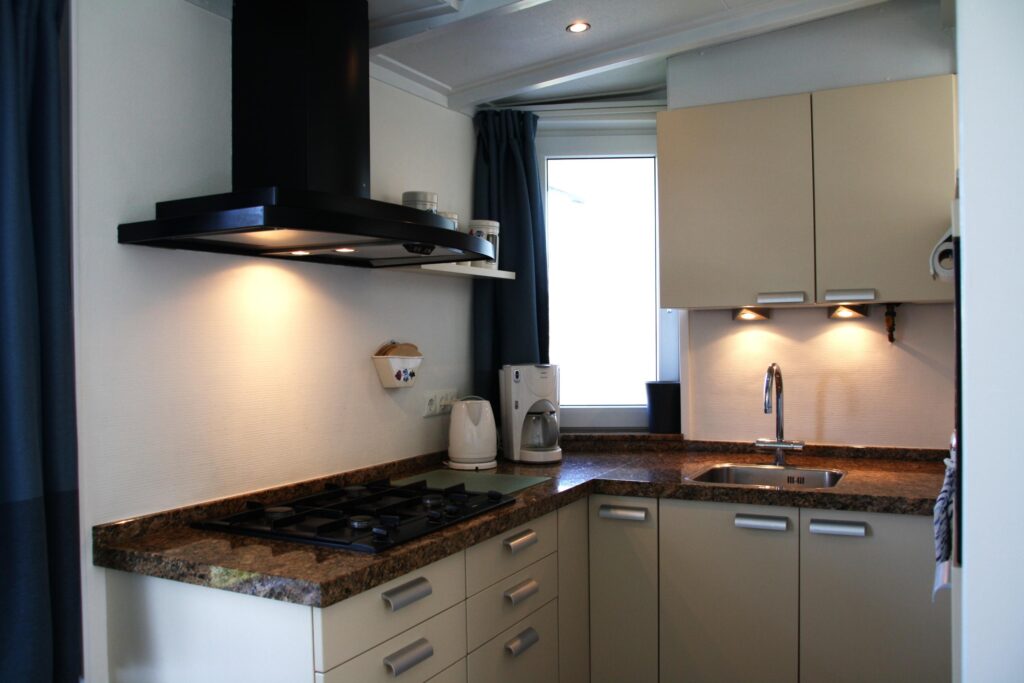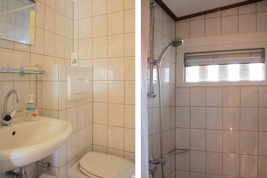 De bungalow heeft een badkamer op de begane grond, uitgerust met toilet, douche en wastafel.