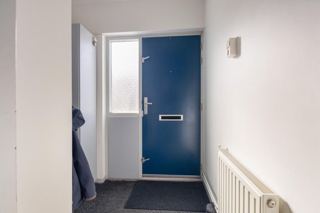 Overloop met toegang tot drie ruime slaapkamers, allen voorzien van radiatoren en vaste kasten. De badkamer is volledig betegeld en uitgerust met een douchecabine, wastafelmeubel en een opstelling voor witgoed.