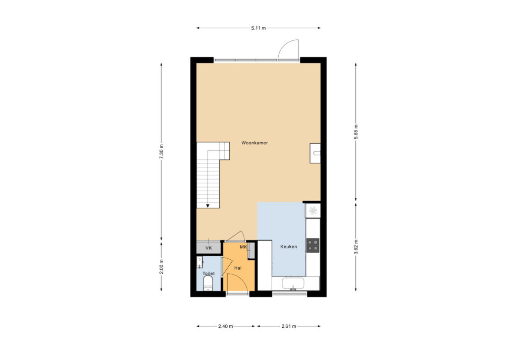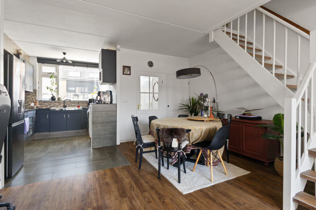 Entree via de voordeur. Hal met meterkast (7 groepen + aardlekschakelaar), toiletruimte met fonteintje. Ruime, lichte woonkamer met houtkachel. De open keuken aan de voorzijde is voorzien van inbouwapparatuur: 5-pits gaskookplaat, oven, afzuigkap, vaatwasser en wasmachine-aansluiting. In de woonkamer bevindt zich de trapopgang naar de eerste verdieping. Via de achterdeur bereikt u de diepe achtertuin van ca. 12 meter. De tuin is onderhoudsvriendelijk aangelegd en beschikt over een vrijstaande berging, een brede poort naar de parkeerplaatsen en een zijpoort naar de speeltuin.