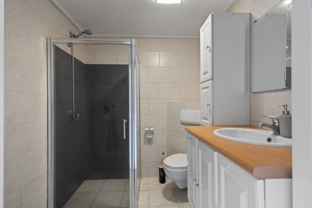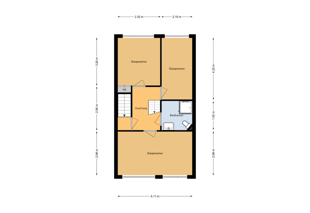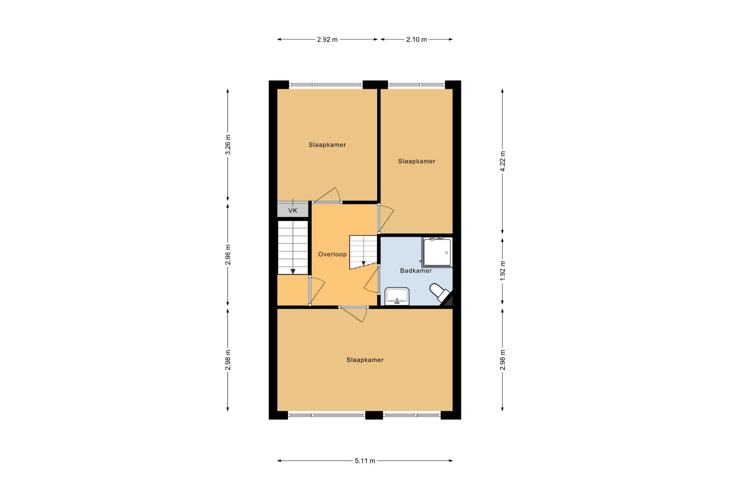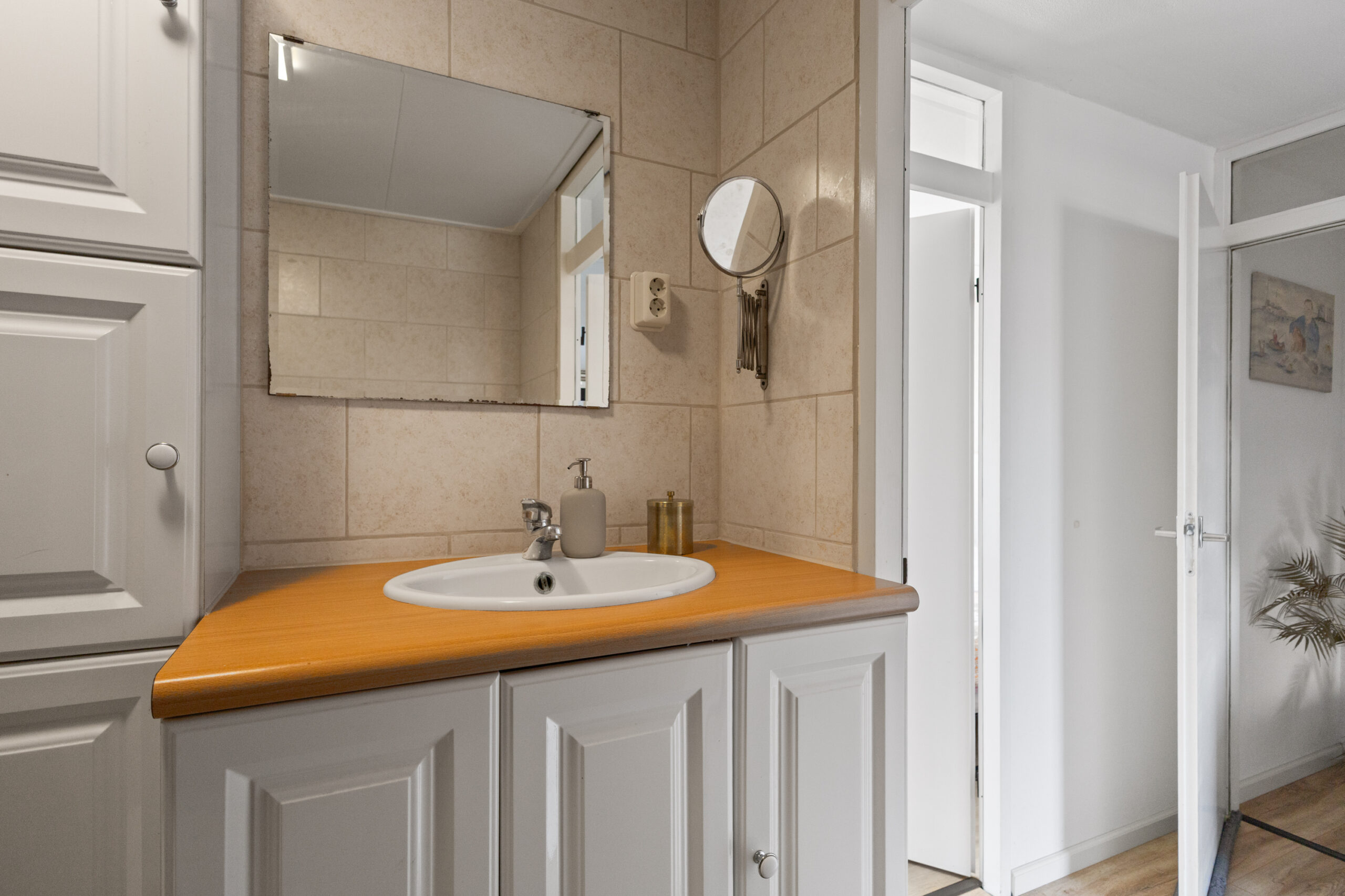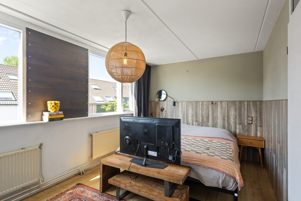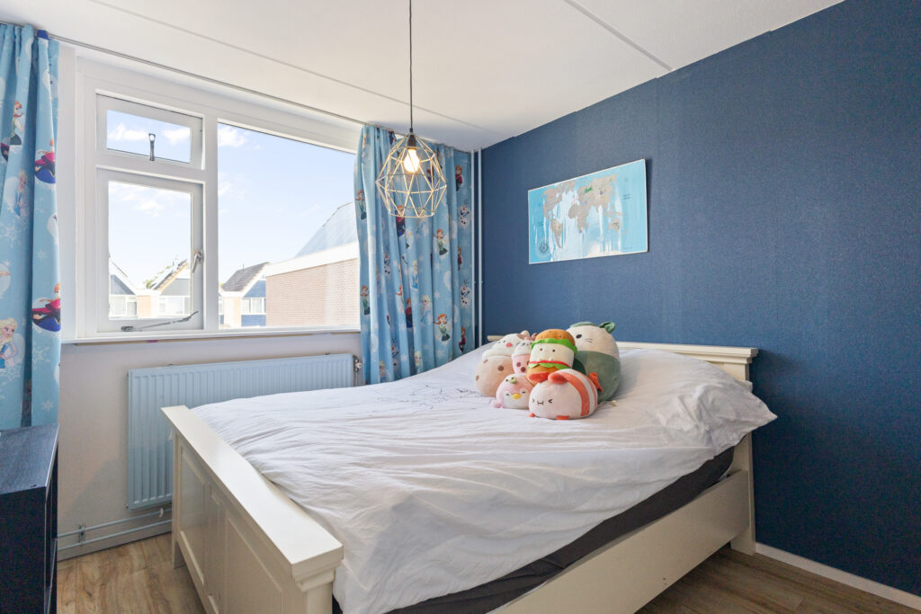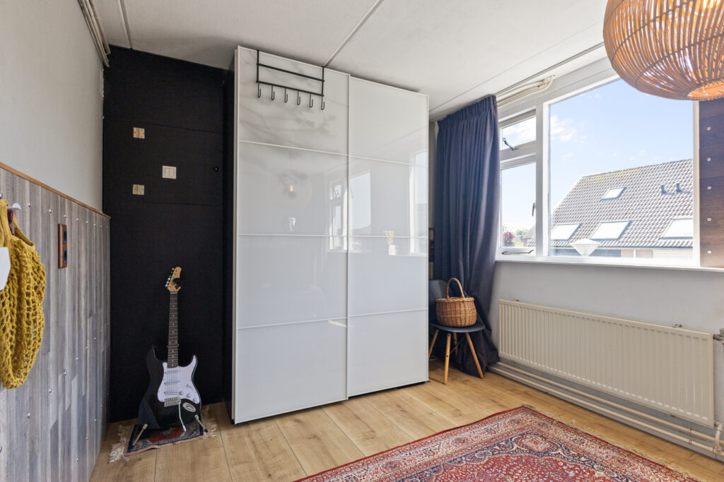 Overloop met toegang tot drie slaapkamers, waarvan één aan de voorzijde met vaste kast. Aan de achterzijde bevinden zich nog twee slaapkamers van goed formaat. De badkamer is voorzien van een douche, tweede toilet en wastafelmeubel. Alle ruimtes zijn praktisch ingedeeld en voorzien van veel lichtinval.