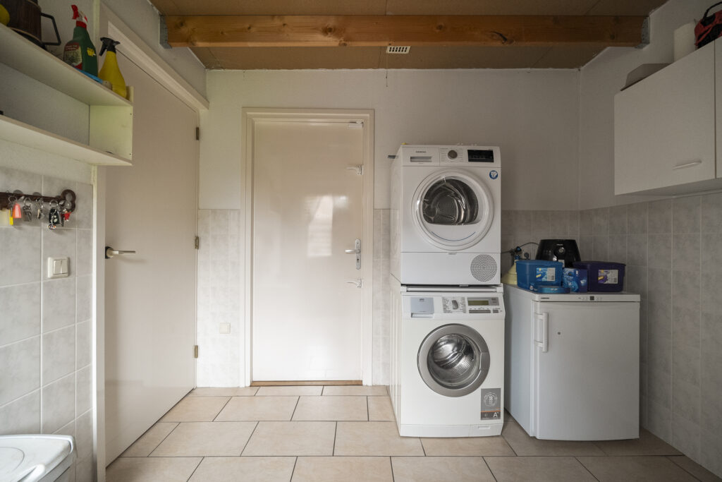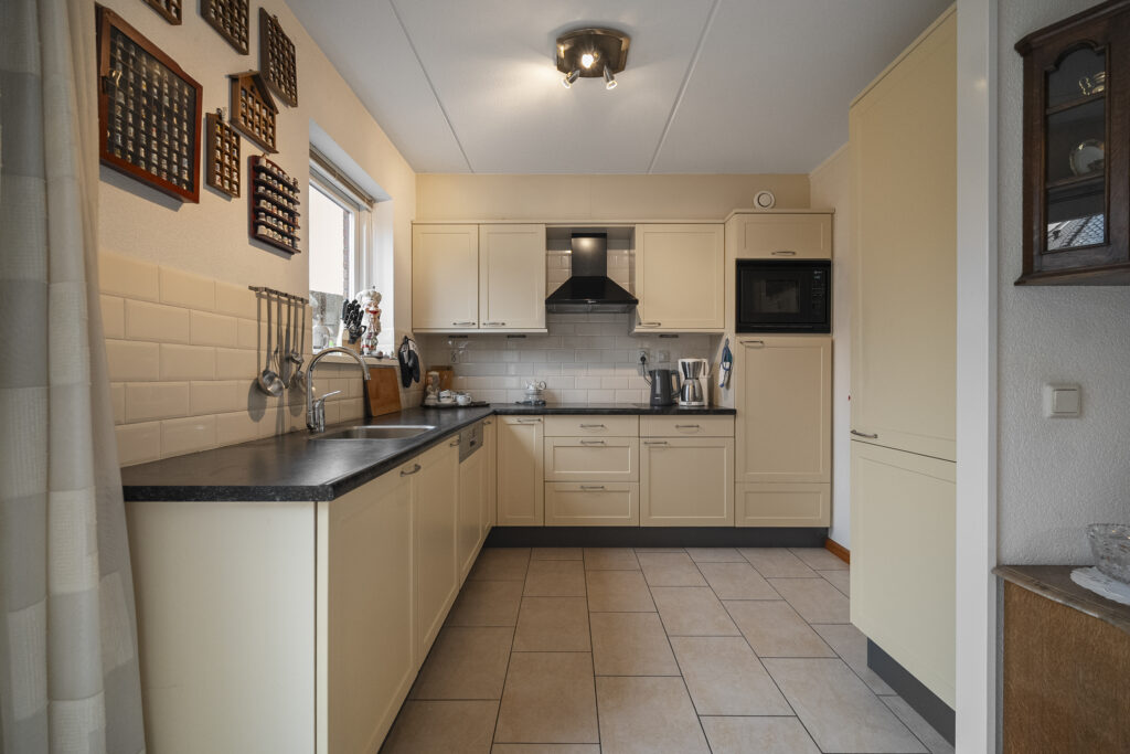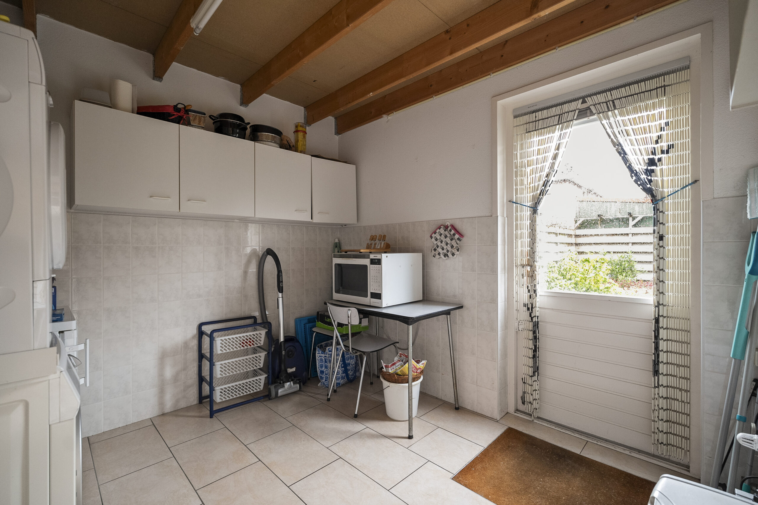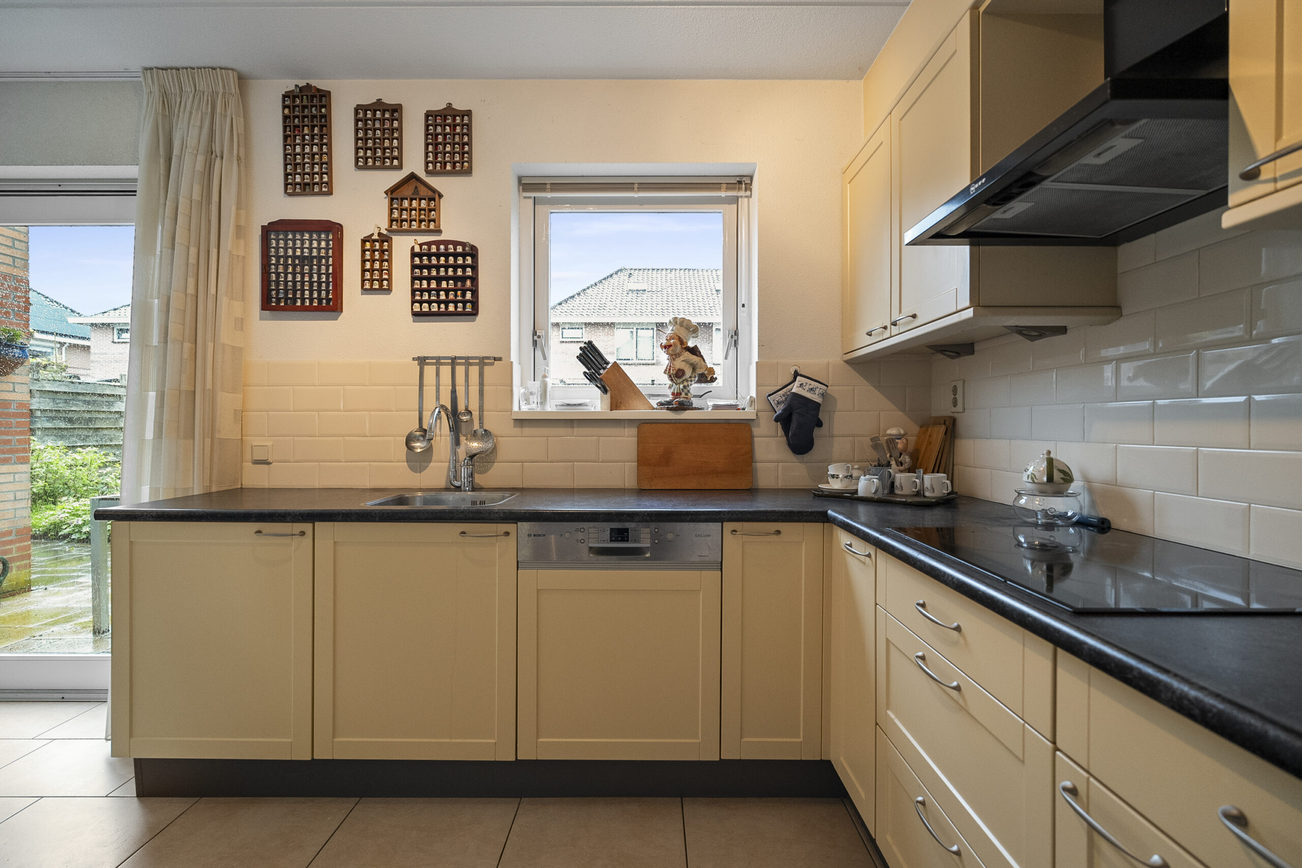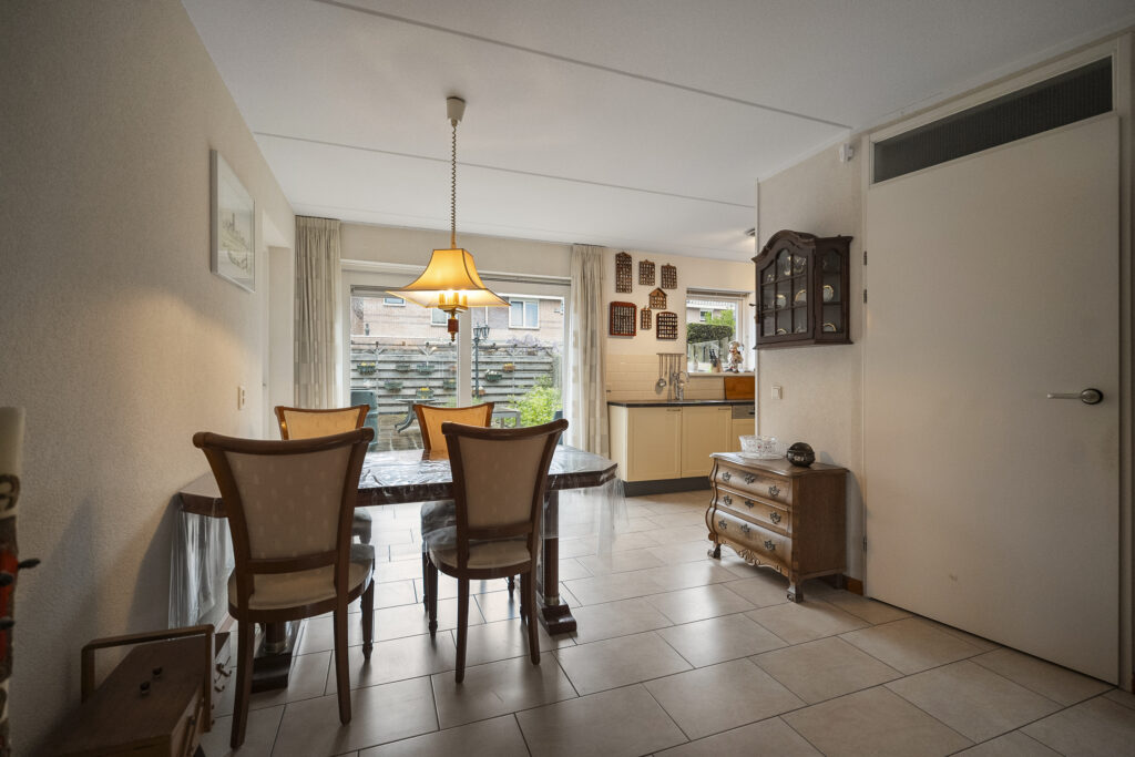 De entree is aan de voorzijde in een kleine hal waarna u direct in de ruime woonkamer uitkomt met een straatgerichte zithoek. De eethoek en keuken zijn tuingericht en middels een kamerbrede schuifpui loopt u ook zo de achtertuin in. Deze grote raampartij zorgt, net als de grote ramen aan de voorzijde, voor veel natuurlijk licht. Het geheel is netjes afgewerkt en goed onderhouden. Vanuit de keuken is er nog een bijkeuken met ruimte voor extra keukenapparatuur en de wasmachine/droger. Van hieruit loopt u binnendoor de garage in.