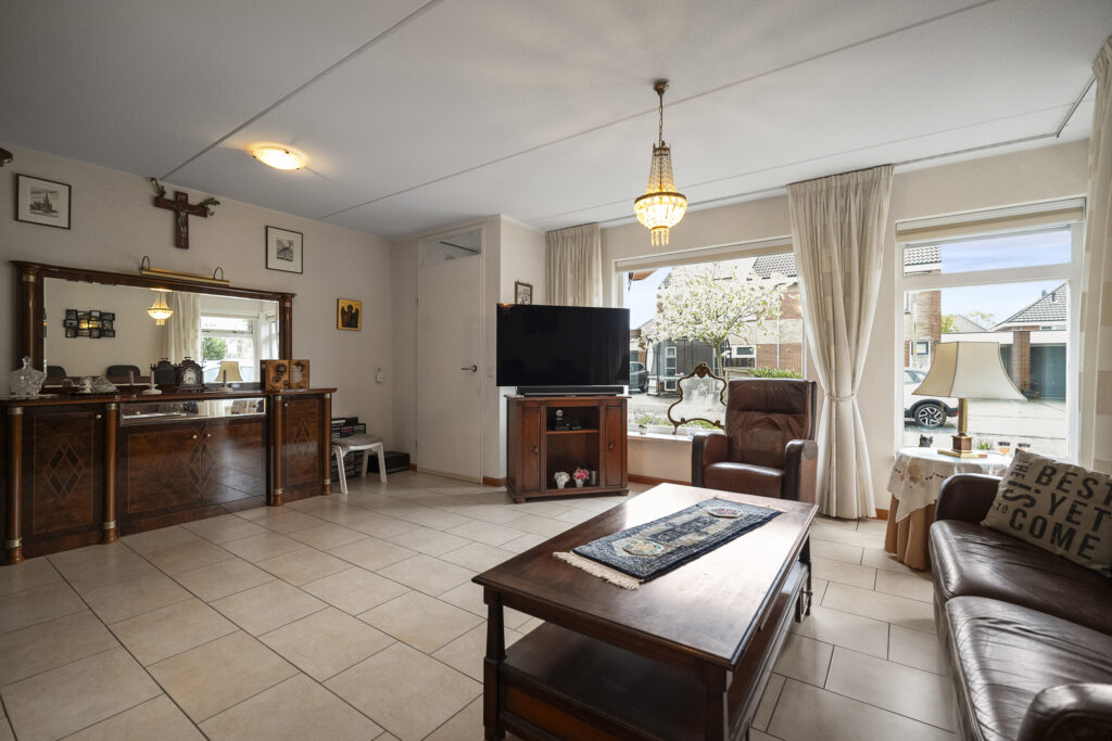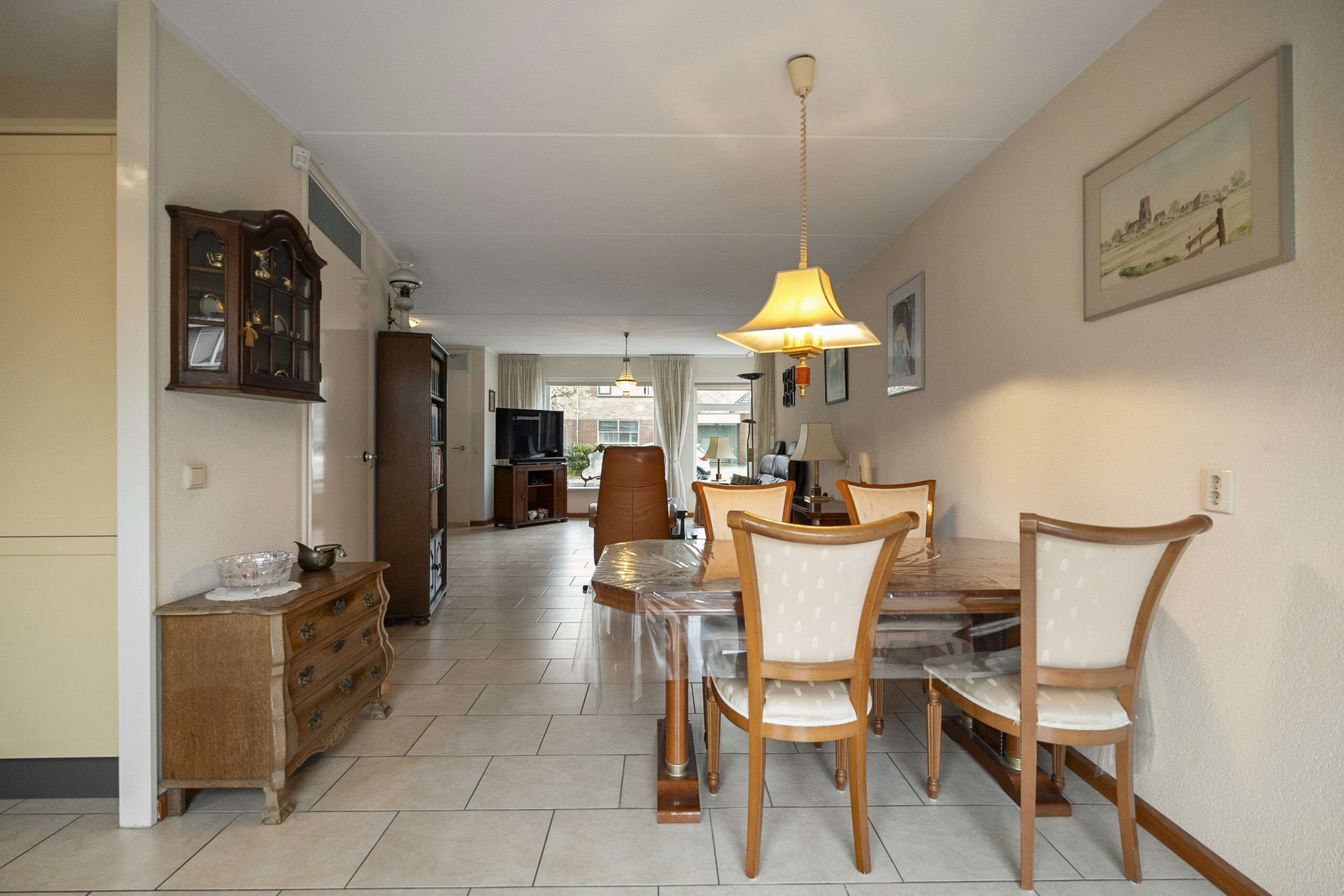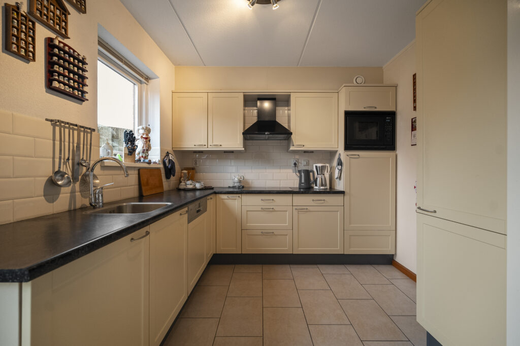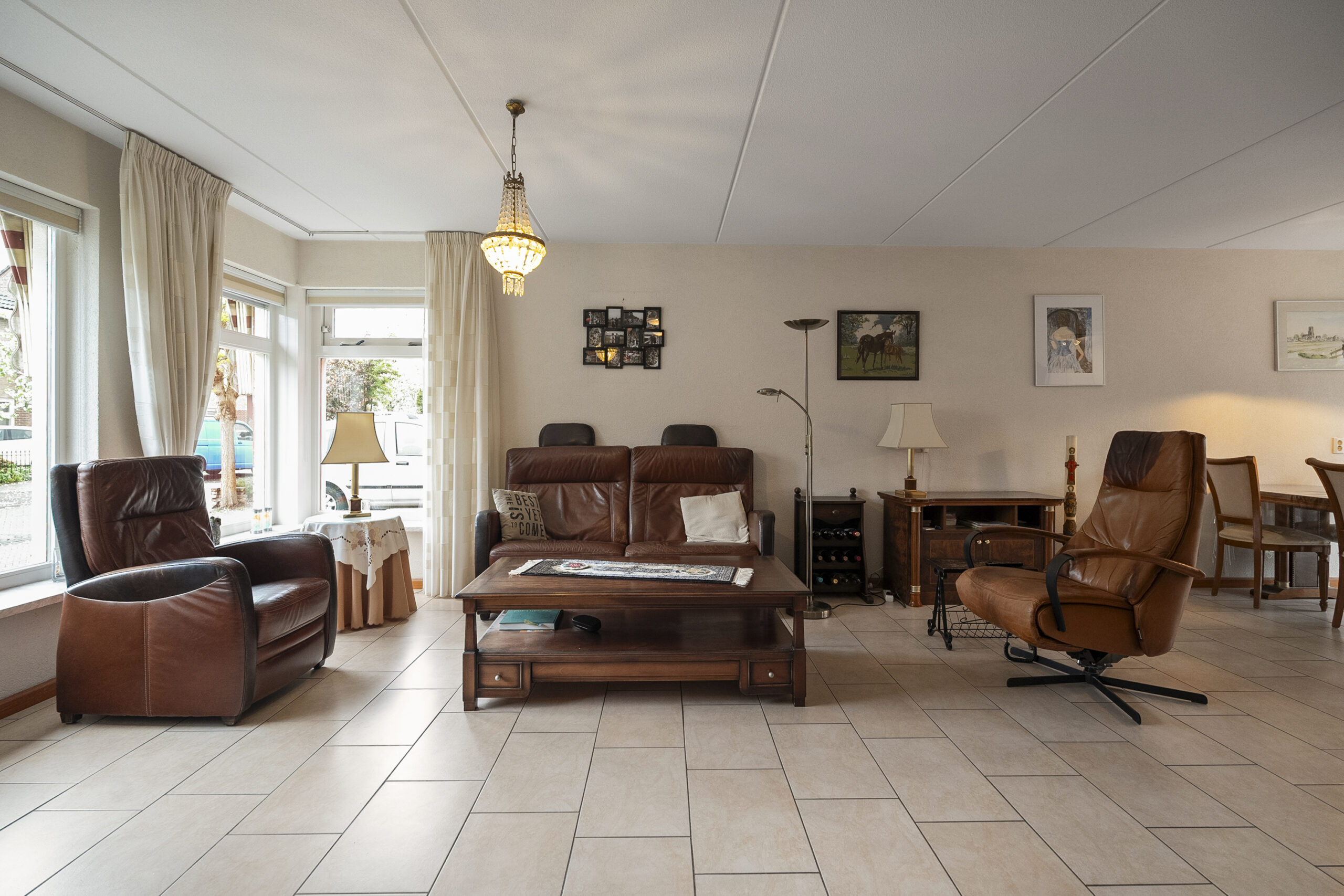 De entree is aan de voorzijde in een kleine hal waarna u direct in de ruime woonkamer uitkomt met een straatgerichte zithoek. De eethoek en keuken zijn tuingericht en middels een kamerbrede schuifpui loopt u ook zo de achtertuin in. Deze grote raampartij zorgt, net als de grote ramen aan de voorzijde, voor veel natuurlijk licht. Het geheel is netjes afgewerkt en goed onderhouden. Vanuit de keuken is er nog een bijkeuken met ruimte voor extra keukenapparatuur en de wasmachine/droger. Van hieruit loopt u binnendoor de garage in.