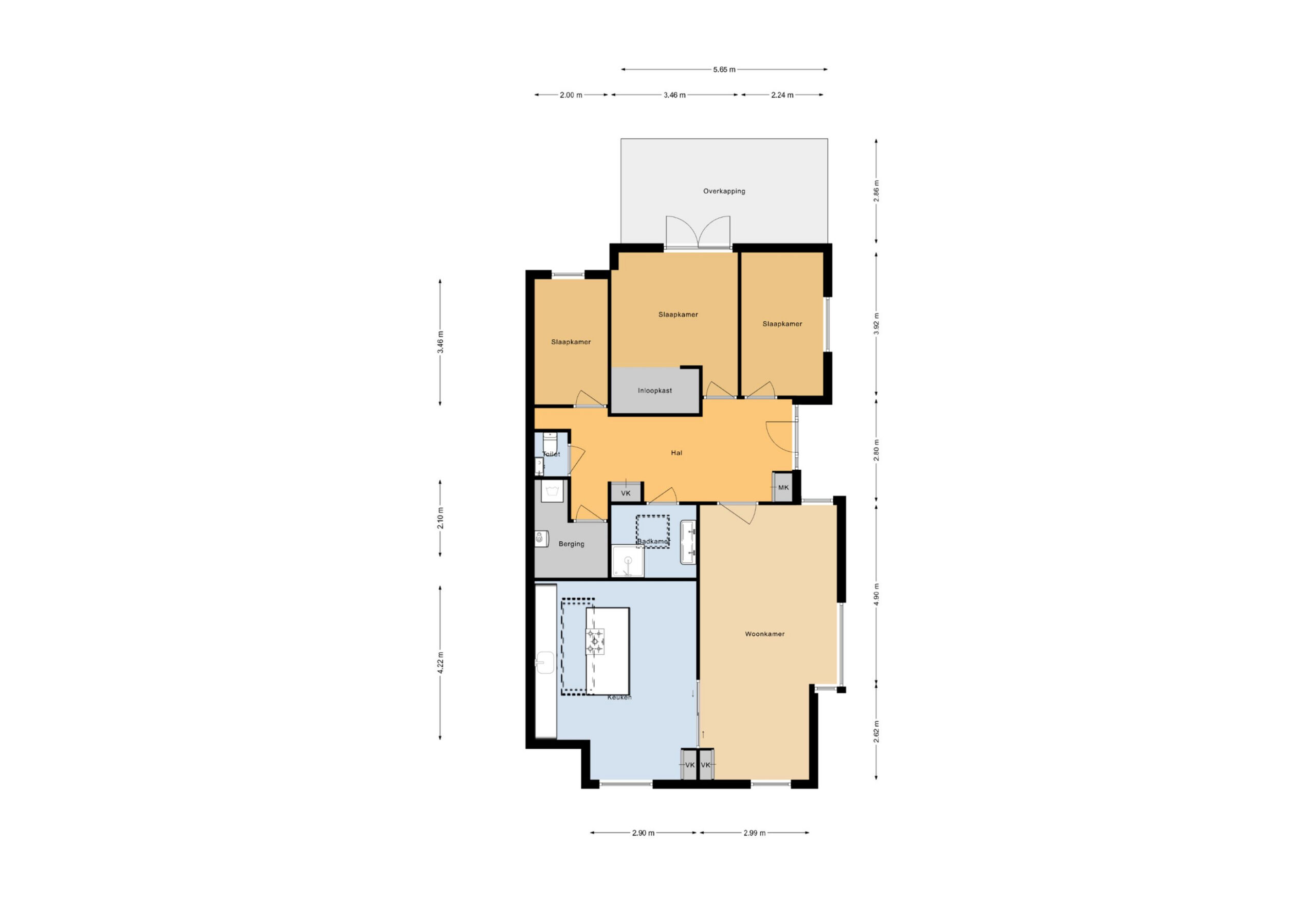 Het woongedeelte op de begane grond bestaat uit een ruime woonkamer en een open keuken, beiden gerenoveerd in 2022. De bungalow biedt drie slaapkamers, wat het huis ideaal maakt voor senioren, alleenstaanden en stellen. De luxe moderne badkamer en toiletruimte maken het plaatje compleet. Vanuit de gang is een behoorlijk grote kelder bereikbaar, ideaal voor het opslaan van wijn, groente en/of fruit.